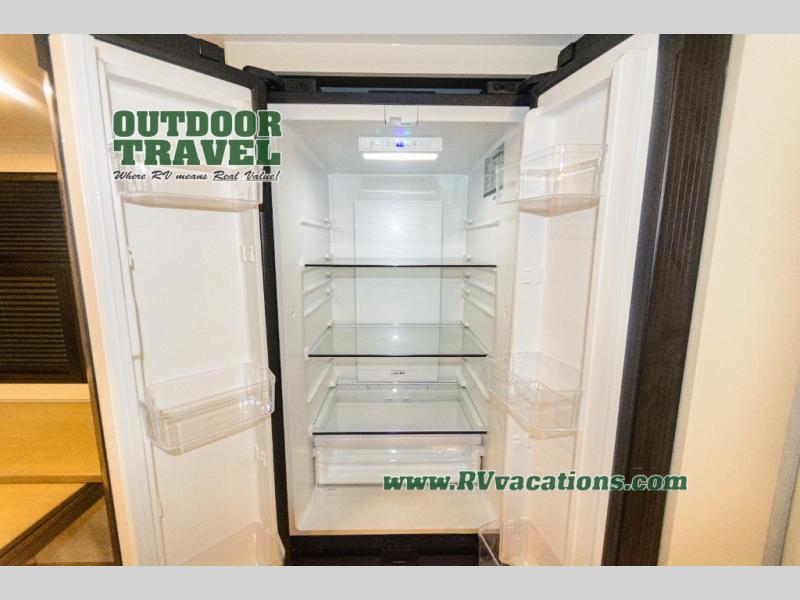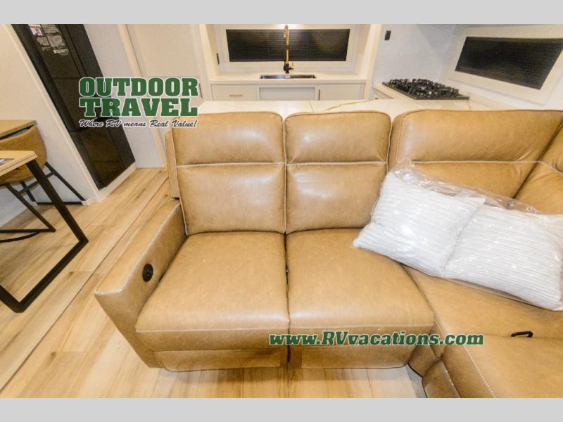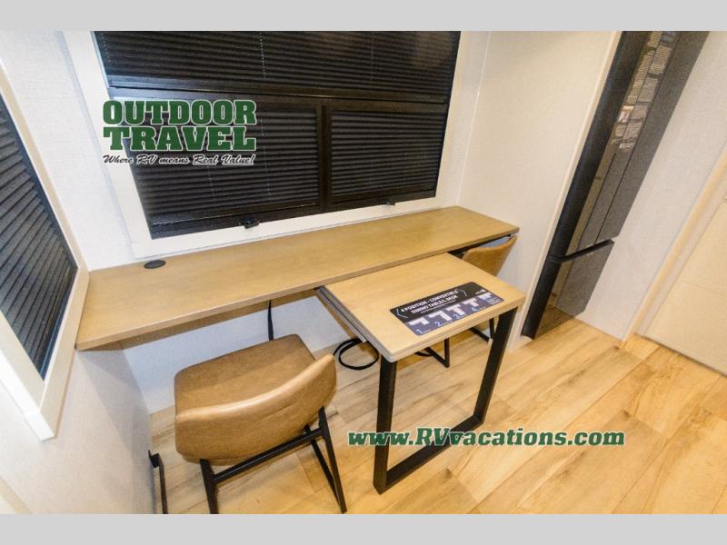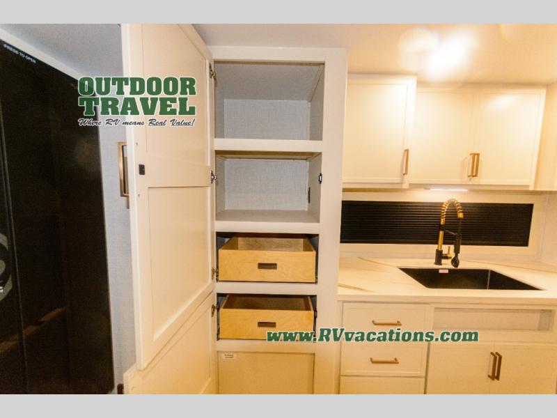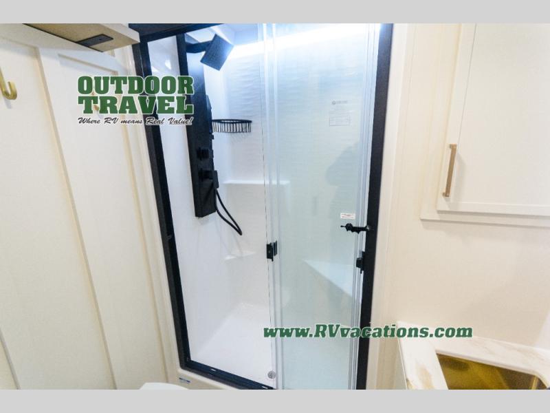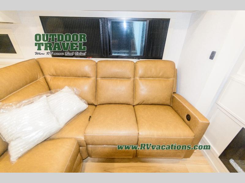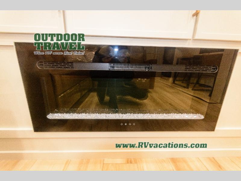 Savor the joy of cooking and sharing meals with loved ones in this beautifully appointed kitchen! This rear kitchen features a spacious pantry with drawers and outlets, a 30" convection microwave, a flip-up counter, and a 12V refrigerator. The convertible dining table and L-desk create a refined space for meals, work, and relaxation. The adjacent L-sofa forms a cozy sanctuary for reading, socializing, or enjoying the entertainment center and fireplace. There is a full bathroom with everything you need to keep your personal hygiene on the road. Plus, the front bedroom’s peaceful haven features a plush king bed, nightstands with storage, and a MaxSpace split-level wardrobe. Additionally, the two exterior awnings create a spacious outdoor living area, ideal for relaxing, entertaining, or enjoying the great outdoors.