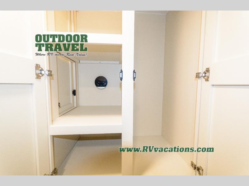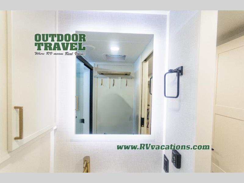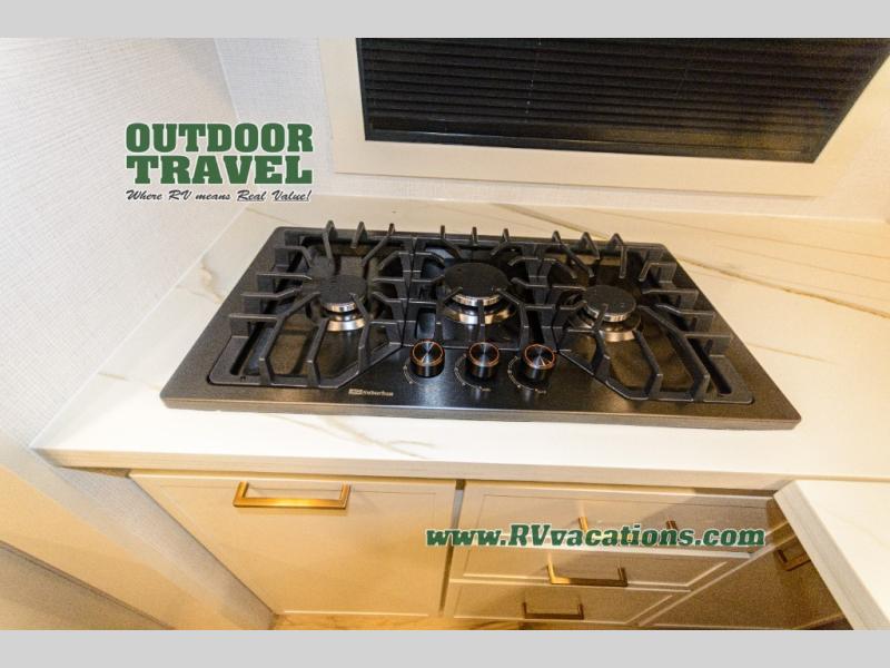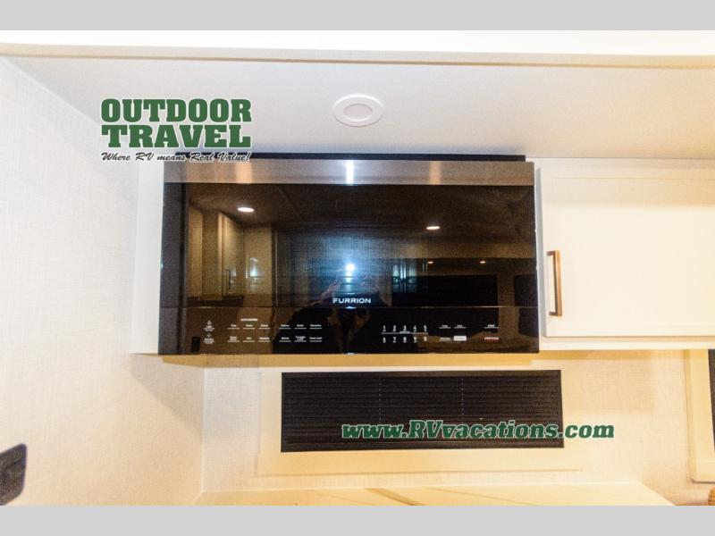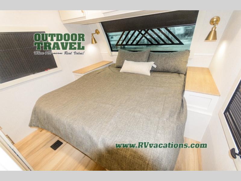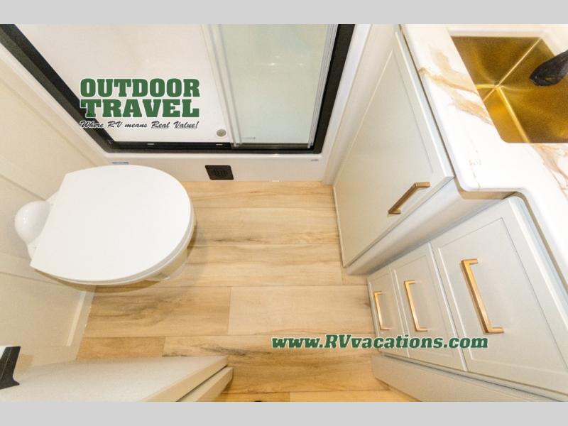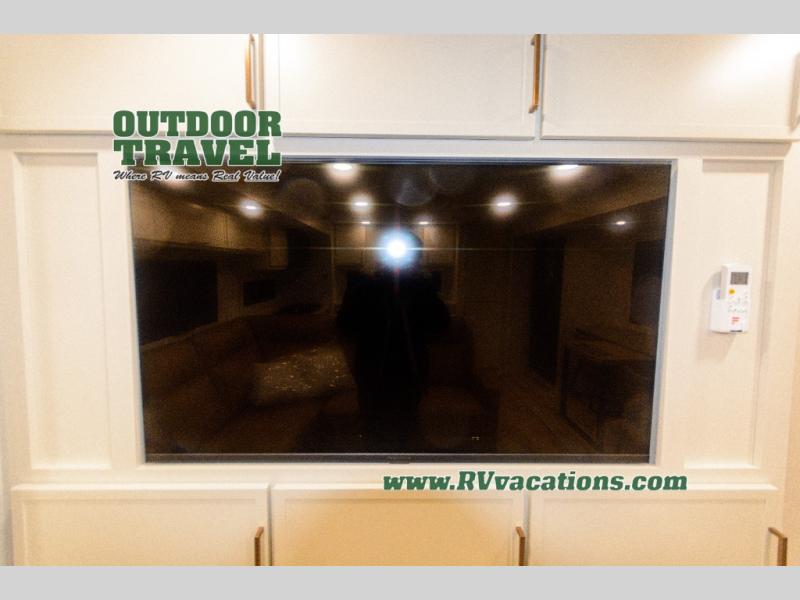 Savor the joy of cooking and sharing meals with loved ones in this beautifully appointed kitchen! This rear kitchen features a spacious pantry with drawers and outlets, a 30" convection microwave, a flip-up counter, and a 12V refrigerator. The convertible dining table and L-desk create a refined space for meals, work, and relaxation. The adjacent L-sofa forms a cozy sanctuary for reading, socializing, or enjoying the entertainment center and fireplace. There is a full bathroom with everything you need to keep your personal hygiene on the road. Plus, the front bedroom’s peaceful haven features a plush king bed, nightstands with storage, and a MaxSpace split-level wardrobe. Additionally, the two exterior awnings create a spacious outdoor living area, ideal for relaxing, entertaining, or enjoying the great outdoors.