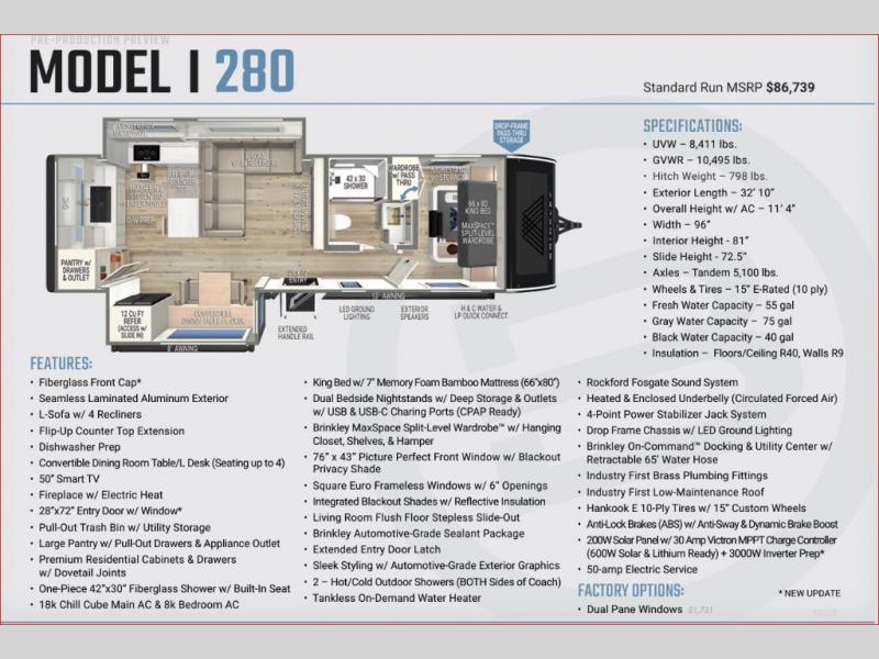 Due to manufacturer policy, we’re unable to publicly advertise prices below the M.S.R.P. on current model year Brinkley RVs. For our best available pricing, please call, text, or email our team — we’ll be happy to provide a personalized quote!