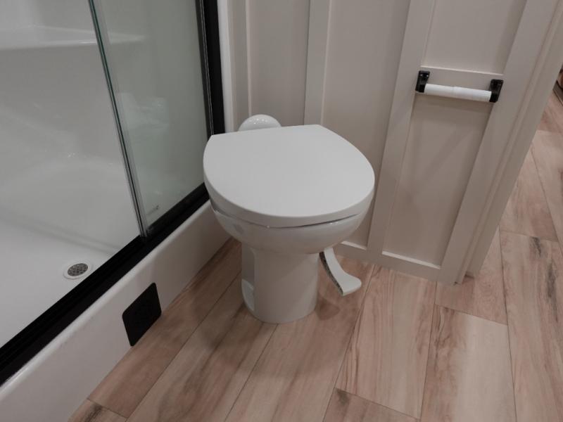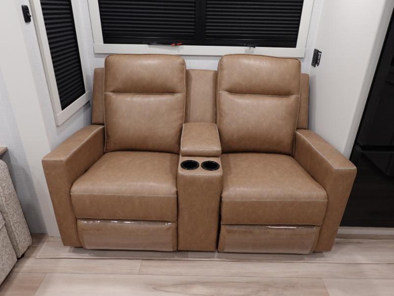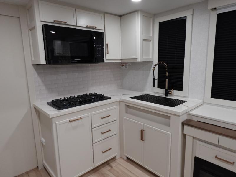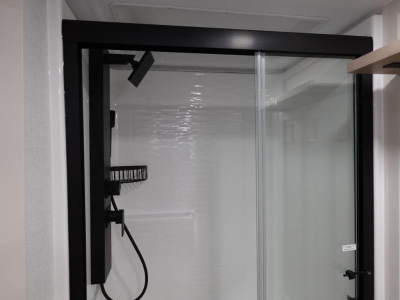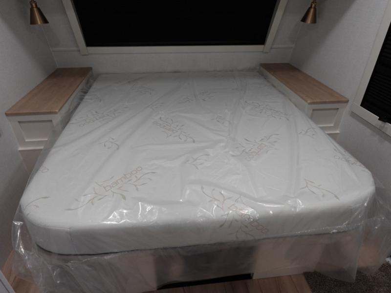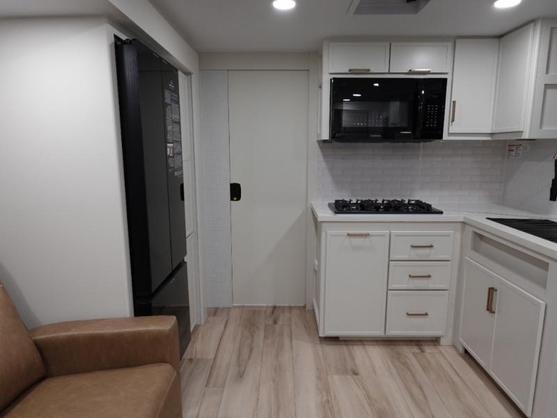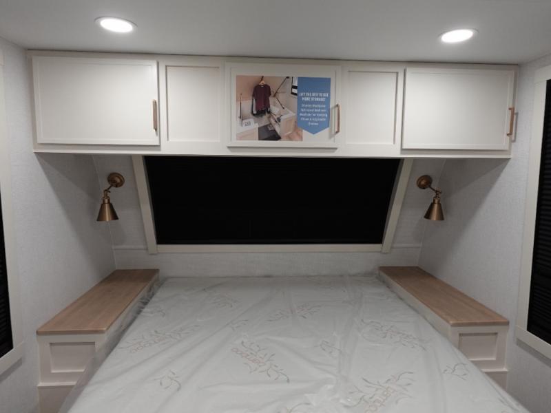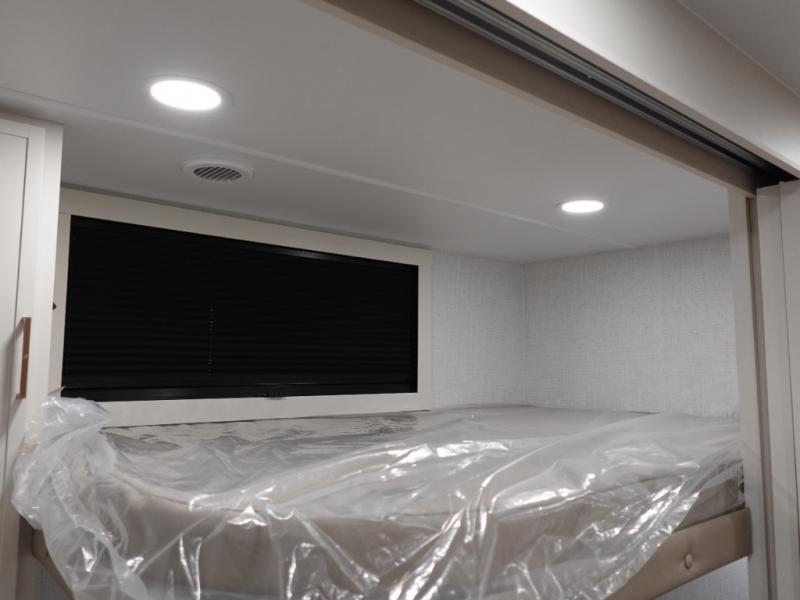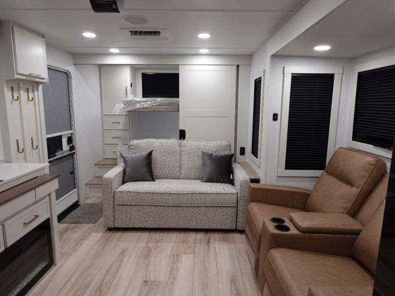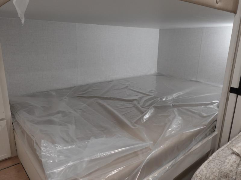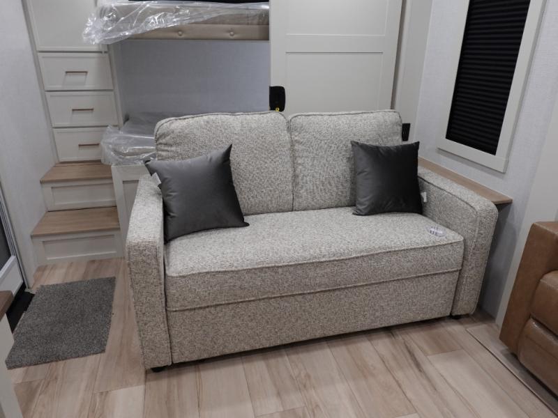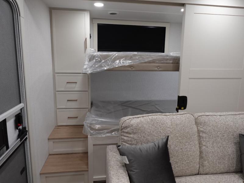 Grab the whole gang and head to the campground in this bunkhouse travel trailer! The 48" x 74" bunks can sleep two to four, and there is a floor to ceiling storage cabinet with drawers, a top bunk window, outlets and USB ports, plus double space-saving pocket doors. Up front you'll find the master bedroom with a 66" x 80" king bed and a MaxSpace Split-Level Wardrobe, TV prep, your own exterior entry door, plus quick access to the walk-thru bath. Everyone can meet in the combined kitchen and living room to relax on the theater seating or tri-fold sofa, and there is pull-out dining table with a drawer and a window above for great outdoor views. The outside is just as accommodating as the inside with its exterior speakers, LED chassis lighting, rear storage compartment with dual access doors, and exterior 12V refrigerator for cold drinks!