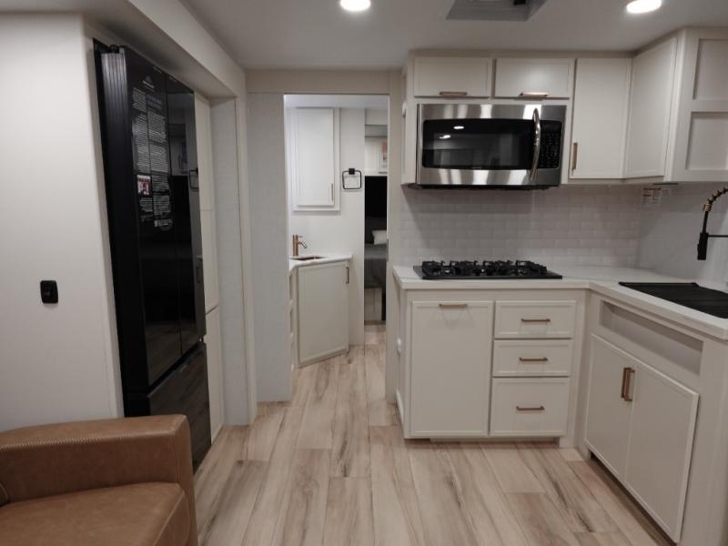 Grab the whole gang and head to the campground in this bunkhouse travel trailer! The 48" x 74" bunks can sleep two to four, and there is a floor to ceiling storage cabinet with drawers, a top bunk window, outlets and USB ports, plus double space-saving pocket doors. Up front you'll find the master bedroom with a 66" x 80" king bed and a MaxSpace Split-Level Wardrobe, TV prep, your own exterior entry door, plus quick access to the walk-thru bath. Everyone can meet in the combined kitchen and living room to relax on the theater seating or tri-fold sofa, and there is pull-out dining table with a drawer and a window above for great outdoor views. The outside is just as accommodating as the inside with its exterior speakers, LED chassis lighting, rear storage compartment with dual access doors, and exterior 12V refrigerator for cold drinks!