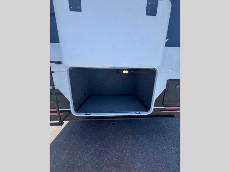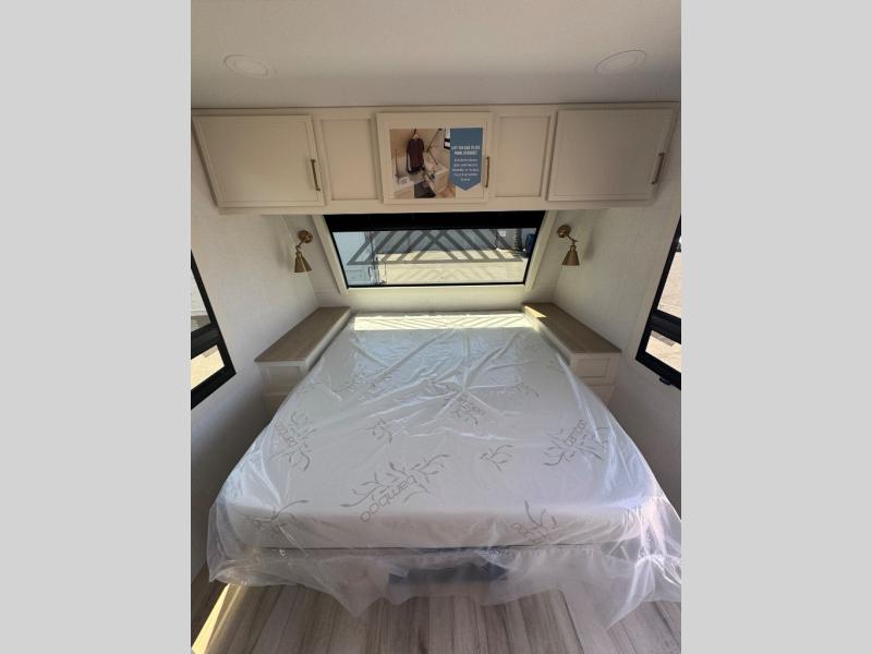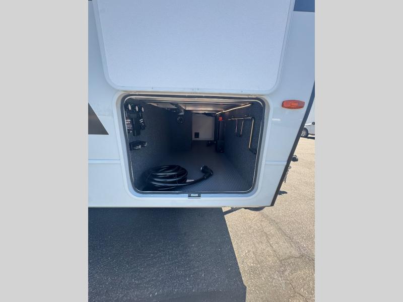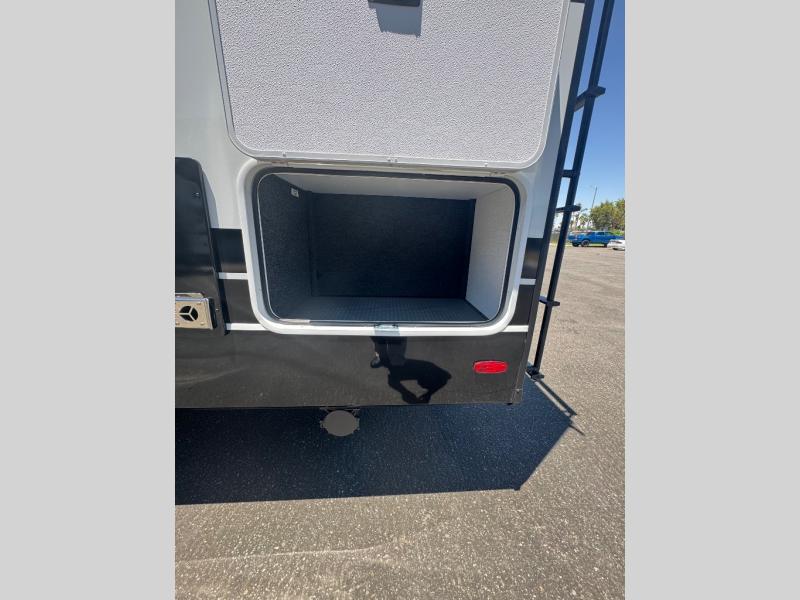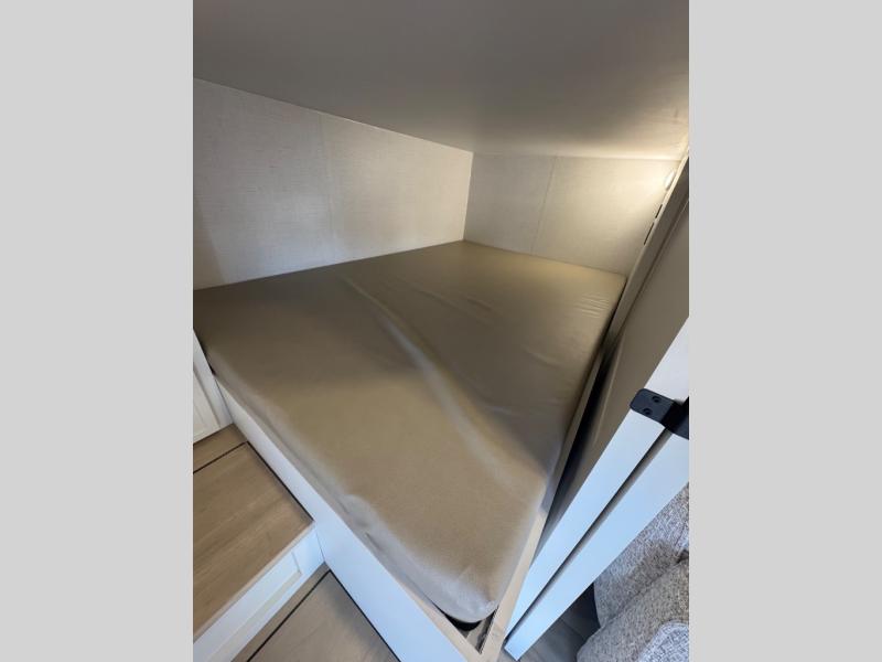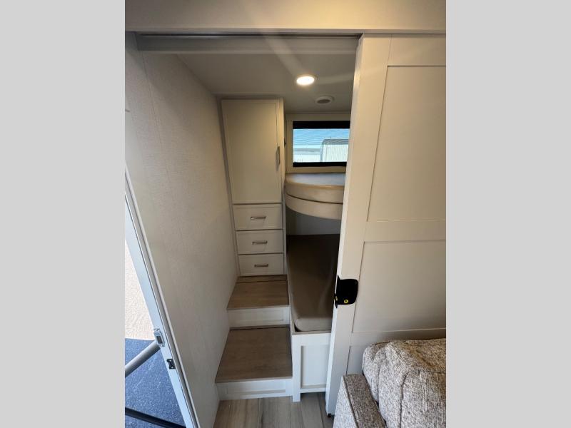 Grab the whole gang and head to the campground in this bunkhouse travel trailer! The 48" x 74" bunks can sleep two to four, and there is a floor to ceiling storage cabinet with drawers, a top bunk window, outlets and USB ports, plus double space-saving pocket doors. Up front you'll find the master bedroom with a 66" x 80" king bed and a MaxSpace Split-Level Wardrobe, TV prep, your own exterior entry door, plus quick access to the walk-thru bath. Everyone can meet in the combined kitchen and living room to relax on the theater seating or tri-fold sofa, and there is pull-out dining table with a drawer and a window above for great outdoor views. The outside is just as accommodating as the inside with its exterior speakers, LED chassis lighting, rear storage compartment with dual access doors, and exterior 12V refrigerator for cold drinks!