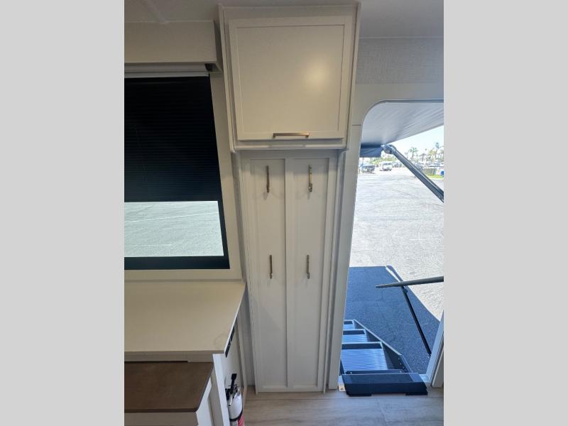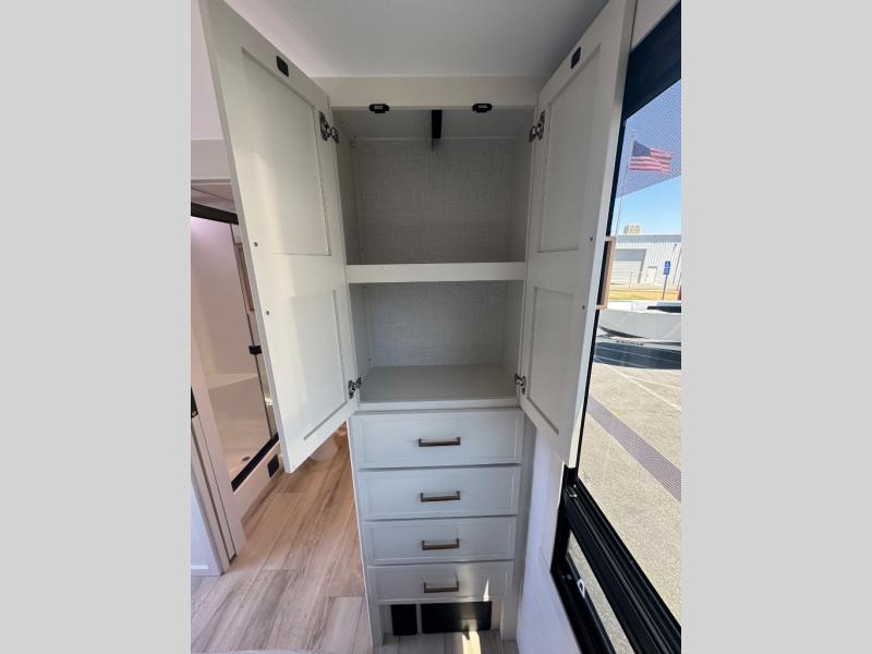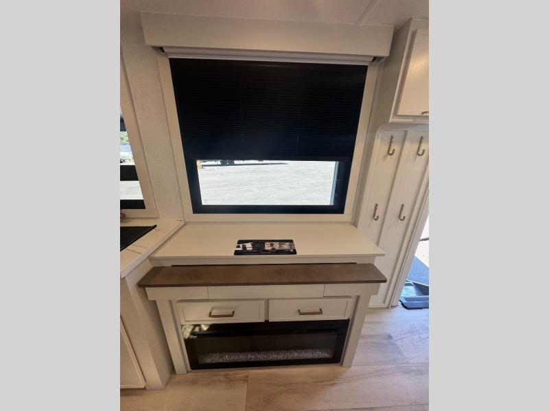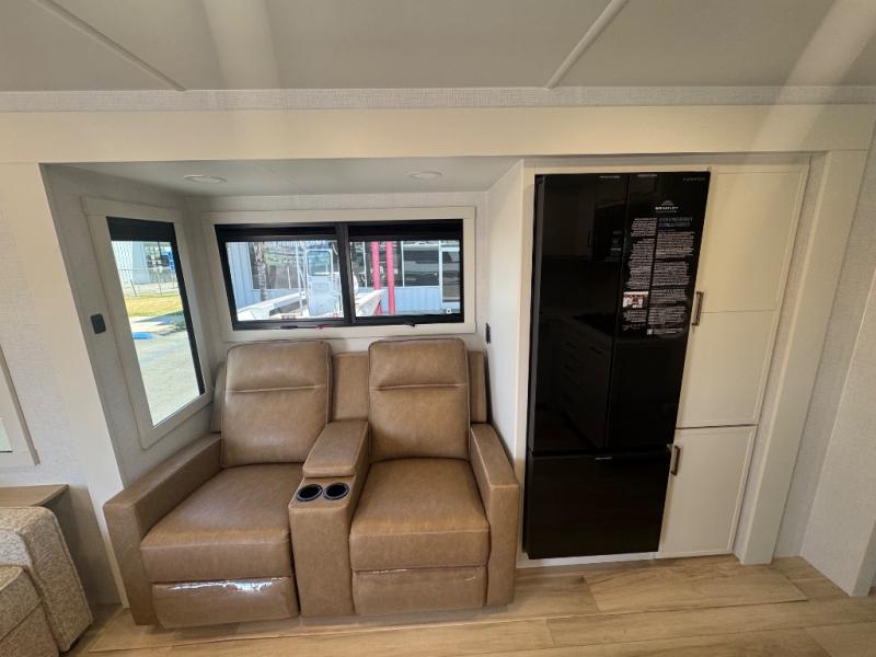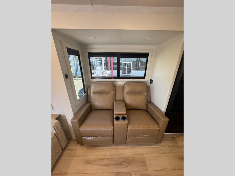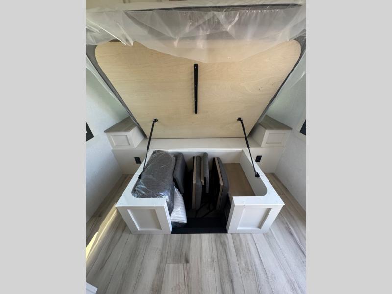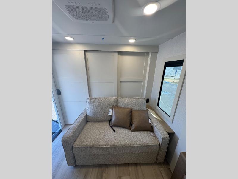 Grab the whole gang and head to the campground in this bunkhouse travel trailer! The 48" x 74" bunks can sleep two to four, and there is a floor to ceiling storage cabinet with drawers, a top bunk window, outlets and USB ports, plus double space-saving pocket doors. Up front you'll find the master bedroom with a 66" x 80" king bed and a MaxSpace Split-Level Wardrobe, TV prep, your own exterior entry door, plus quick access to the walk-thru bath. Everyone can meet in the combined kitchen and living room to relax on the theater seating or tri-fold sofa, and there is pull-out dining table with a drawer and a window above for great outdoor views. The outside is just as accommodating as the inside with its exterior speakers, LED chassis lighting, rear storage compartment with dual access doors, and exterior 12V refrigerator for cold drinks!