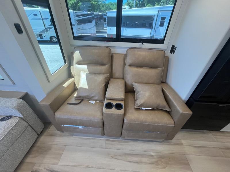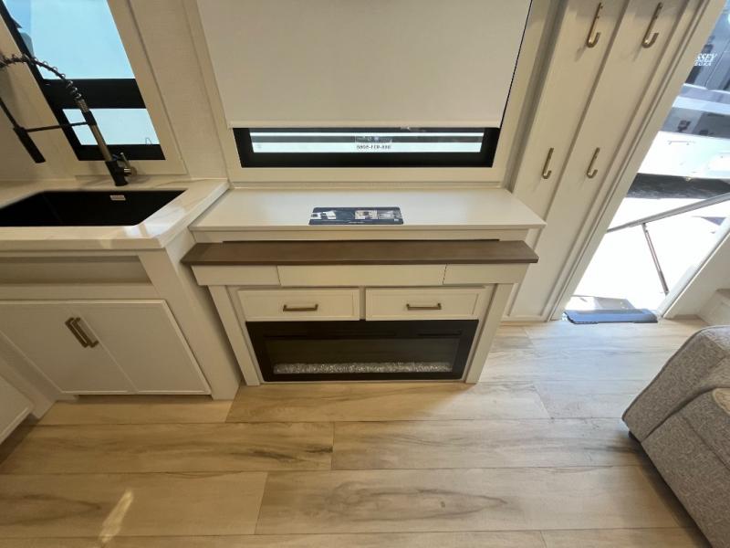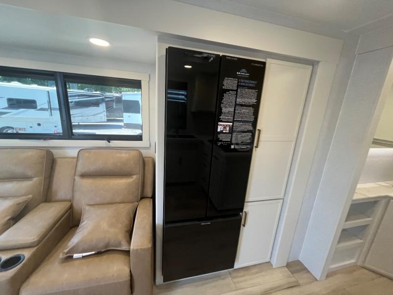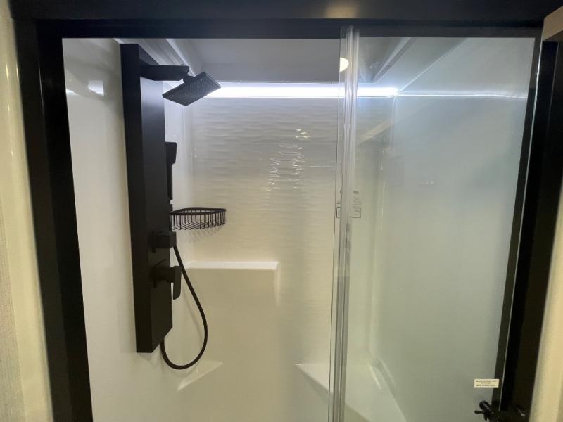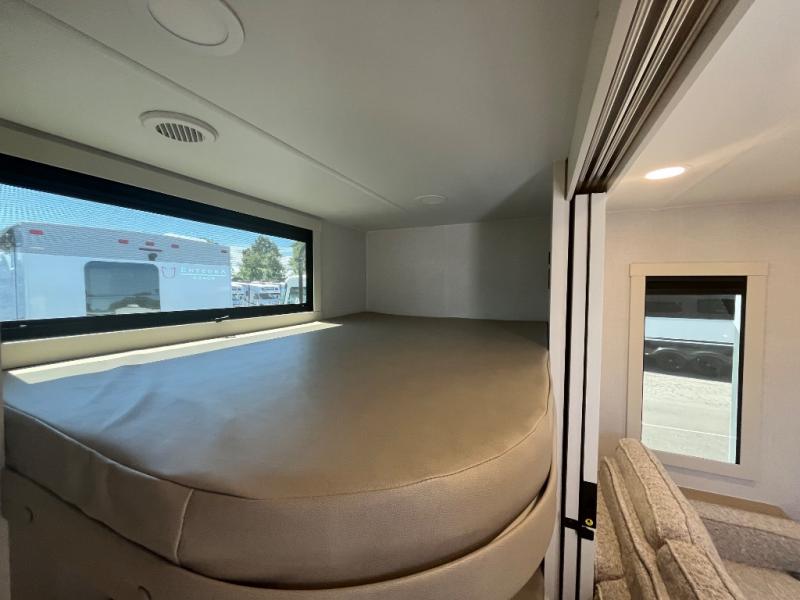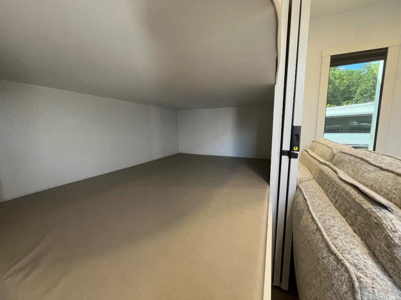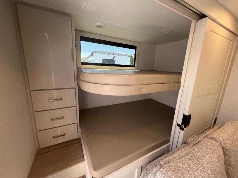 Grab the whole gang and head to the campground in this bunkhouse travel trailer! The 48" x 74" bunks can sleep two to four, and there is a floor to ceiling storage cabinet with drawers, a top bunk window, outlets and USB ports, plus double space-saving pocket doors. Up front you'll find the master bedroom with a 66" x 80" king bed and a MaxSpace Split-Level Wardrobe, TV prep, your own exterior entry door, plus quick access to the walk-thru bath. Everyone can meet in the combined kitchen and living room to relax on the theater seating or tri-fold sofa, and there is pull-out dining table with a drawer and a window above for great outdoor views. The outside is just as accommodating as the inside with its exterior speakers, LED chassis lighting, rear storage compartment with dual access doors, and exterior 12V refrigerator for cold drinks!