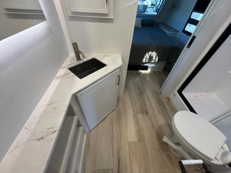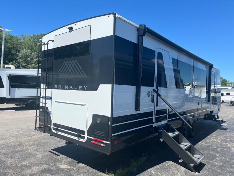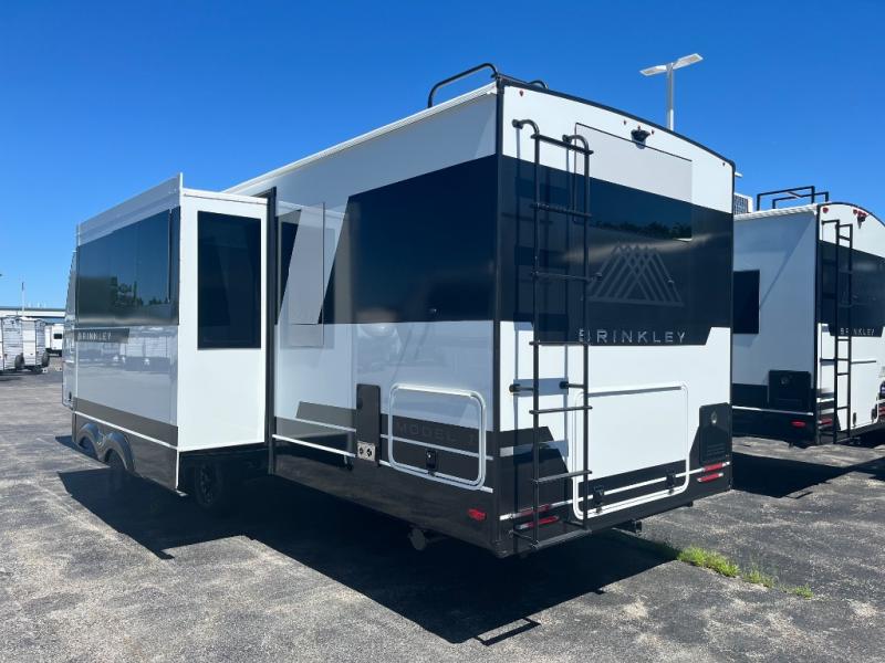 The lightweight Model I travel trailer by Brinkley is the perfect choice for those looking for an easy tow and at-home comforts! There is a drop-frame chassis, high-performance Road Armor suspension equalizer system, and Demco EZ Latch trailer coupler that automatically latches when dropped onto a hitch ball without the need of a safety pin. Additional exterior features include square Euro frameless windows, automotive-grade paint, full-width LED strip lighting in the pass-thru, and a pet & property security campside tie-down to keep your gear and furry friends safe. Inside, you'll be wowed by Brinkley's CraftSense wood trim construction, residential solid surface kitchen countertops, dimmable bedroom lights, and marine-grade neon LED shower lighting to name a few stand-out features!