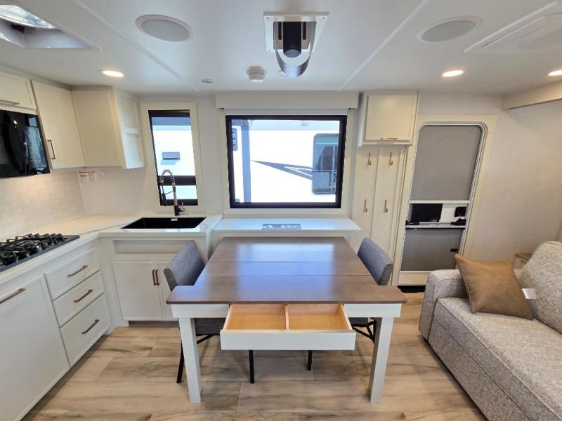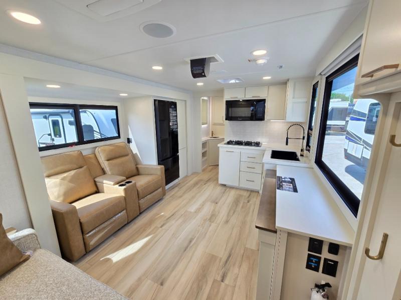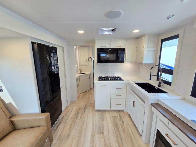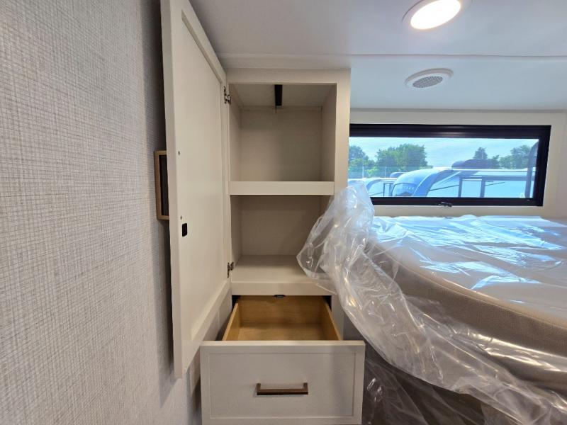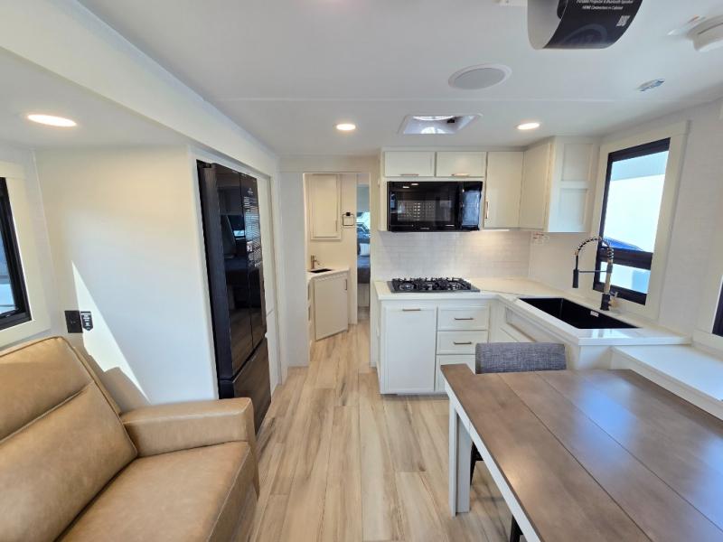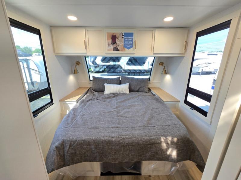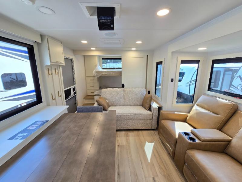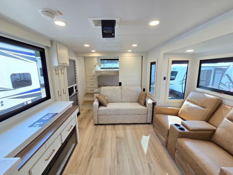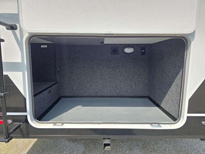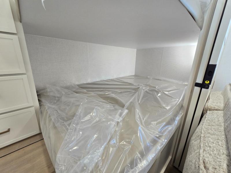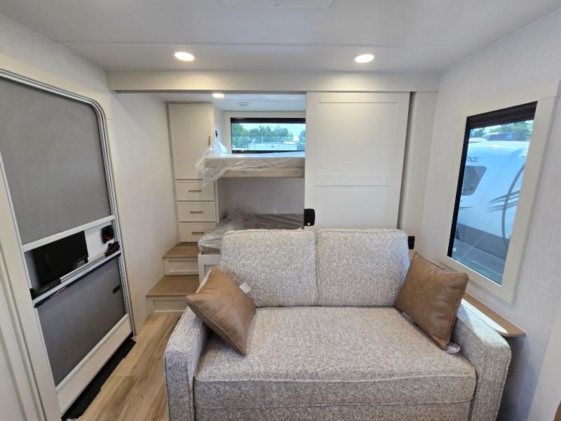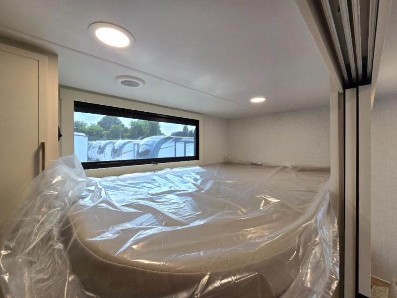 Grab the whole gang and head to the campground in this bunkhouse travel trailer! The 48" x 74" bunks can sleep two to four, and there is a floor to ceiling storage cabinet with drawers, a top bunk window, outlets and USB ports, plus double space-saving pocket doors. Up front you'll find the master bedroom with a 66" x 80" king bed and a MaxSpace Split-Level Wardrobe, TV prep, your own exterior entry door, plus quick access to the walk-thru bath. Everyone can meet in the combined kitchen and living room to relax on the theater seating or tri-fold sofa, and there is pull-out dining table with a drawer and a window above for great outdoor views. The outside is just as accommodating as the inside with its exterior speakers, LED chassis lighting, rear storage compartment with dual access doors, and exterior 12V refrigerator for cold drinks!