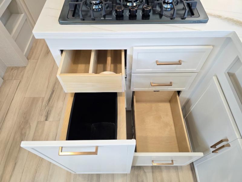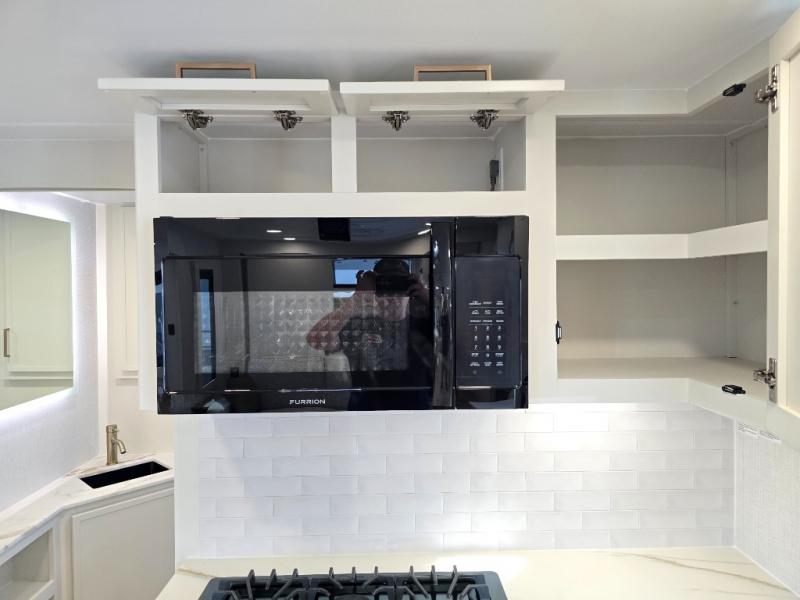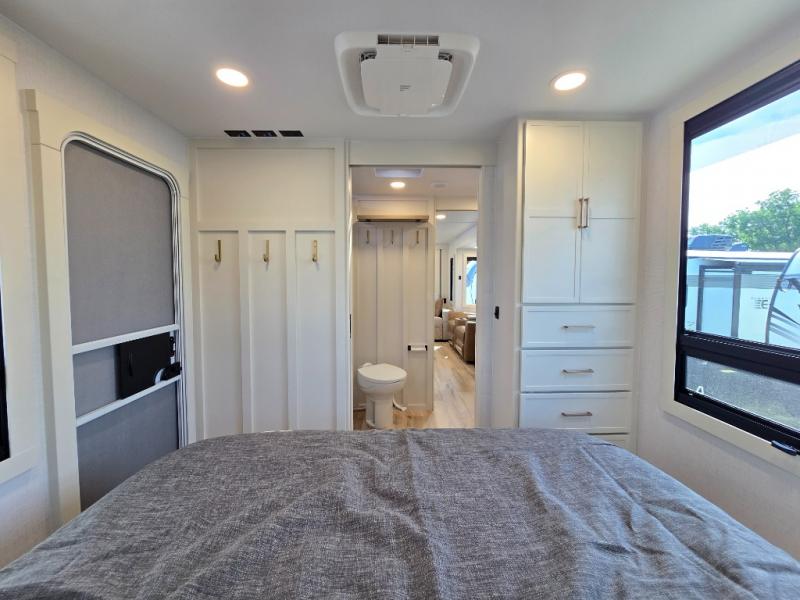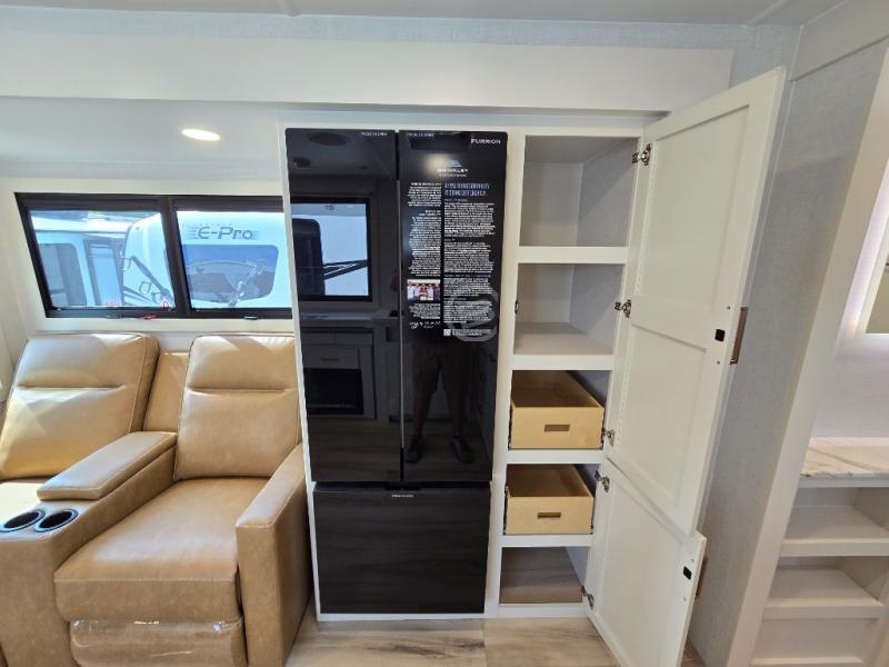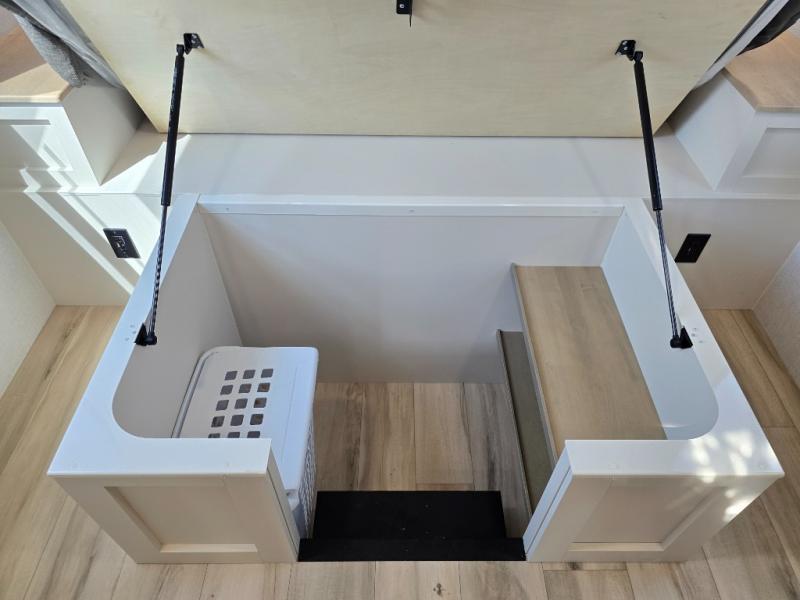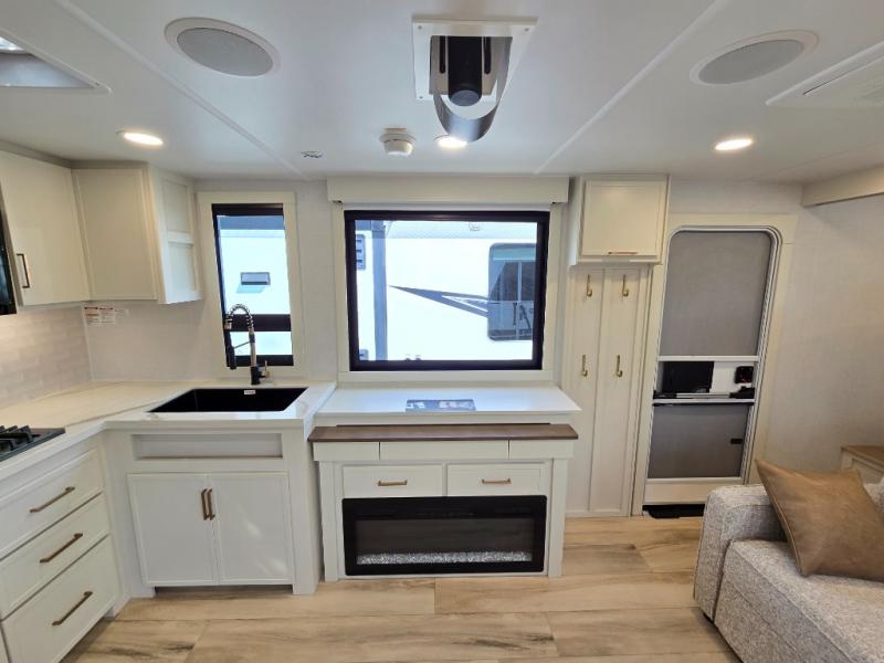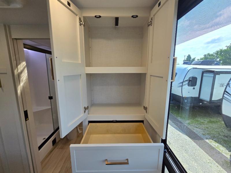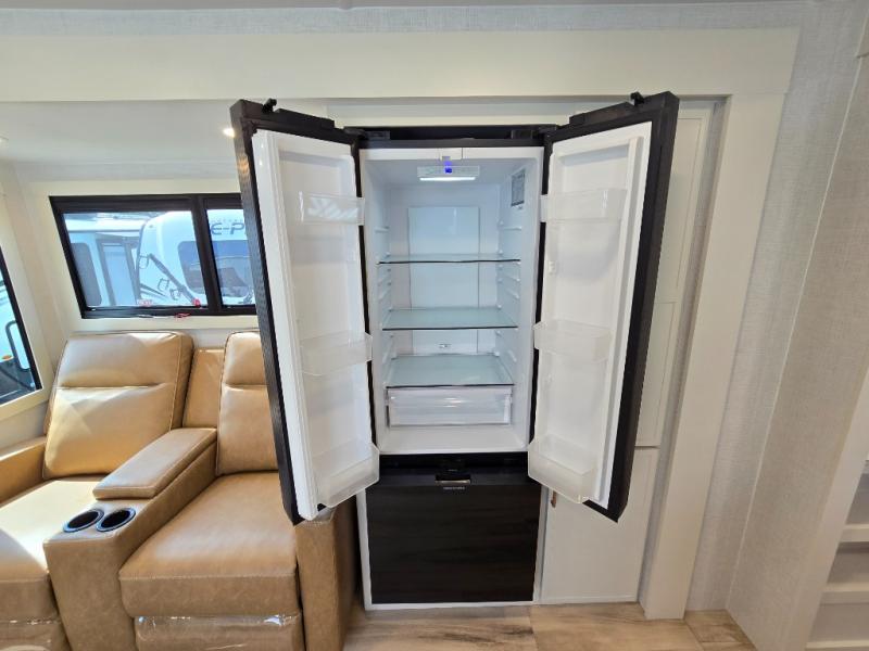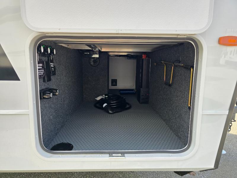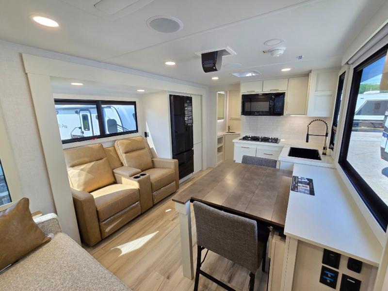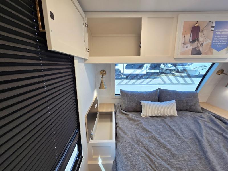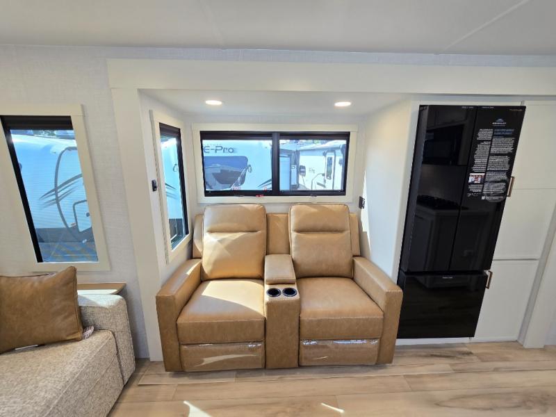Grab the whole gang and head to the campground in this bunkhouse travel trailer! The 48" x 74" bunks can sleep two to four, and there is a floor to ceiling storage cabinet with drawers, a top bunk window, outlets and USB ports, plus double space-saving pocket doors. Up front you'll find the master bedroom with a 66" x 80" king bed and a MaxSpace Split-Level Wardrobe, TV prep, your own exterior entry door, plus quick access to the walk-thru bath. Everyone can meet in the combined kitchen and living room to relax on the theater seating or tri-fold sofa, and there is pull-out dining table with a drawer and a window above for great outdoor views. The outside is just as accommodating as the inside with its exterior speakers, LED chassis lighting, rear storage compartment with dual access doors, and exterior 12V refrigerator for cold drinks!