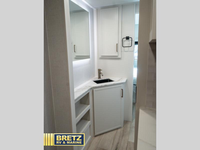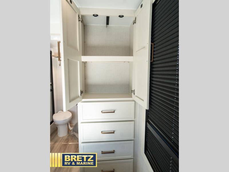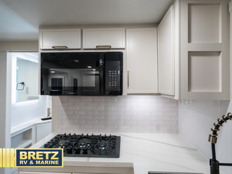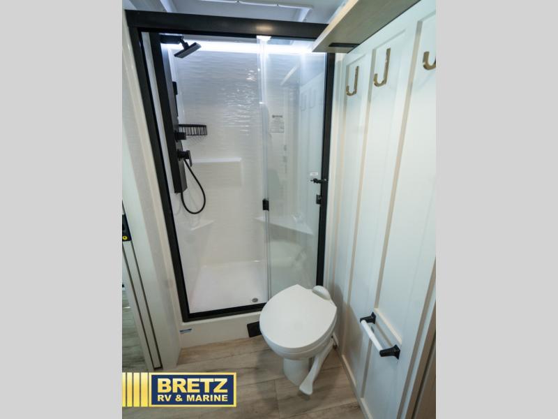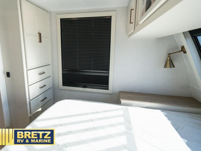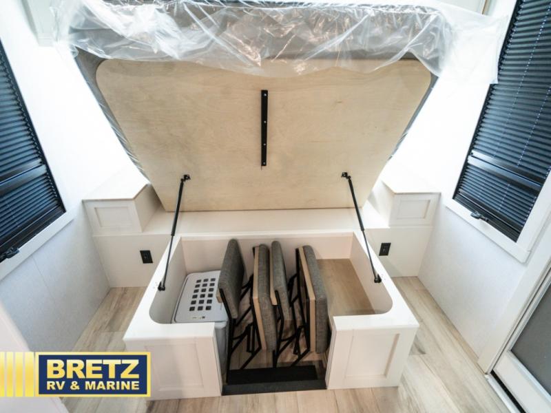 Grab the whole gang and head to the campground in this bunkhouse travel trailer! The 48" x 74" bunks can sleep two to four, and there is a floor to ceiling storage cabinet with drawers, a top bunk window, outlets and USB ports, plus double space-saving pocket doors. Up front you'll find the master bedroom with a 66" x 80" king bed and a MaxSpace Split-Level Wardrobe, TV prep, your own exterior entry door, plus quick access to the walk-thru bath. Everyone can meet in the combined kitchen and living room to relax on the theater seating or tri-fold sofa, and there is pull-out dining table with a drawer and a window above for great outdoor views. The outside is just as accommodating as the inside with its exterior speakers, LED chassis lighting, rear storage compartment with dual access doors, and exterior 12V refrigerator for cold drinks!