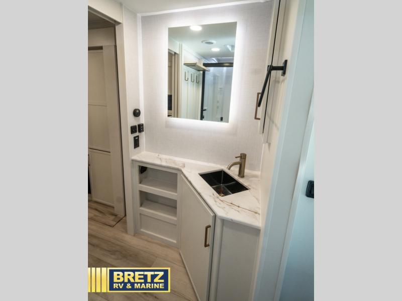 The lightweight Model I travel trailer by Brinkley is the perfect choice for those looking for an easy tow and at-home comforts! There is a drop-frame chassis, high-performance Road Armor suspension equalizer system, and Demco EZ Latch trailer coupler that automatically latches when dropped onto a hitch ball without the need of a safety pin. Additional exterior features include square Euro frameless windows, automotive-grade paint, full-width LED strip lighting in the pass-thru, and a pet & property security campside tie-down to keep your gear and furry friends safe. Inside, you'll be wowed by Brinkley's CraftSense wood trim construction, residential solid surface kitchen countertops, dimmable bedroom lights, and marine-grade neon LED shower lighting to name a few stand-out features!