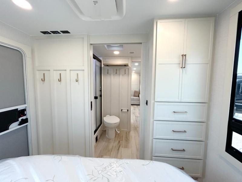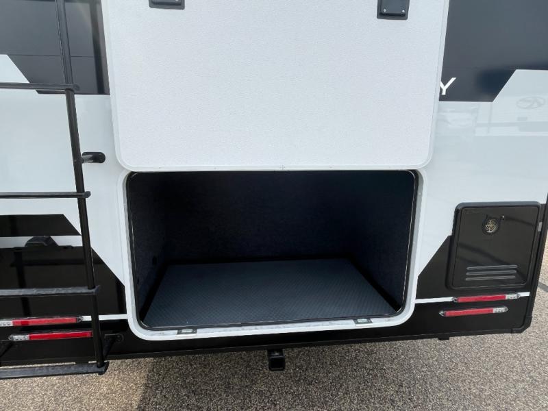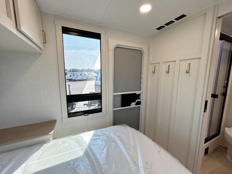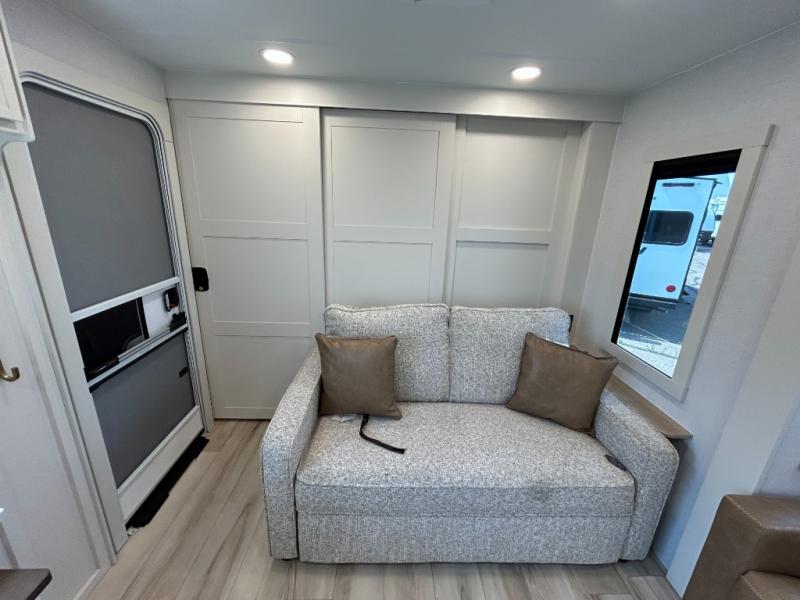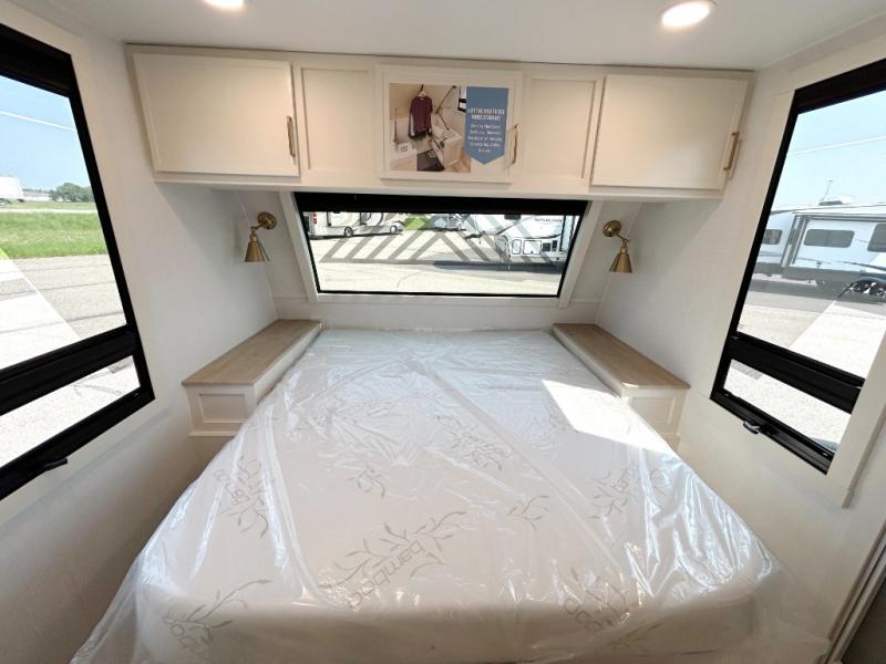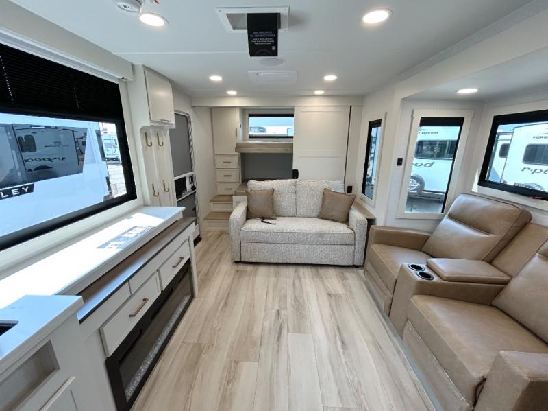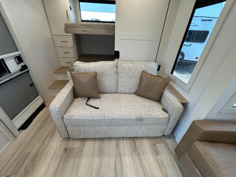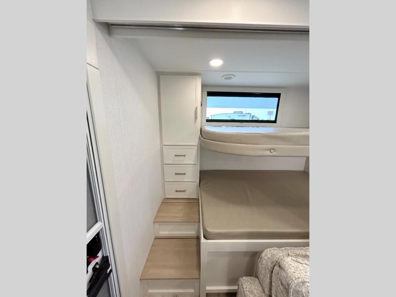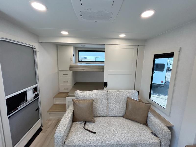 Grab the whole gang and head to the campground in this bunkhouse travel trailer! The 48" x 74" bunks can sleep two to four, and there is a floor to ceiling storage cabinet with drawers, a top bunk window, outlets and USB ports, plus double space-saving pocket doors. Up front you'll find the master bedroom with a 66" x 80" king bed and a MaxSpace Split-Level Wardrobe, TV prep, your own exterior entry door, plus quick access to the walk-thru bath. Everyone can meet in the combined kitchen and living room to relax on the theater seating or tri-fold sofa, and there is pull-out dining table with a drawer and a window above for great outdoor views. The outside is just as accommodating as the inside with its exterior speakers, LED chassis lighting, rear storage compartment with dual access doors, and exterior 12V refrigerator for cold drinks!