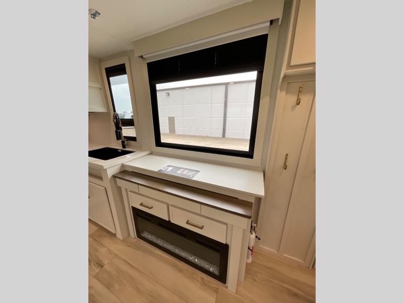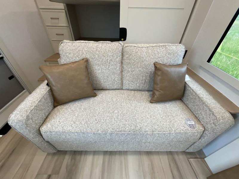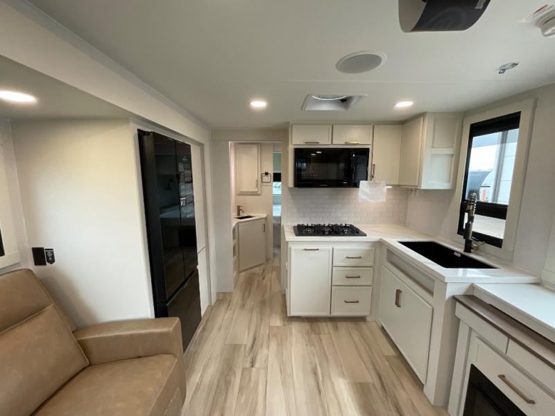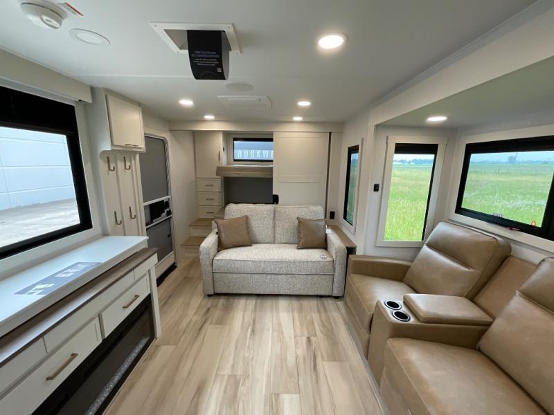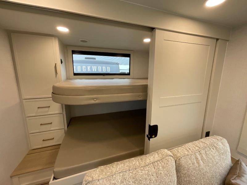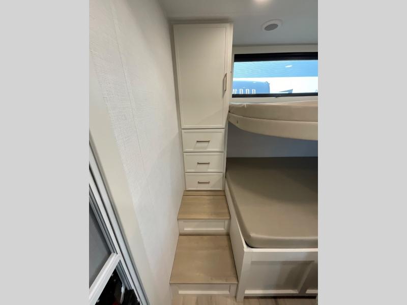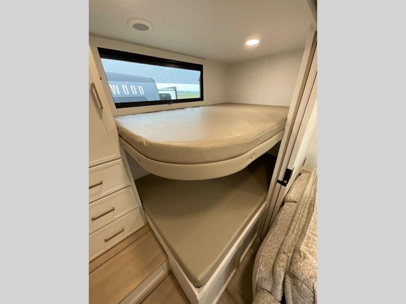 Grab the whole gang and head to the campground in this bunkhouse travel trailer! The 48" x 74" bunks can sleep two to four, and there is a floor to ceiling storage cabinet with drawers, a top bunk window, outlets and USB ports, plus double space-saving pocket doors. Up front you'll find the master bedroom with a 66" x 80" king bed and a MaxSpace Split-Level Wardrobe, TV prep, your own exterior entry door, plus quick access to the walk-thru bath. Everyone can meet in the combined kitchen and living room to relax on the theater seating or tri-fold sofa, and there is pull-out dining table with a drawer and a window above for great outdoor views. The outside is just as accommodating as the inside with its exterior speakers, LED chassis lighting, rear storage compartment with dual access doors, and exterior 12V refrigerator for cold drinks!