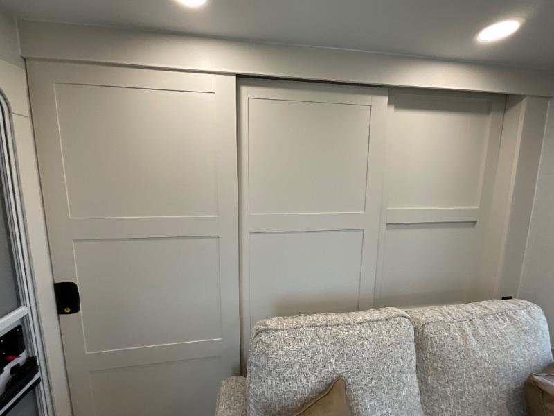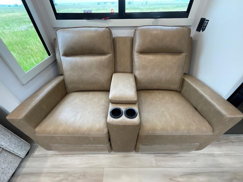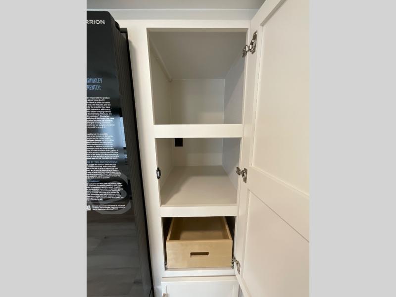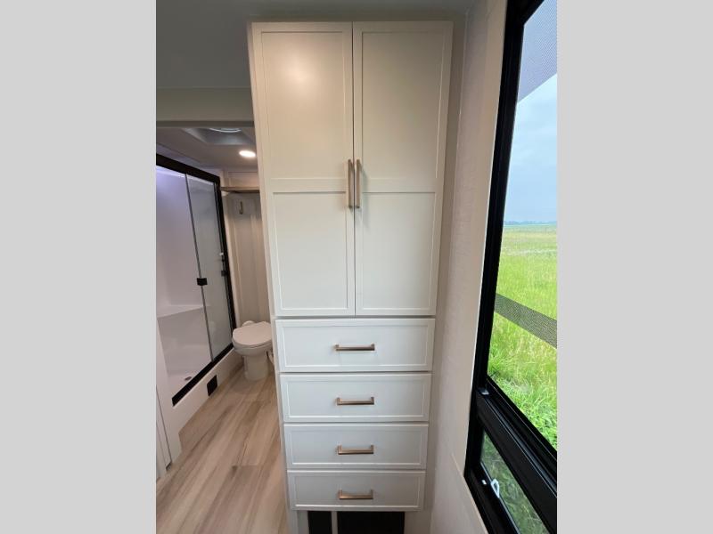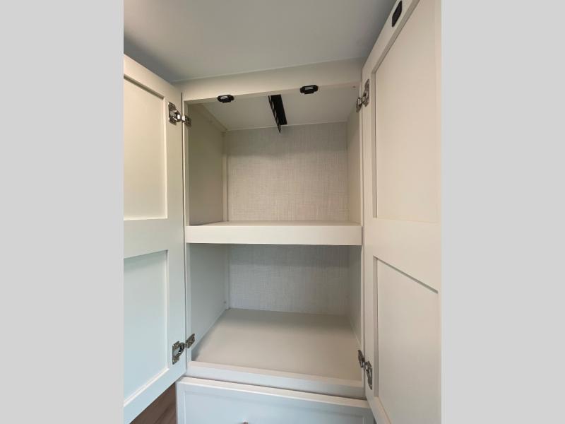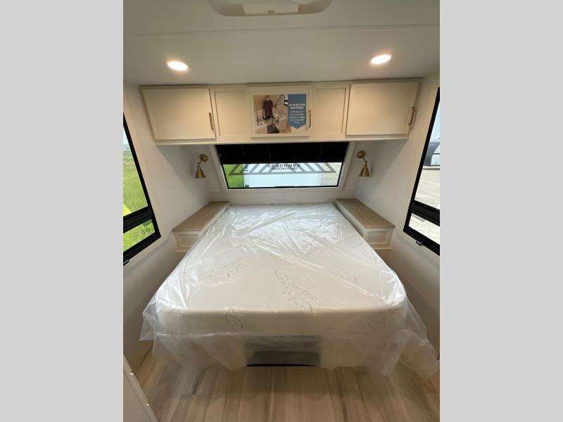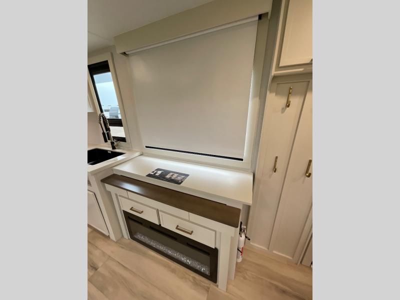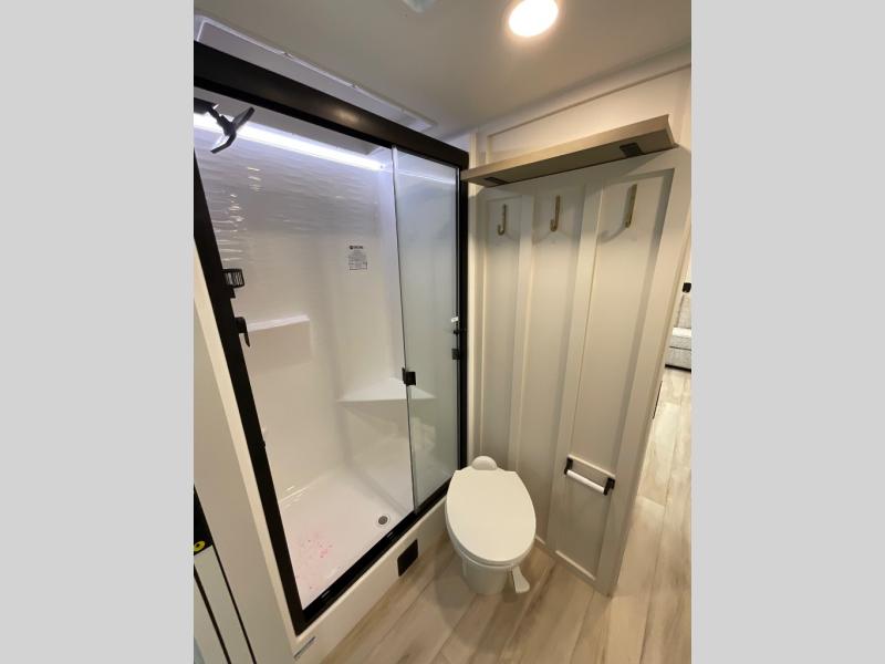 Grab the whole gang and head to the campground in this bunkhouse travel trailer! The 48" x 74" bunks can sleep two to four, and there is a floor to ceiling storage cabinet with drawers, a top bunk window, outlets and USB ports, plus double space-saving pocket doors. Up front you'll find the master bedroom with a 66" x 80" king bed and a MaxSpace Split-Level Wardrobe, TV prep, your own exterior entry door, plus quick access to the walk-thru bath. Everyone can meet in the combined kitchen and living room to relax on the theater seating or tri-fold sofa, and there is pull-out dining table with a drawer and a window above for great outdoor views. The outside is just as accommodating as the inside with its exterior speakers, LED chassis lighting, rear storage compartment with dual access doors, and exterior 12V refrigerator for cold drinks!
