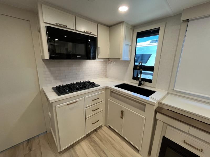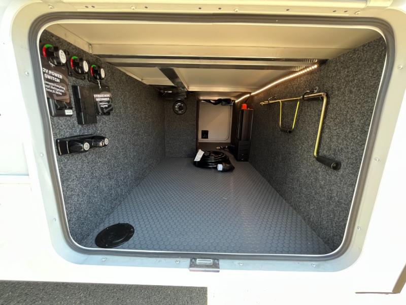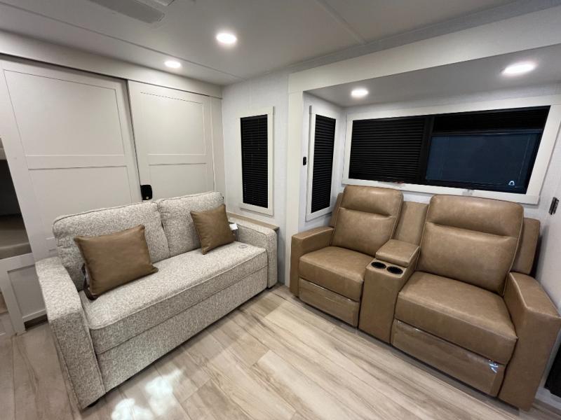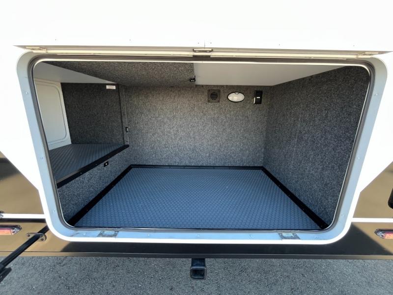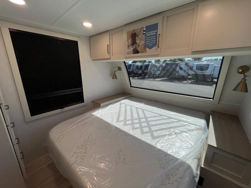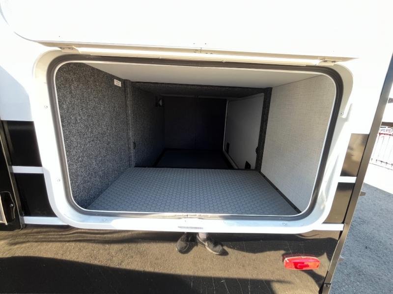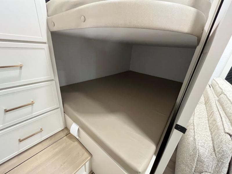 Grab the whole gang and head to the campground in this bunkhouse travel trailer! The 48" x 74" bunks can sleep two to four, and there is a floor to ceiling storage cabinet with drawers, a top bunk window, outlets and USB ports, plus double space-saving pocket doors. Up front you'll find the master bedroom with a 66" x 80" king bed and a MaxSpace Split-Level Wardrobe, TV prep, your own exterior entry door, plus quick access to the walk-thru bath. Everyone can meet in the combined kitchen and living room to relax on the theater seating or tri-fold sofa, and there is pull-out dining table with a drawer and a window above for great outdoor views. The outside is just as accommodating as the inside with its exterior speakers, LED chassis lighting, rear storage compartment with dual access doors, and exterior 12V refrigerator for cold drinks!