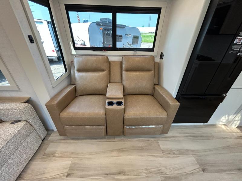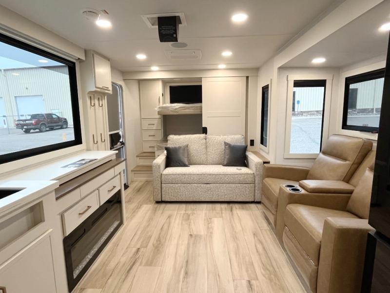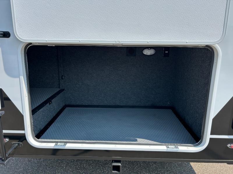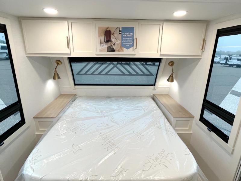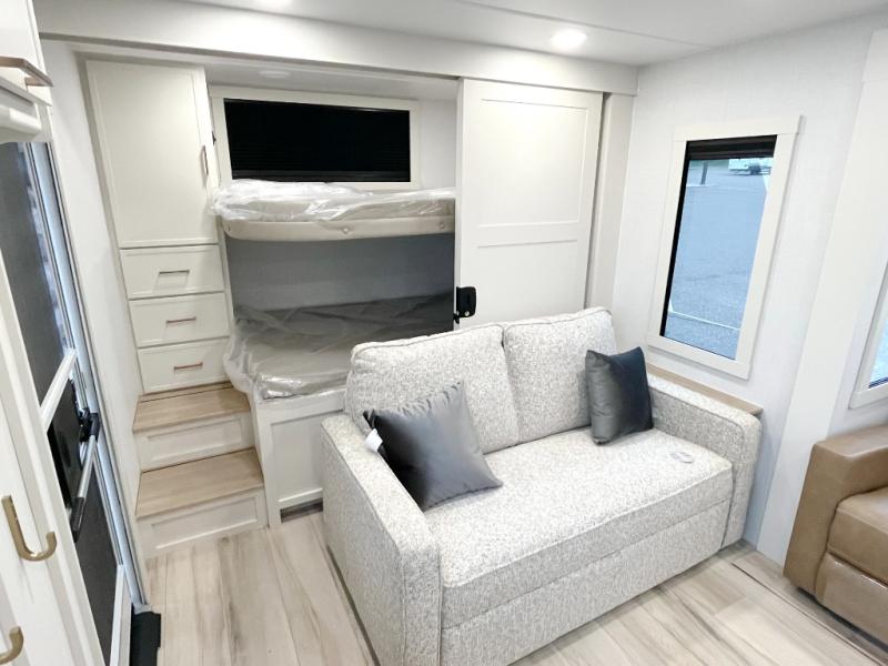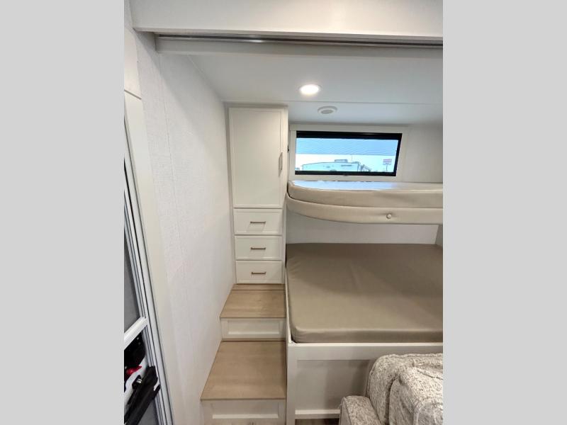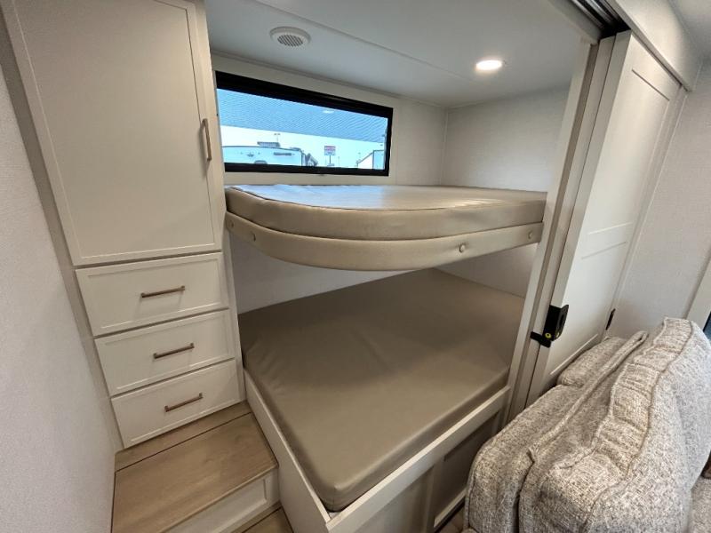 Grab the whole gang and head to the campground in this bunkhouse travel trailer! The 48" x 74" bunks can sleep two to four, and there is a floor to ceiling storage cabinet with drawers, a top bunk window, outlets and USB ports, plus double space-saving pocket doors. Up front you'll find the master bedroom with a 66" x 80" king bed and a MaxSpace Split-Level Wardrobe, TV prep, your own exterior entry door, plus quick access to the walk-thru bath. Everyone can meet in the combined kitchen and living room to relax on the theater seating or tri-fold sofa, and there is pull-out dining table with a drawer and a window above for great outdoor views. The outside is just as accommodating as the inside with its exterior speakers, LED chassis lighting, rear storage compartment with dual access doors, and exterior 12V refrigerator for cold drinks!