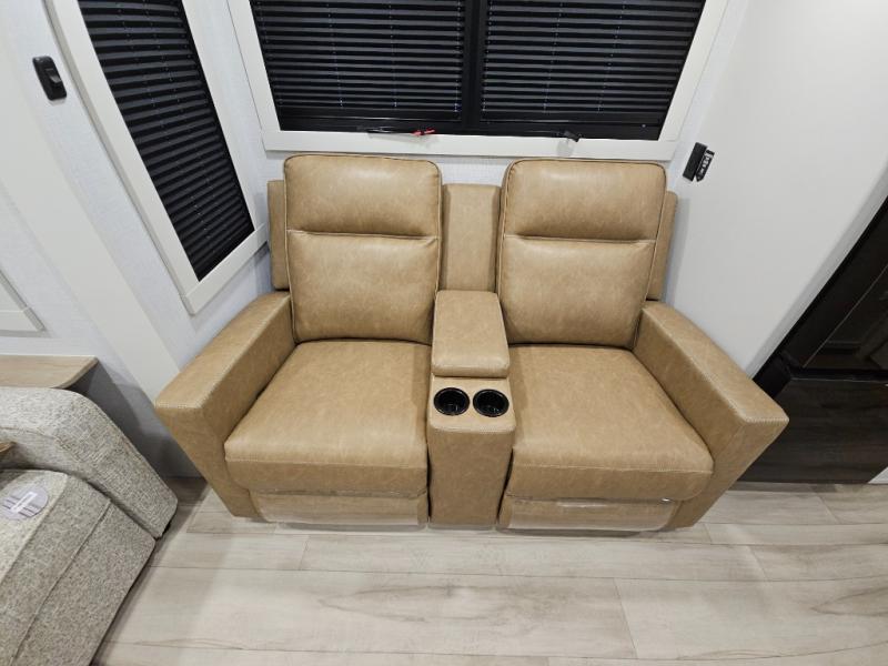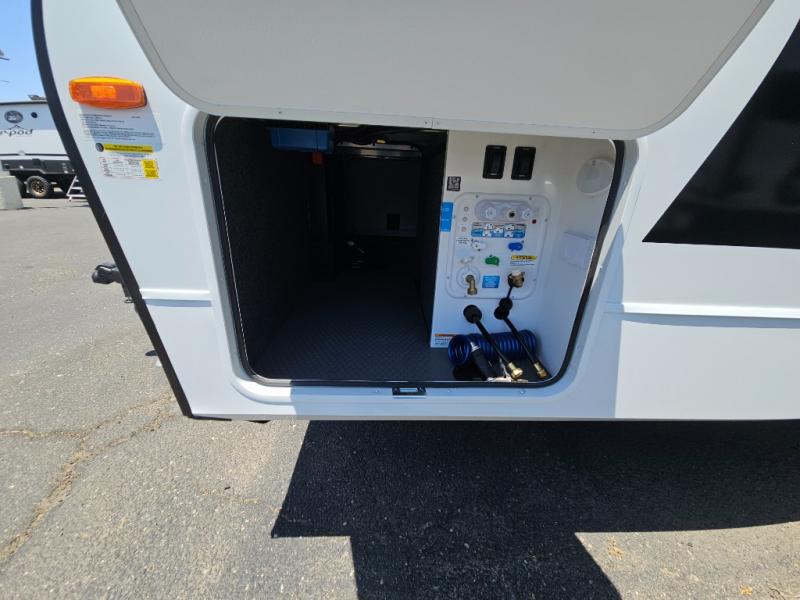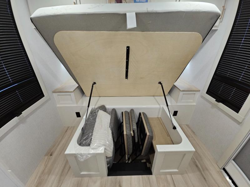 Grab the whole gang and head to the campground in this bunkhouse travel trailer! The 48" x 74" bunks can sleep two to four, and there is a floor to ceiling storage cabinet with drawers, a top bunk window, outlets and USB ports, plus double space-saving pocket doors. Up front you'll find the master bedroom with a 66" x 80" king bed and a MaxSpace Split-Level Wardrobe, TV prep, your own exterior entry door, plus quick access to the walk-thru bath. Everyone can meet in the combined kitchen and living room to relax on the theater seating or tri-fold sofa, and there is pull-out dining table with a drawer and a window above for great outdoor views. The outside is just as accommodating as the inside with its exterior speakers, LED chassis lighting, rear storage compartment with dual access doors, and exterior 12V refrigerator for cold drinks!