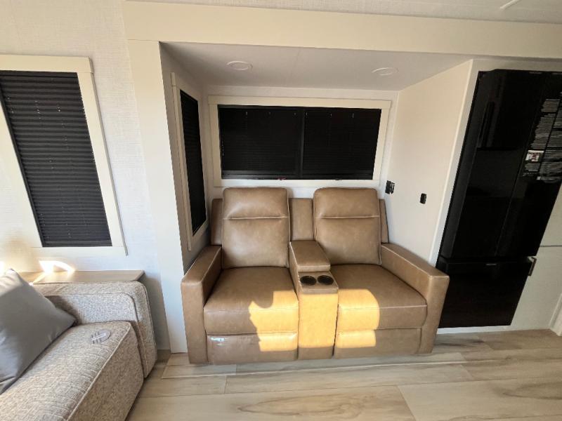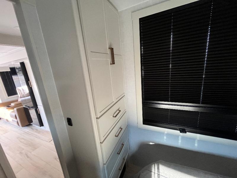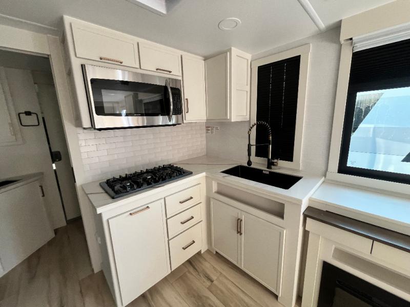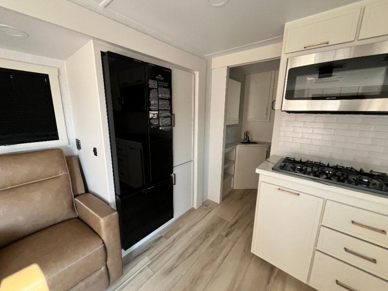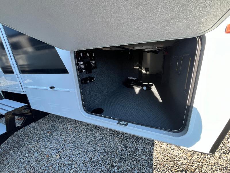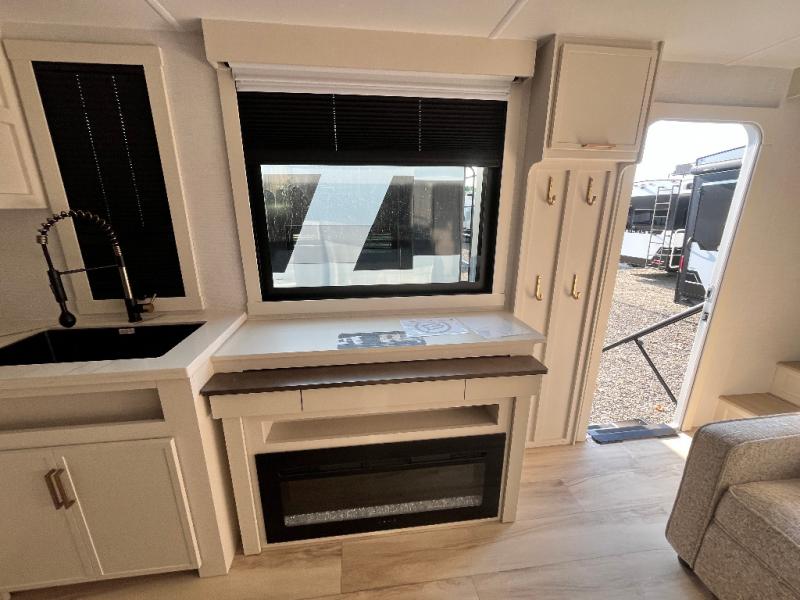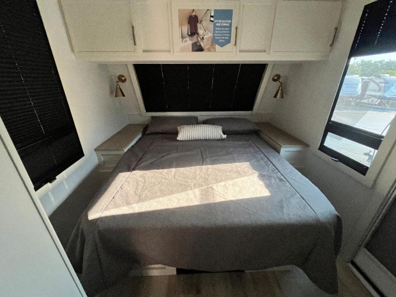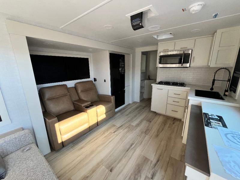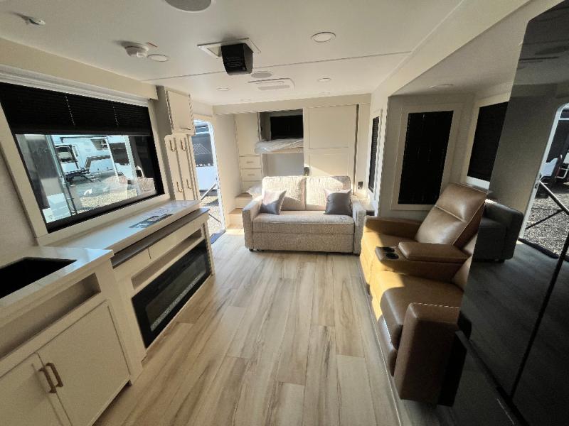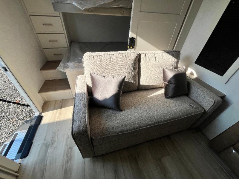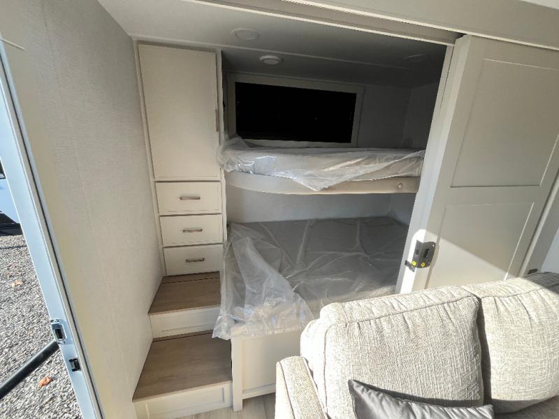 Grab the whole gang and head to the campground in this bunkhouse travel trailer! The 48" x 74" bunks can sleep two to four, and there is a floor to ceiling storage cabinet with drawers, a top bunk window, outlets and USB ports, plus double space-saving pocket doors. Up front you'll find the master bedroom with a 66" x 80" king bed and a MaxSpace Split-Level Wardrobe, TV prep, your own exterior entry door, plus quick access to the walk-thru bath. Everyone can meet in the combined kitchen and living room to relax on the theater seating or tri-fold sofa, and there is pull-out dining table with a drawer and a window above for great outdoor views. The outside is just as accommodating as the inside with its exterior speakers, LED chassis lighting, rear storage compartment with dual access doors, and exterior 12V refrigerator for cold drinks!