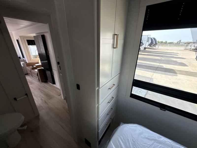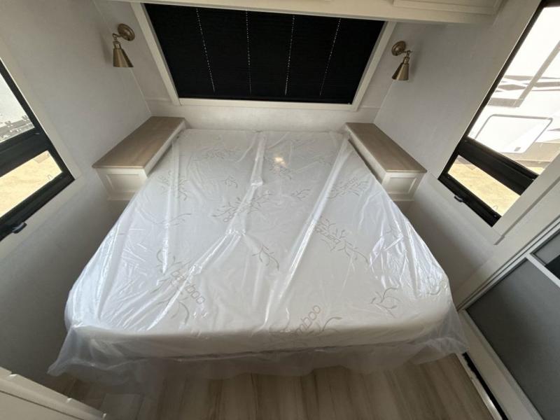 Grab the whole gang and head to the campground in this bunkhouse travel trailer! The 48" x 74" bunks can sleep two to four, and there is a floor to ceiling storage cabinet with drawers, a top bunk window, outlets and USB ports, plus double space-saving pocket doors. Up front you'll find the master bedroom with a 66" x 80" king bed and a MaxSpace Split-Level Wardrobe, TV prep, your own exterior entry door, plus quick access to the walk-thru bath. Everyone can meet in the combined kitchen and living room to relax on the theater seating or tri-fold sofa, and there is pull-out dining table with a drawer and a window above for great outdoor views. The outside is just as accommodating as the inside with its exterior speakers, LED chassis lighting, rear storage compartment with dual access doors, and exterior 12V refrigerator for cold drinks!