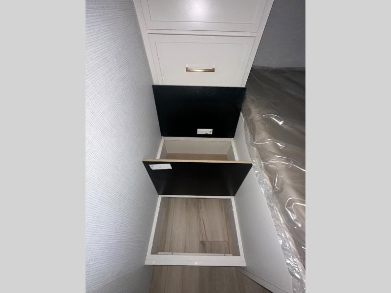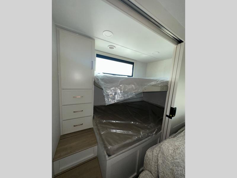 Grab the whole gang and head to the campground in this bunkhouse travel trailer! The 48" x 74" bunks can sleep two to four, and there is a floor to ceiling storage cabinet with drawers, a top bunk window, outlets and USB ports, plus double space-saving pocket doors. Up front you'll find the master bedroom with a 66" x 80" king bed and a MaxSpace Split-Level Wardrobe, TV prep, your own exterior entry door, plus quick access to the walk-thru bath. Everyone can meet in the combined kitchen and living room to relax on the theater seating or tri-fold sofa, and there is pull-out dining table with a drawer and a window above for great outdoor views. The outside is just as accommodating as the inside with its exterior speakers, LED chassis lighting, rear storage compartment with dual access doors, and exterior 12V refrigerator for cold drinks!