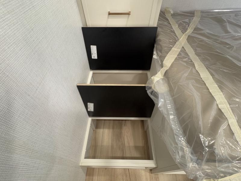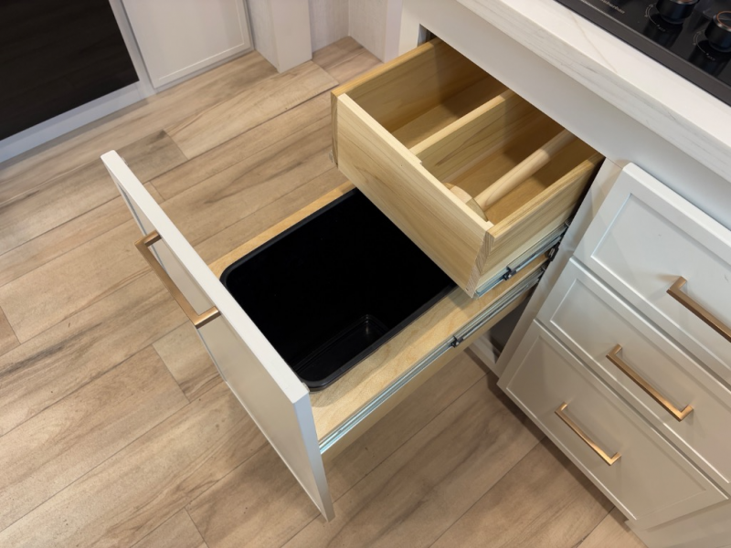 - Floor-to-ceiling storage cabinet with drawers, outlets, and USB ports
