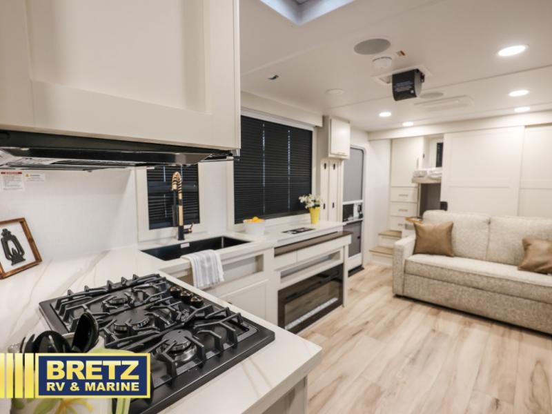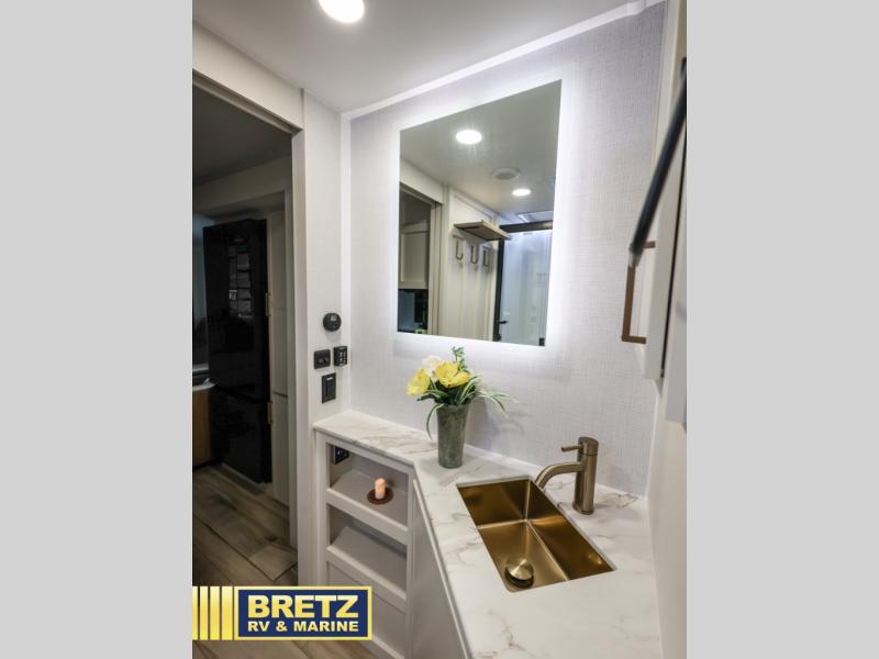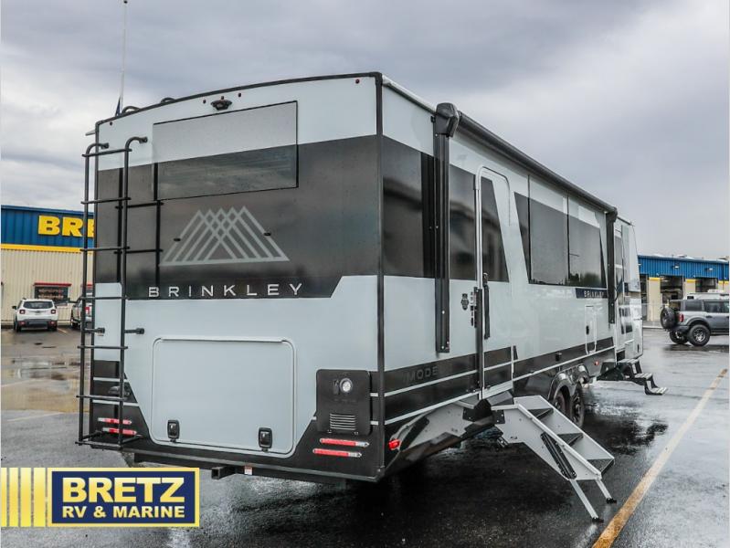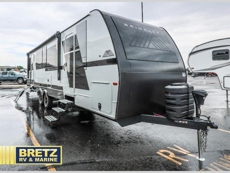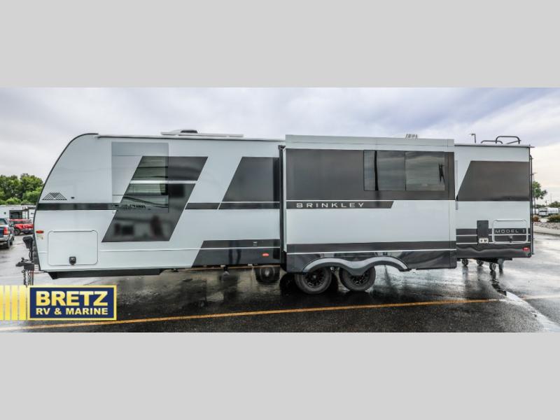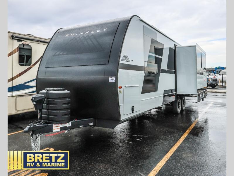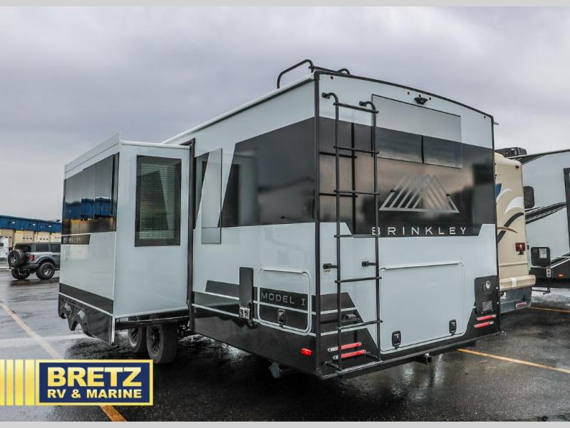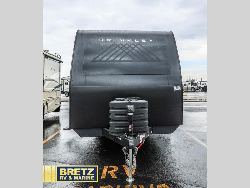 The lightweight Model I travel trailer by Brinkley is the perfect choice for those looking for an easy tow and at-home comforts! There is a drop-frame chassis, high-performance Road Armor suspension equalizer system, and Demco EZ Latch trailer coupler that automatically latches when dropped onto a hitch ball without the need of a safety pin. Additional exterior features include square Euro frameless windows, automotive-grade paint, full-width LED strip lighting in the pass-thru, and a pet & property security campside tie-down to keep your gear and furry friends safe. Inside, you'll be wowed by Brinkley's CraftSense wood trim construction, residential solid surface kitchen countertops, dimmable bedroom lights, and marine-grade neon LED shower lighting to name a few stand-out features!