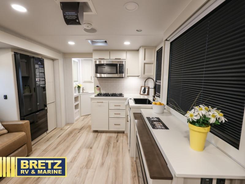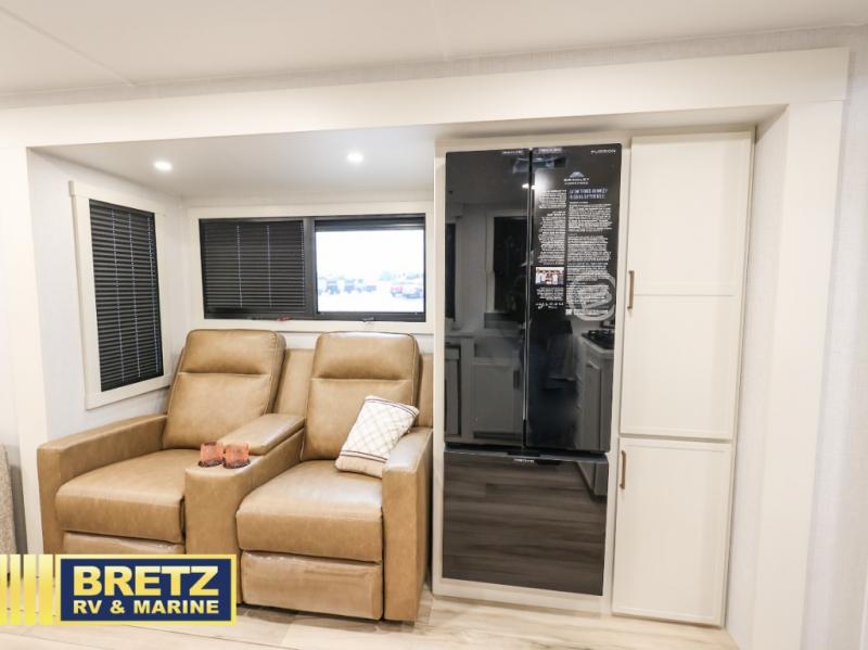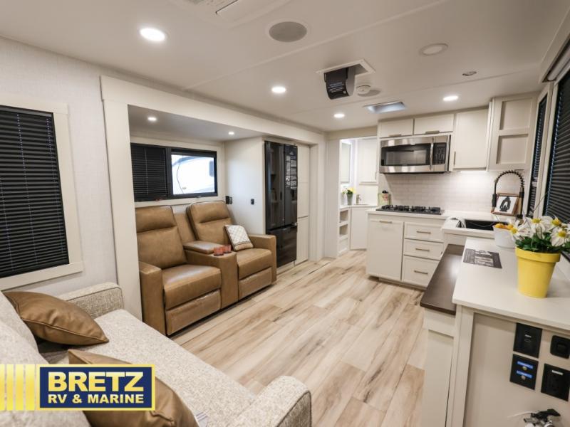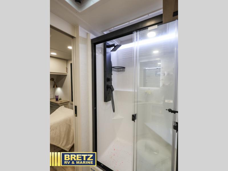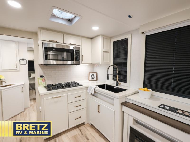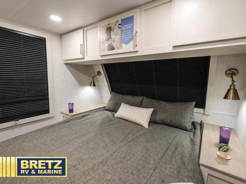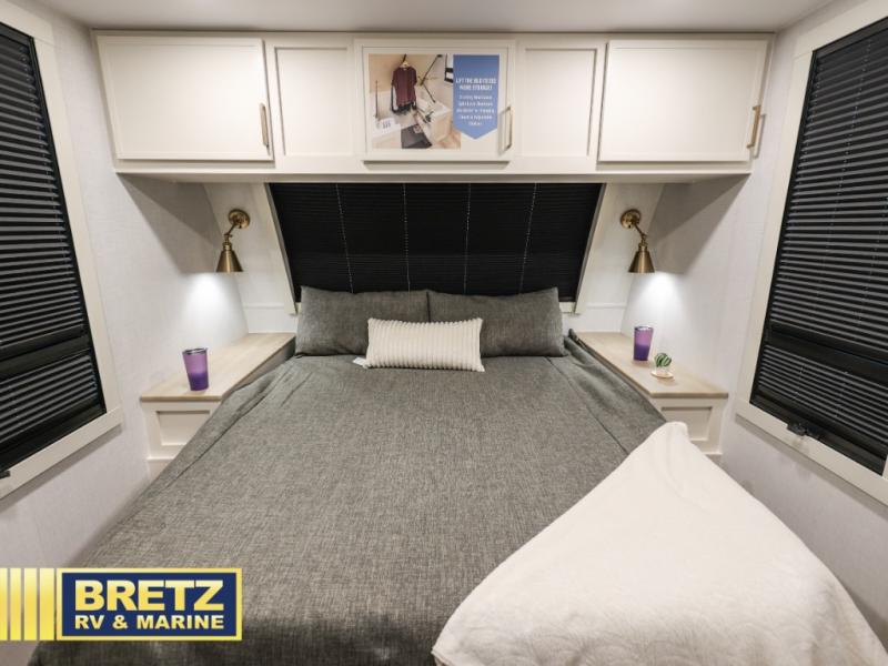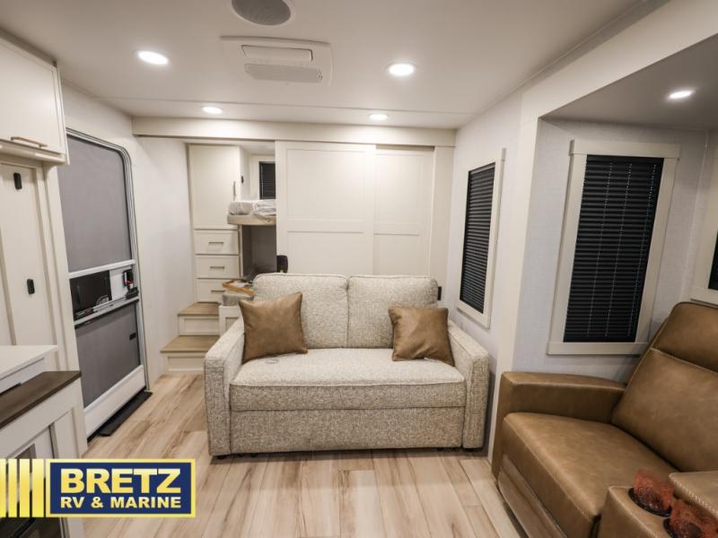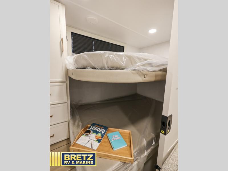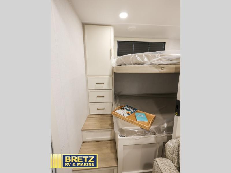 Grab the whole gang and head to the campground in this bunkhouse travel trailer! The 48" x 74" bunks can sleep two to four, and there is a floor to ceiling storage cabinet with drawers, a top bunk window, outlets and USB ports, plus double space-saving pocket doors. Up front you'll find the master bedroom with a 66" x 80" king bed and a MaxSpace Split-Level Wardrobe, TV prep, your own exterior entry door, plus quick access to the walk-thru bath. Everyone can meet in the combined kitchen and living room to relax on the theater seating or tri-fold sofa, and there is pull-out dining table with a drawer and a window above for great outdoor views. The outside is just as accommodating as the inside with its exterior speakers, LED chassis lighting, rear storage compartment with dual access doors, and exterior 12V refrigerator for cold drinks!