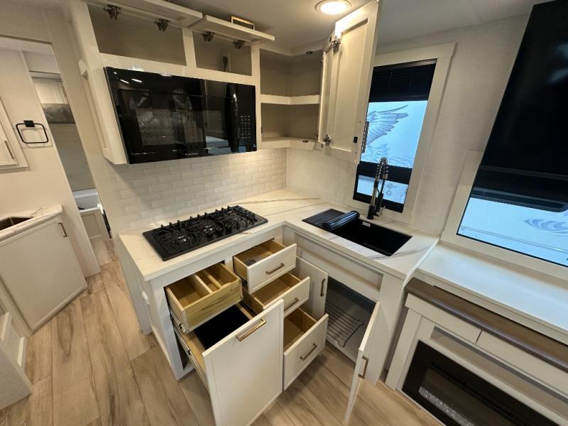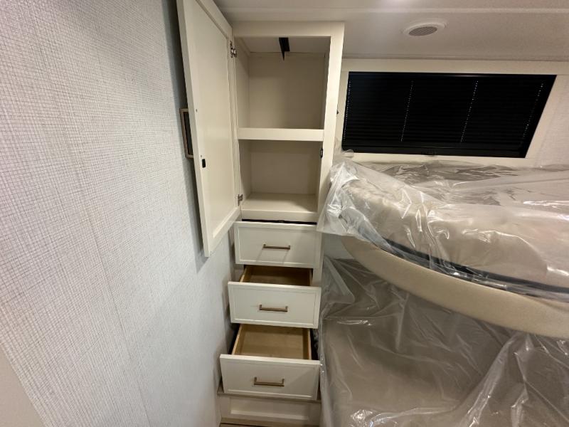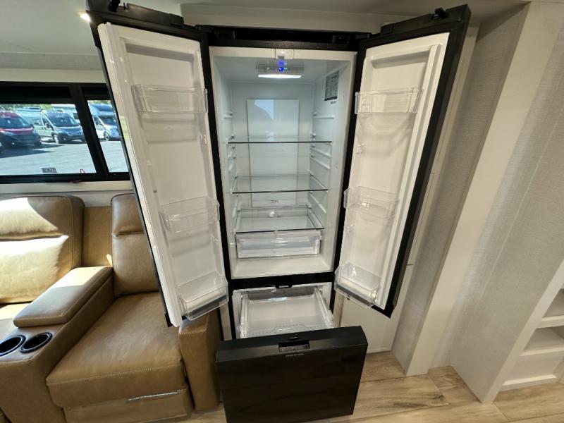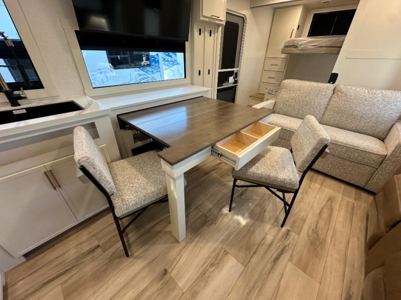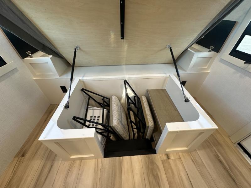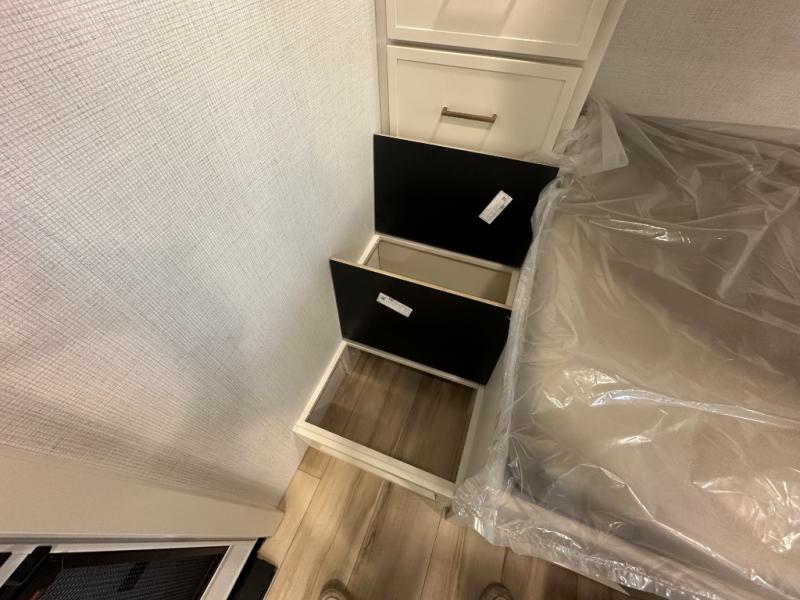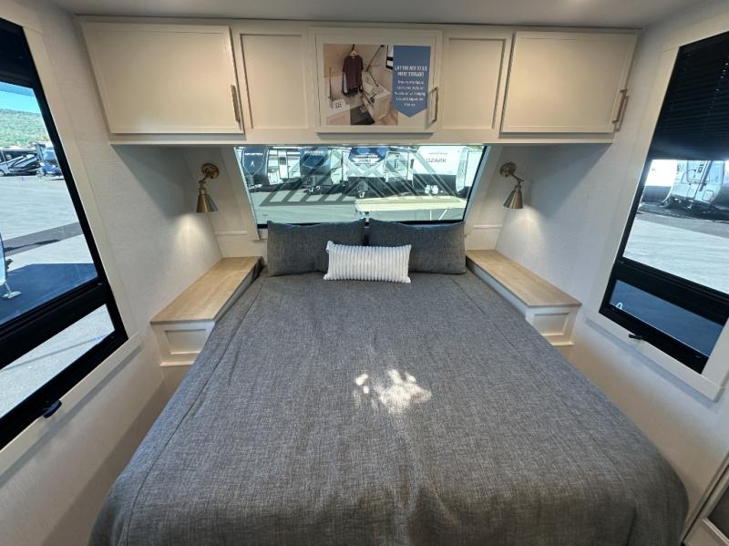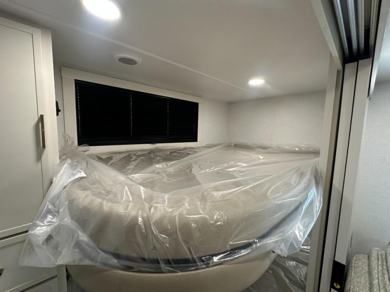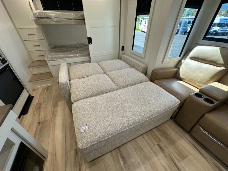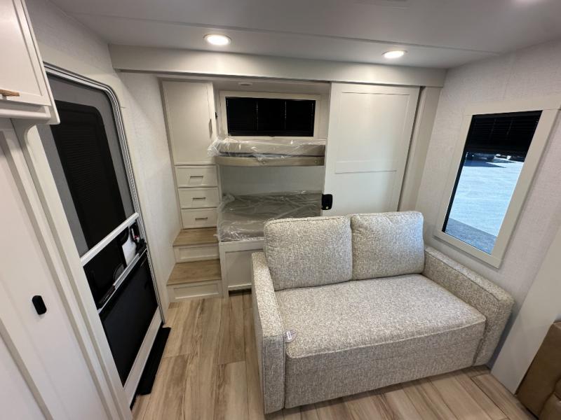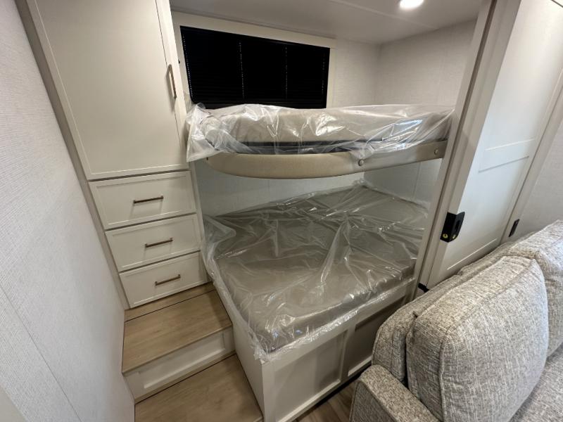 Grab the whole gang and head to the campground in this bunkhouse travel trailer! The 48" x 74" bunks can sleep two to four, and there is a floor to ceiling storage cabinet with drawers, a top bunk window, outlets and USB ports, plus double space-saving pocket doors. Up front you'll find the master bedroom with a 66" x 80" king bed and a MaxSpace Split-Level Wardrobe, TV prep, your own exterior entry door, plus quick access to the walk-thru bath. Everyone can meet in the combined kitchen and living room to relax on the theater seating or tri-fold sofa, and there is pull-out dining table with a drawer and a window above for great outdoor views. The outside is just as accommodating as the inside with its exterior speakers, LED chassis lighting, rear storage compartment with dual access doors, and exterior 12V refrigerator for cold drinks!