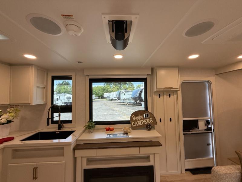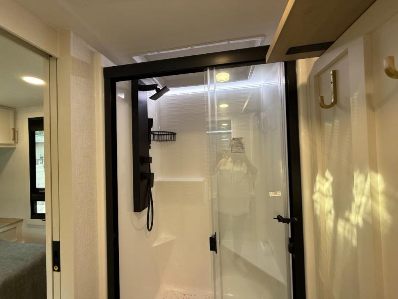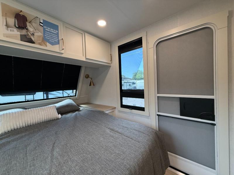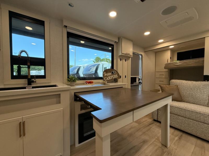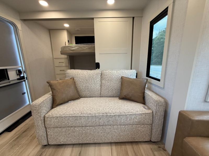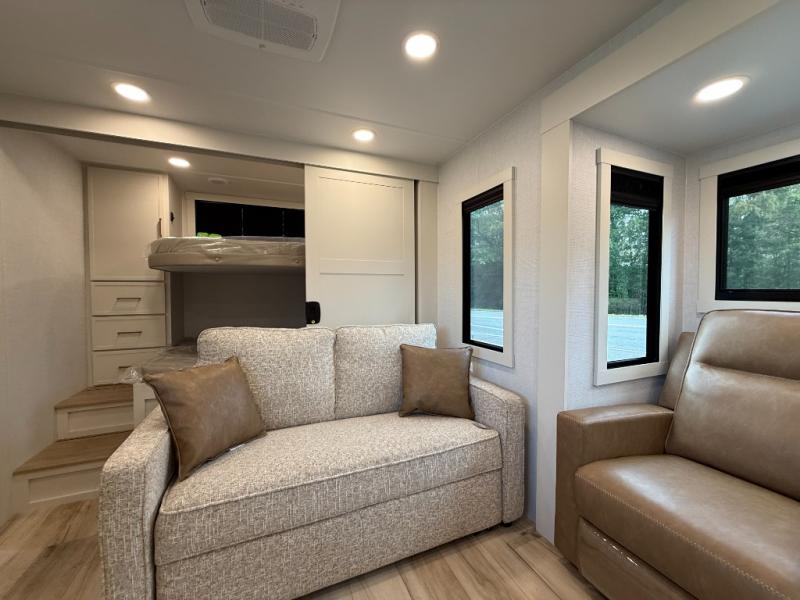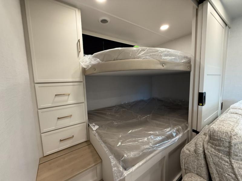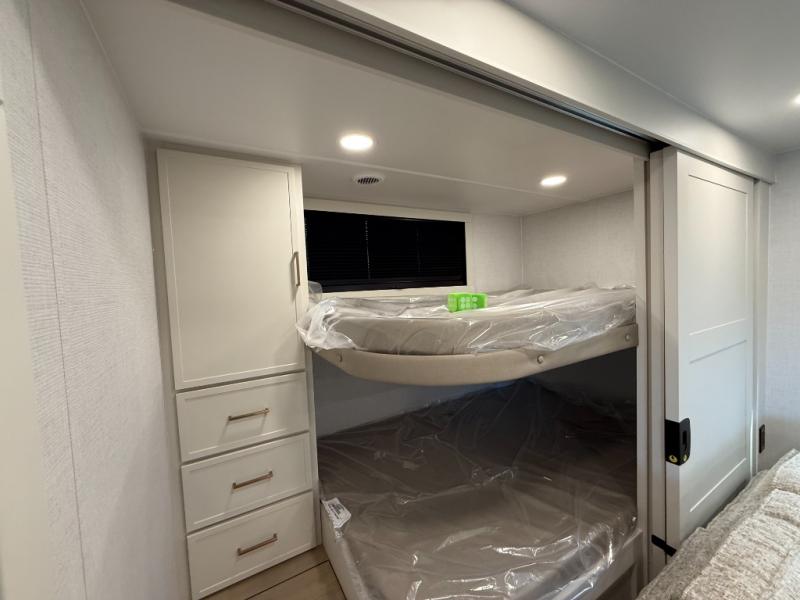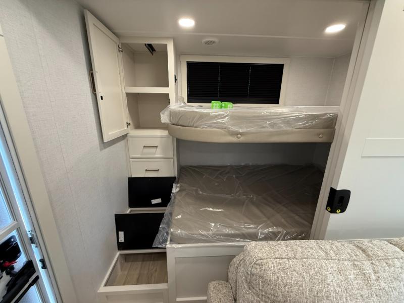 Grab the whole gang and head to the campground in this bunkhouse travel trailer! The 48" x 74" bunks can sleep two to four, and there is a floor to ceiling storage cabinet with drawers, a top bunk window, outlets and USB ports, plus double space-saving pocket doors. Up front you'll find the master bedroom with a 66" x 80" king bed and a MaxSpace Split-Level Wardrobe, TV prep, your own exterior entry door, plus quick access to the walk-thru bath. Everyone can meet in the combined kitchen and living room to relax on the theater seating or tri-fold sofa, and there is pull-out dining table with a drawer and a window above for great outdoor views. The outside is just as accommodating as the inside with its exterior speakers, LED chassis lighting, rear storage compartment with dual access doors, and exterior 12V refrigerator for cold drinks!