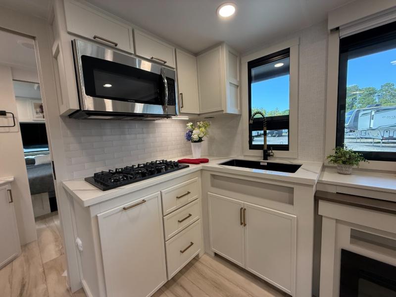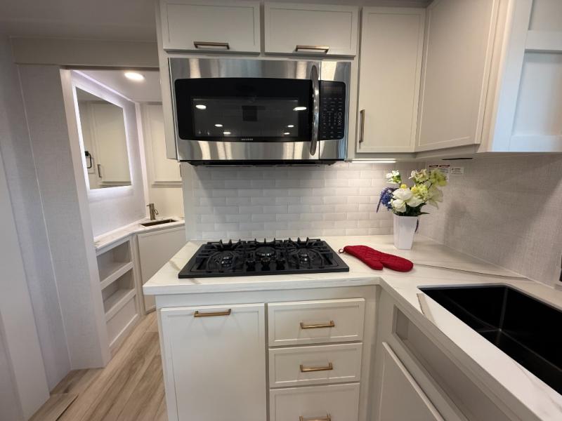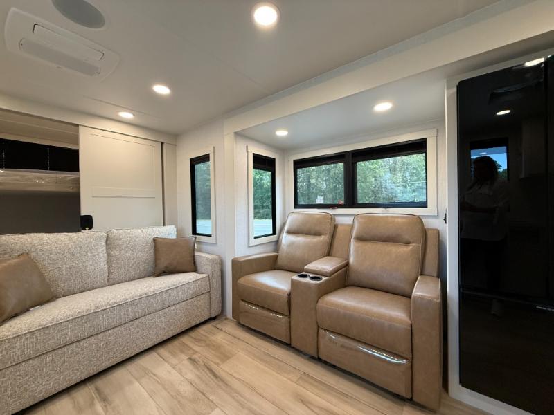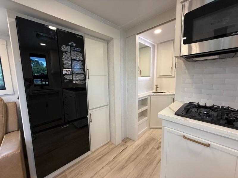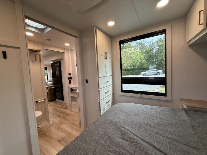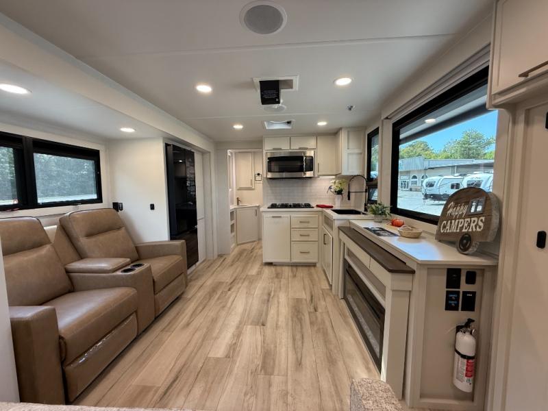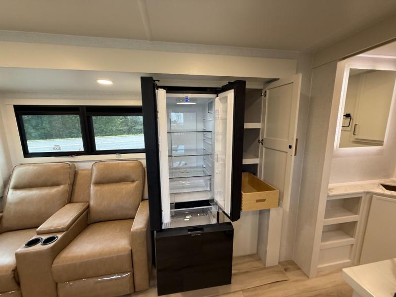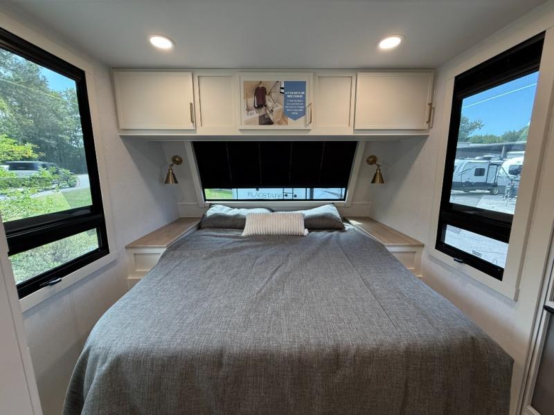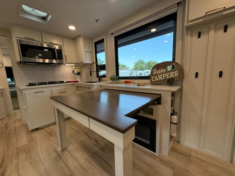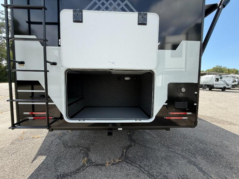 Grab the whole gang and head to the campground in this bunkhouse travel trailer! The 48" x 74" bunks can sleep two to four, and there is a floor to ceiling storage cabinet with drawers, a top bunk window, outlets and USB ports, plus double space-saving pocket doors. Up front you'll find the master bedroom with a 66" x 80" king bed and a MaxSpace Split-Level Wardrobe, TV prep, your own exterior entry door, plus quick access to the walk-thru bath. Everyone can meet in the combined kitchen and living room to relax on the theater seating or tri-fold sofa, and there is pull-out dining table with a drawer and a window above for great outdoor views. The outside is just as accommodating as the inside with its exterior speakers, LED chassis lighting, rear storage compartment with dual access doors, and exterior 12V refrigerator for cold drinks!