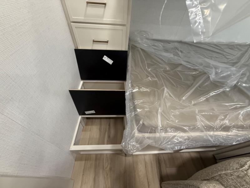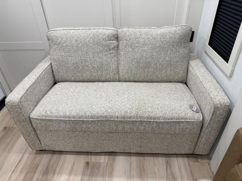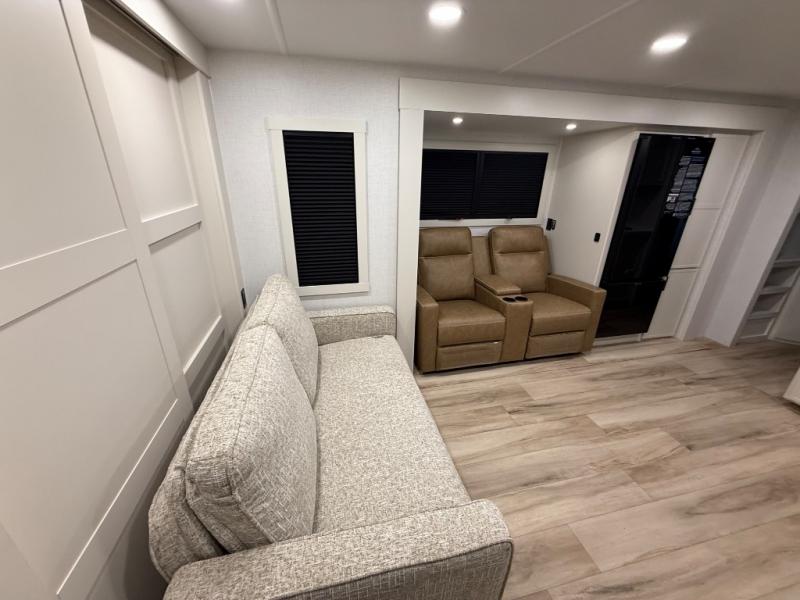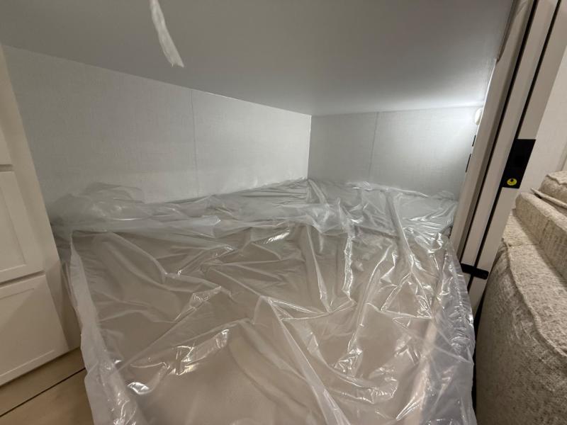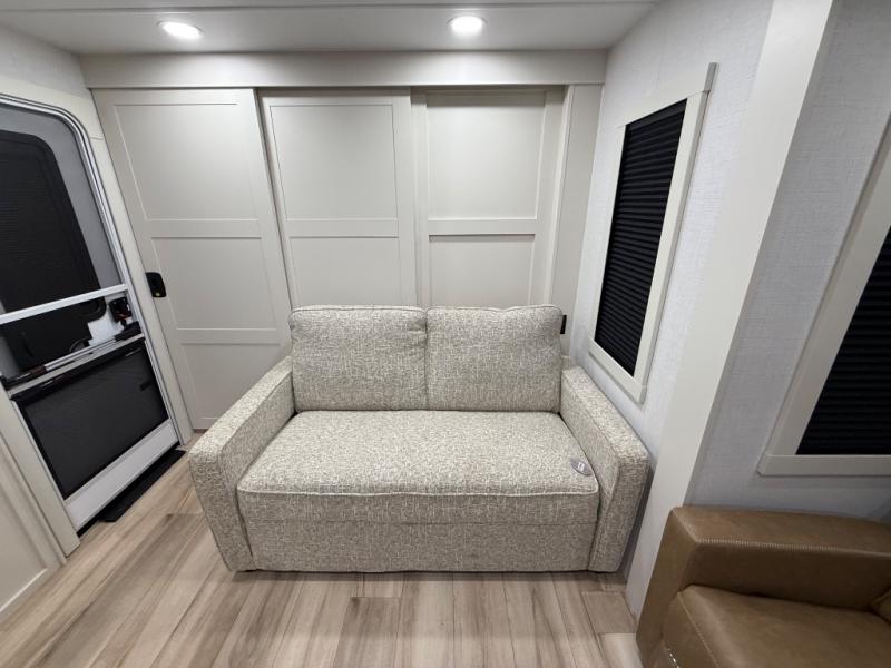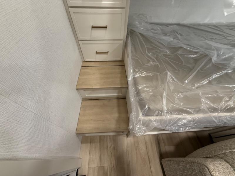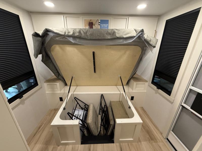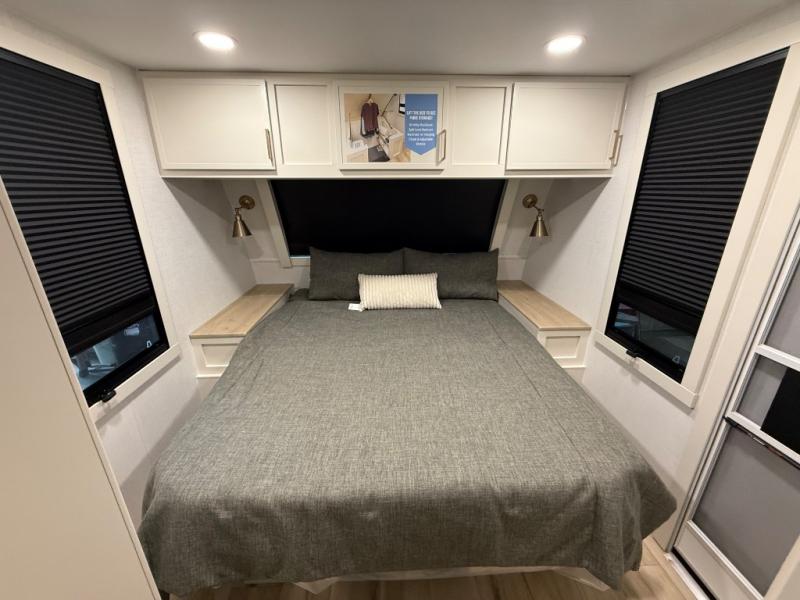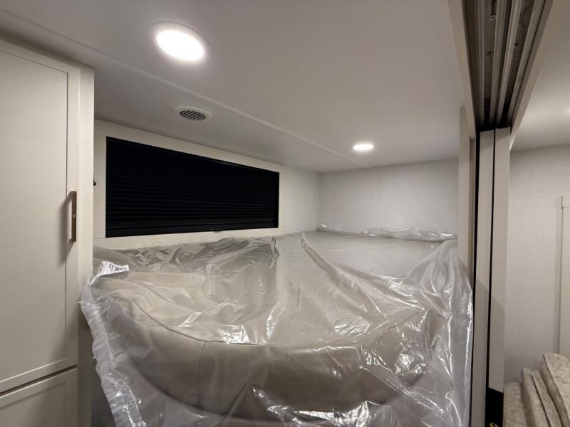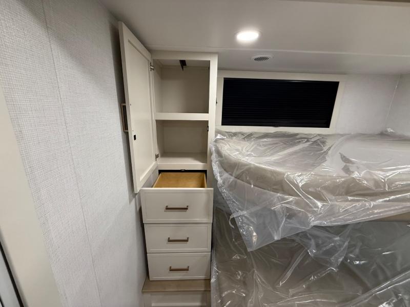 Grab the whole gang and head to the campground in this bunkhouse travel trailer! The 48" x 74" bunks can sleep two to four, and there is a floor to ceiling storage cabinet with drawers, a top bunk window, outlets and USB ports, plus double space-saving pocket doors. Up front you'll find the master bedroom with a 66" x 80" king bed and a MaxSpace Split-Level Wardrobe, TV prep, your own exterior entry door, plus quick access to the walk-thru bath. Everyone can meet in the combined kitchen and living room to relax on the theater seating or tri-fold sofa, and there is pull-out dining table with a drawer and a window above for great outdoor views. The outside is just as accommodating as the inside with its exterior speakers, LED chassis lighting, rear storage compartment with dual access doors, and exterior 12V refrigerator for cold drinks!