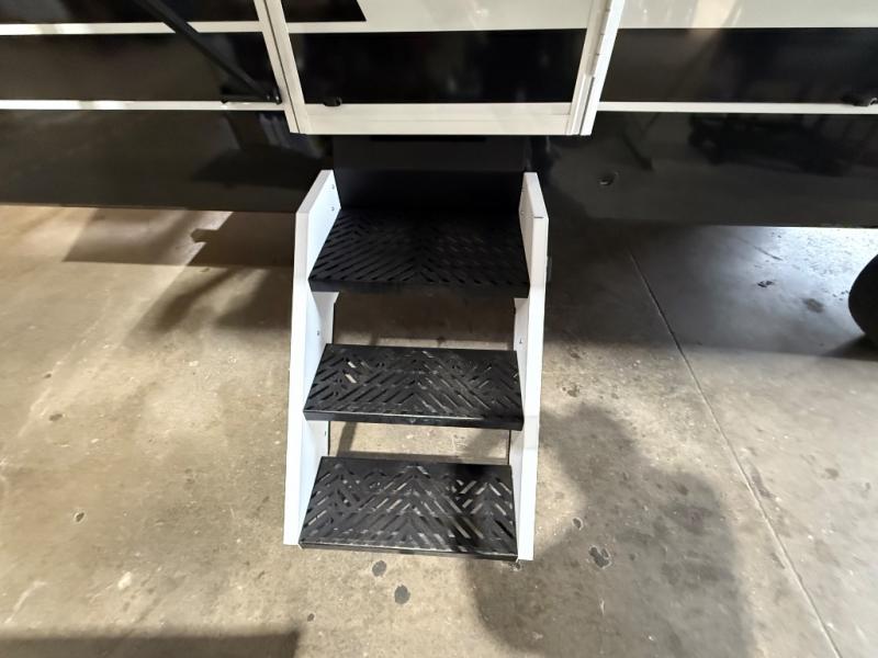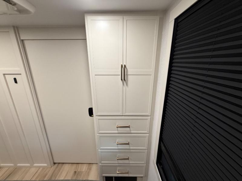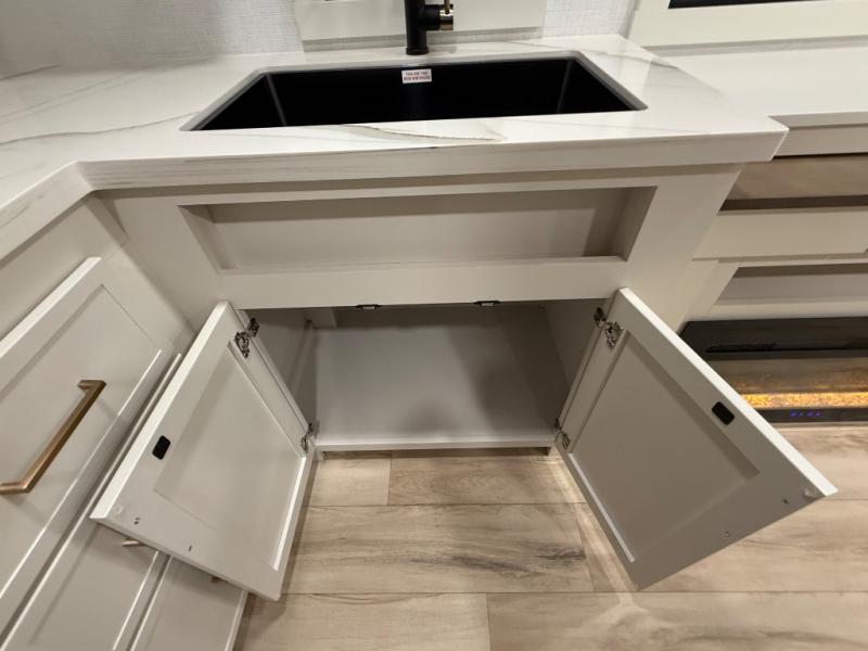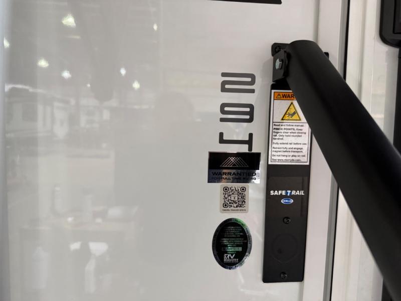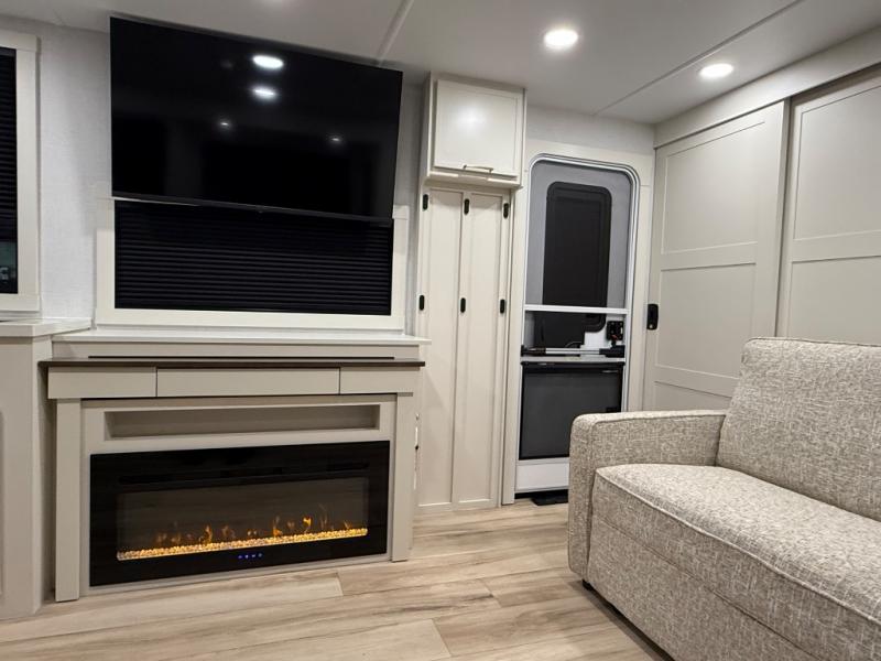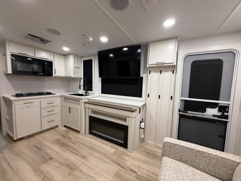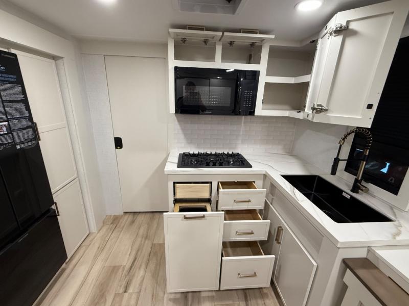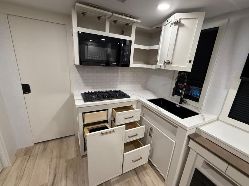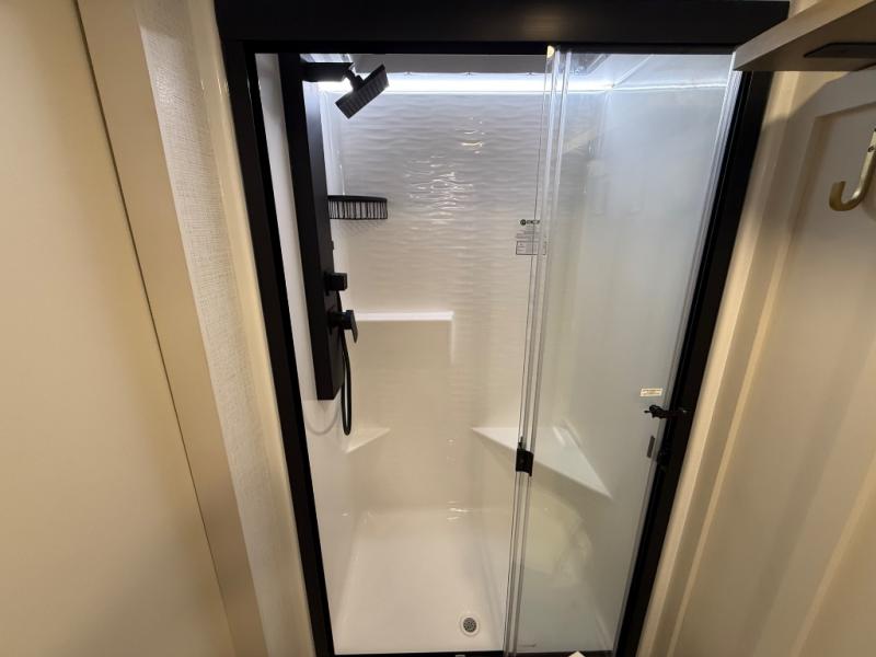 Grab the whole gang and head to the campground in this bunkhouse travel trailer! The 48" x 74" bunks can sleep two to four, and there is a floor to ceiling storage cabinet with drawers, a top bunk window, outlets and USB ports, plus double space-saving pocket doors. Up front you'll find the master bedroom with a 66" x 80" king bed and a MaxSpace Split-Level Wardrobe, TV prep, your own exterior entry door, plus quick access to the walk-thru bath. Everyone can meet in the combined kitchen and living room to relax on the theater seating or tri-fold sofa, and there is pull-out dining table with a drawer and a window above for great outdoor views. The outside is just as accommodating as the inside with its exterior speakers, LED chassis lighting, rear storage compartment with dual access doors, and exterior 12V refrigerator for cold drinks!