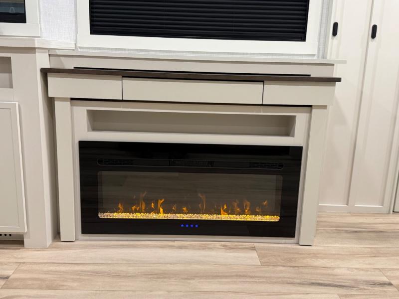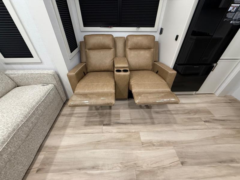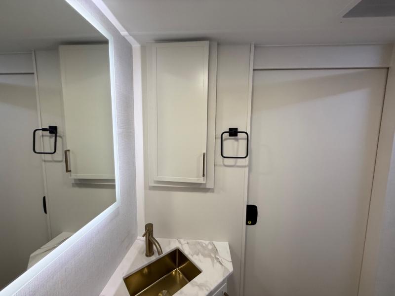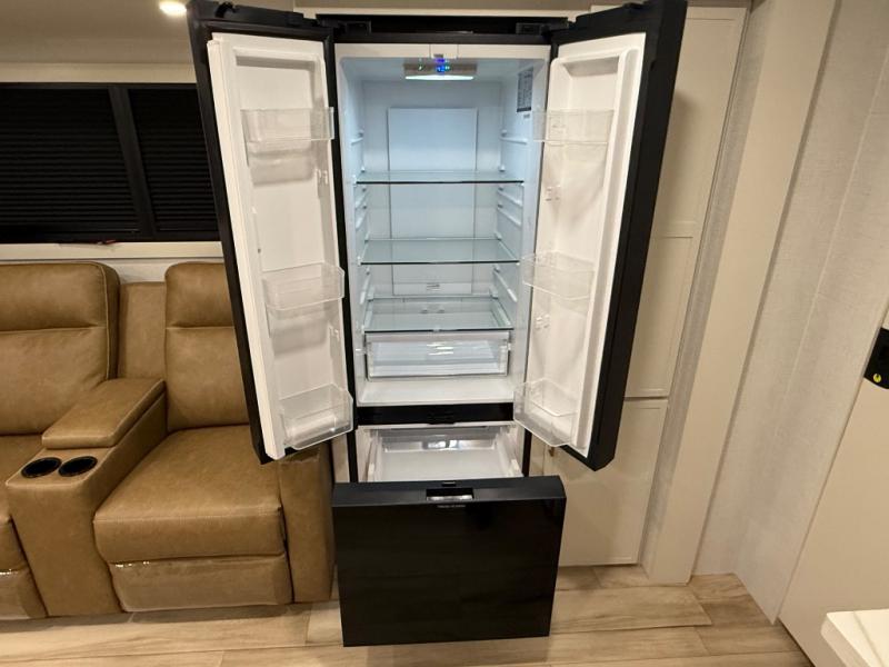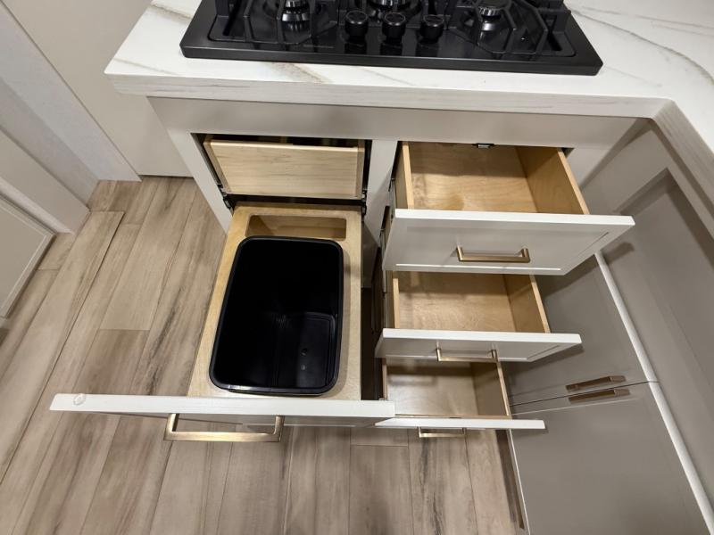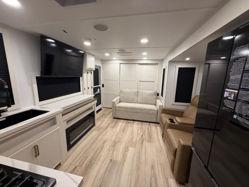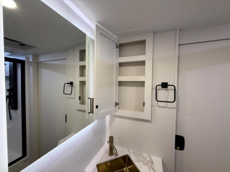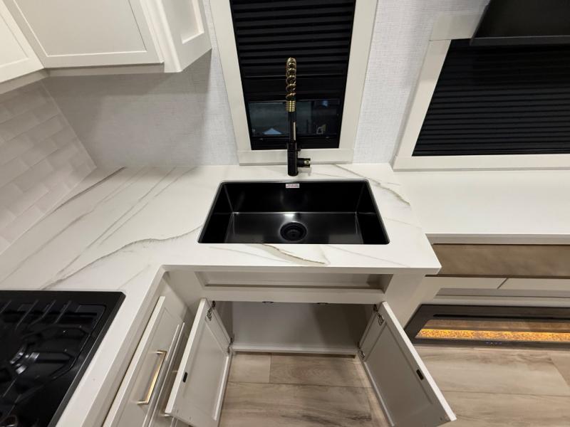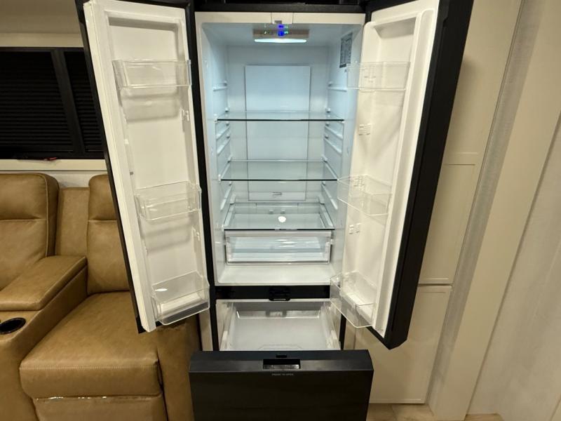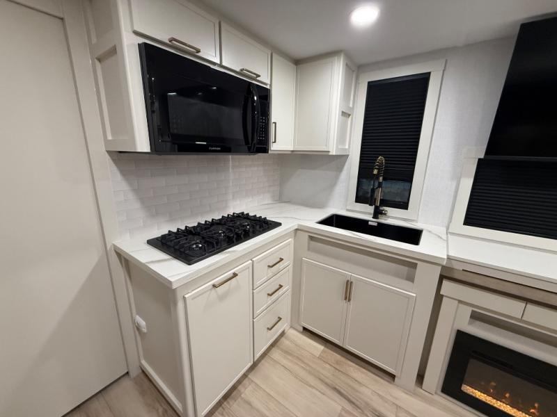 Grab the whole gang and head to the campground in this bunkhouse travel trailer! The 48" x 74" bunks can sleep two to four, and there is a floor to ceiling storage cabinet with drawers, a top bunk window, outlets and USB ports, plus double space-saving pocket doors. Up front you'll find the master bedroom with a 66" x 80" king bed and a MaxSpace Split-Level Wardrobe, TV prep, your own exterior entry door, plus quick access to the walk-thru bath. Everyone can meet in the combined kitchen and living room to relax on the theater seating or tri-fold sofa, and there is pull-out dining table with a drawer and a window above for great outdoor views. The outside is just as accommodating as the inside with its exterior speakers, LED chassis lighting, rear storage compartment with dual access doors, and exterior 12V refrigerator for cold drinks!