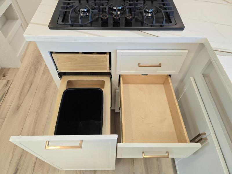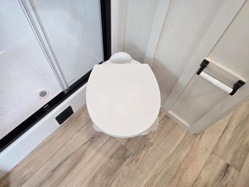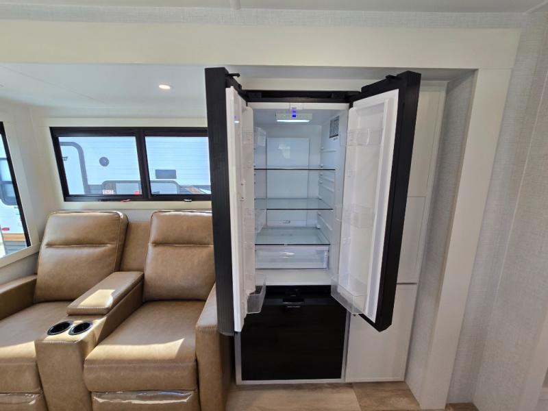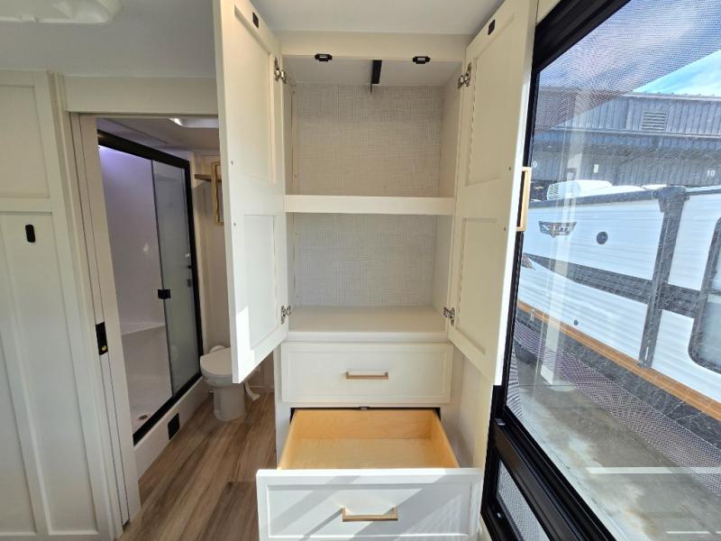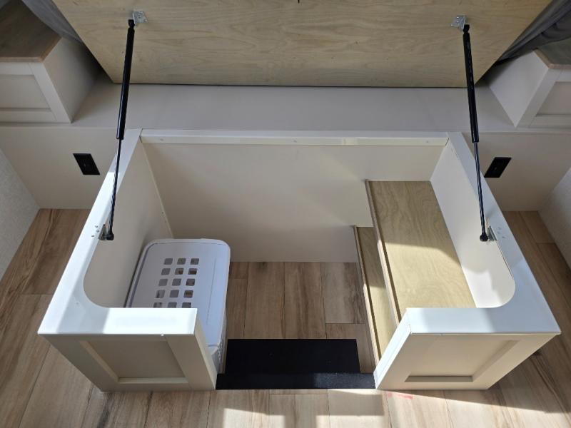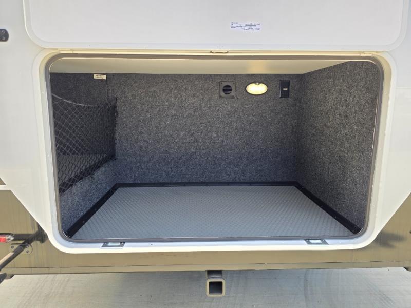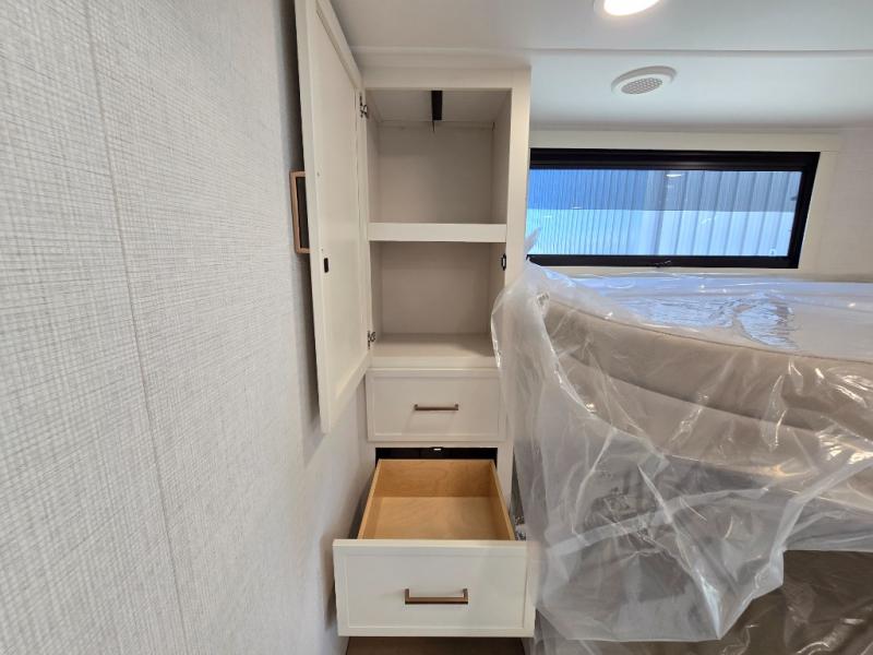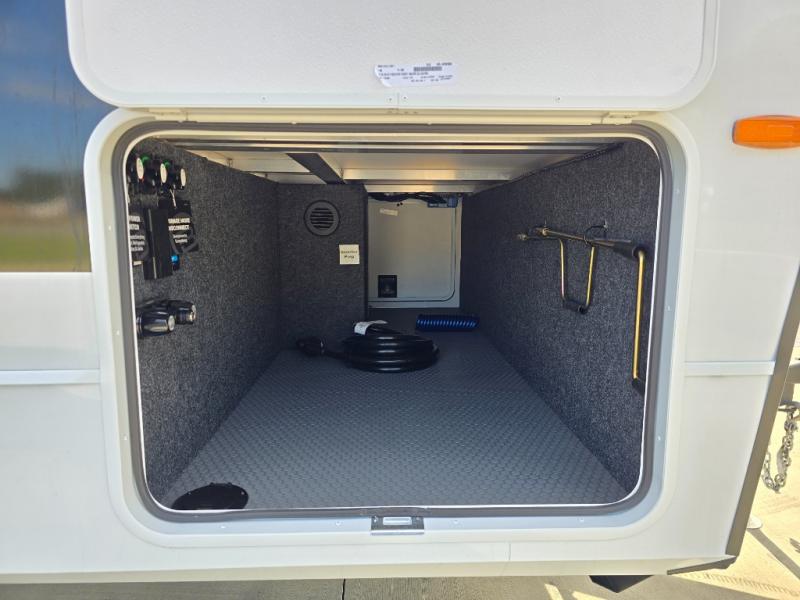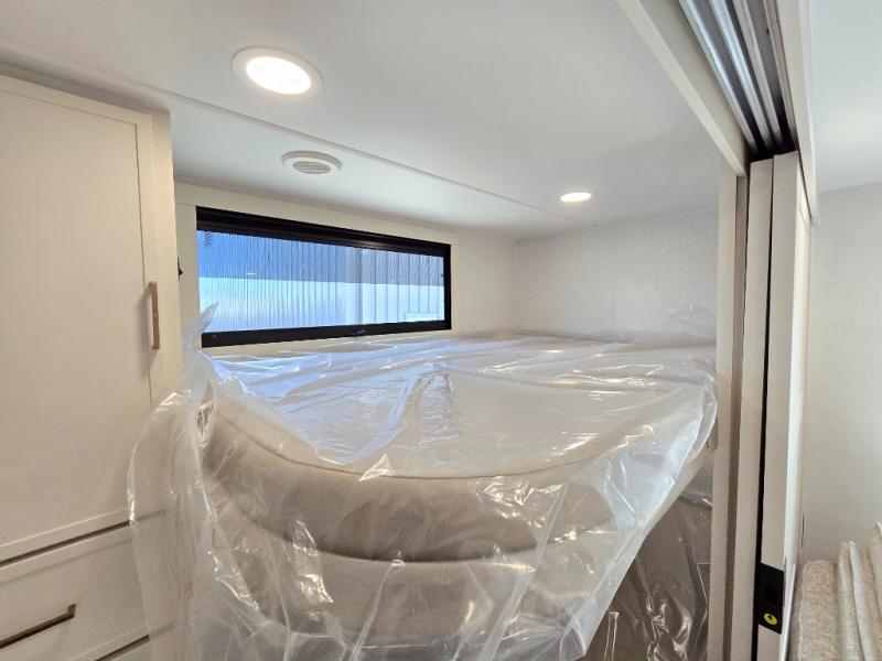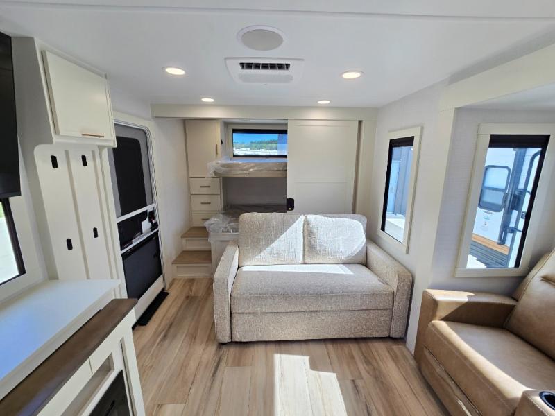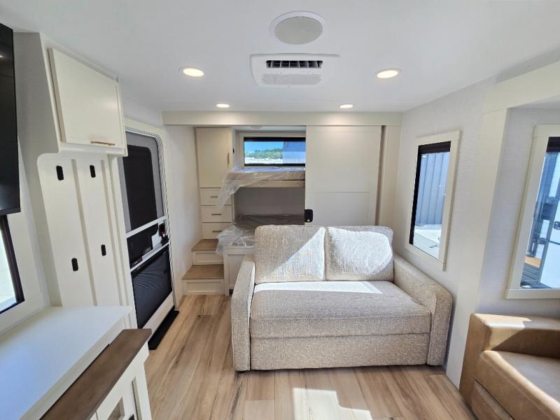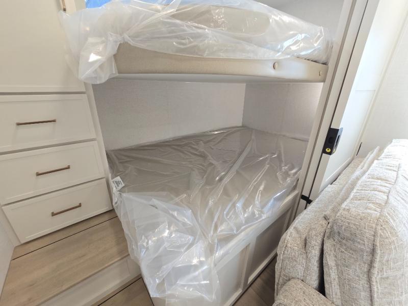 Grab the whole gang and head to the campground in this bunkhouse travel trailer! The 48" x 74" bunks can sleep two to four, and there is a floor to ceiling storage cabinet with drawers, a top bunk window, outlets and USB ports, plus double space-saving pocket doors. Up front you'll find the master bedroom with a 66" x 80" king bed and a MaxSpace Split-Level Wardrobe, TV prep, your own exterior entry door, plus quick access to the walk-thru bath. Everyone can meet in the combined kitchen and living room to relax on the theater seating or tri-fold sofa, and there is pull-out dining table with a drawer and a window above for great outdoor views. The outside is just as accommodating as the inside with its exterior speakers, LED chassis lighting, rear storage compartment with dual access doors, and exterior 12V refrigerator for cold drinks!