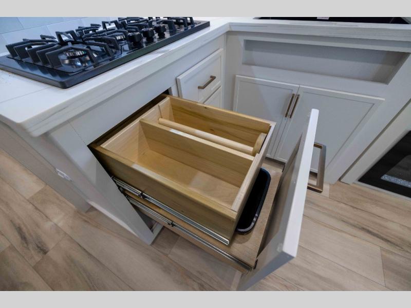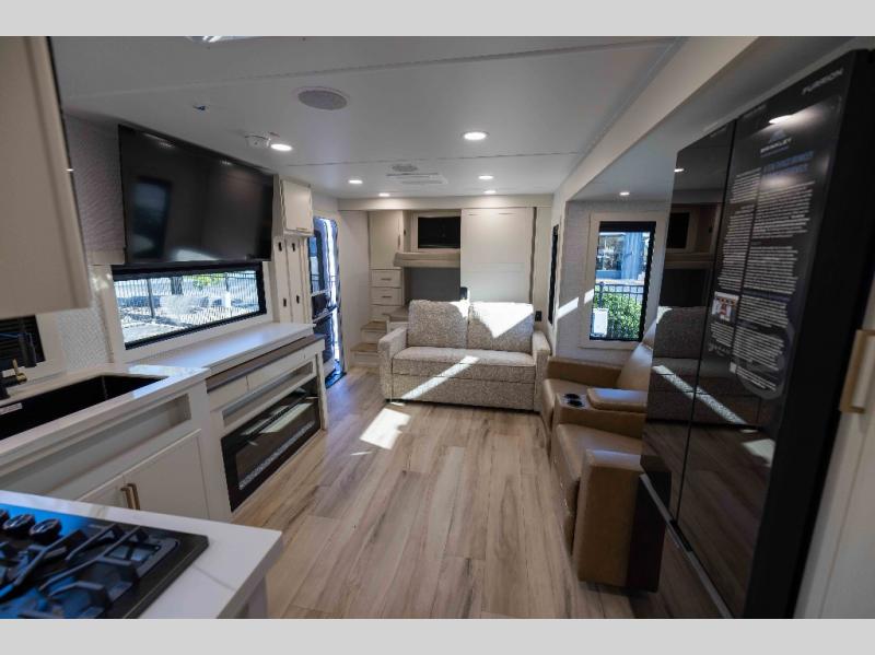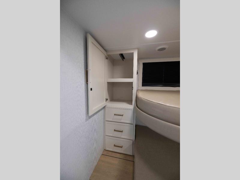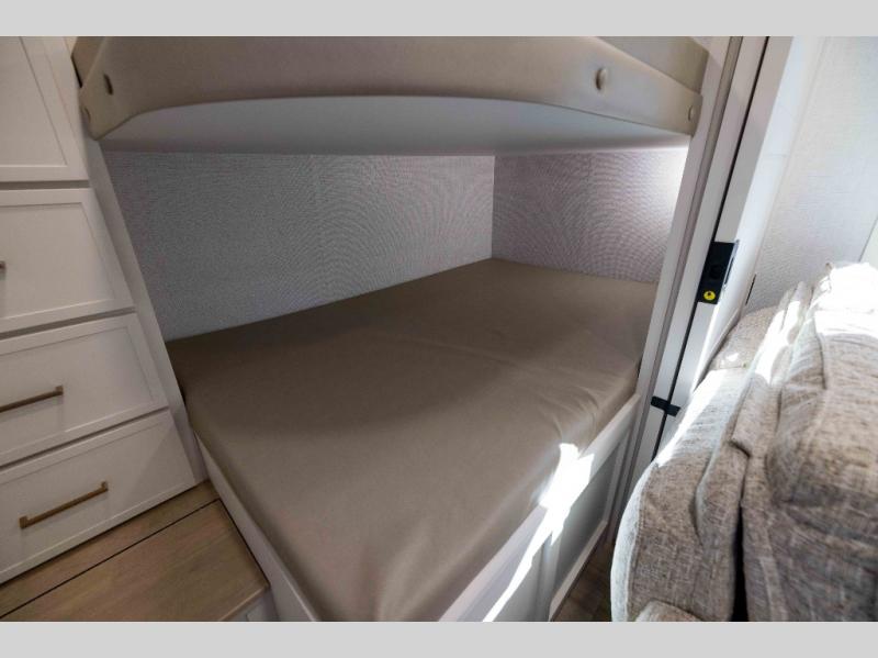 Grab the whole gang and head to the campground in this bunkhouse travel trailer! The 48" x 74" bunks can sleep two to four, and there is a floor to ceiling storage cabinet with drawers, a top bunk window, outlets and USB ports, plus double space-saving pocket doors. Up front you'll find the master bedroom with a 66" x 80" king bed and a MaxSpace Split-Level Wardrobe, TV prep, your own exterior entry door, plus quick access to the walk-thru bath. Everyone can meet in the combined kitchen and living room to relax on the theater seating or tri-fold sofa, and there is pull-out dining table with a drawer and a window above for great outdoor views. The outside is just as accommodating as the inside with its exterior speakers, LED chassis lighting, rear storage compartment with dual access doors, and exterior 12V refrigerator for cold drinks!