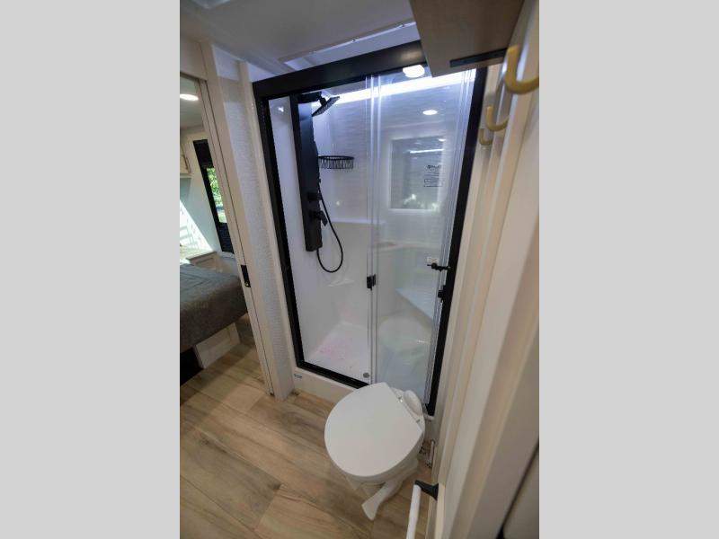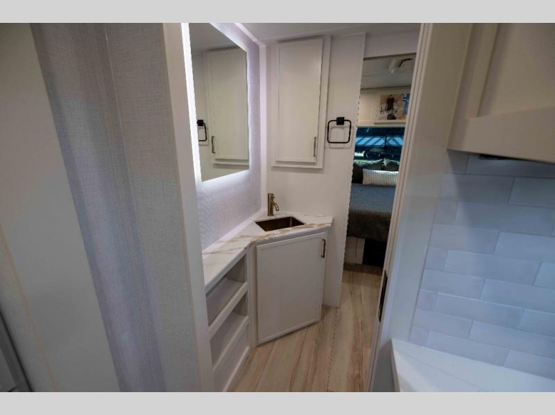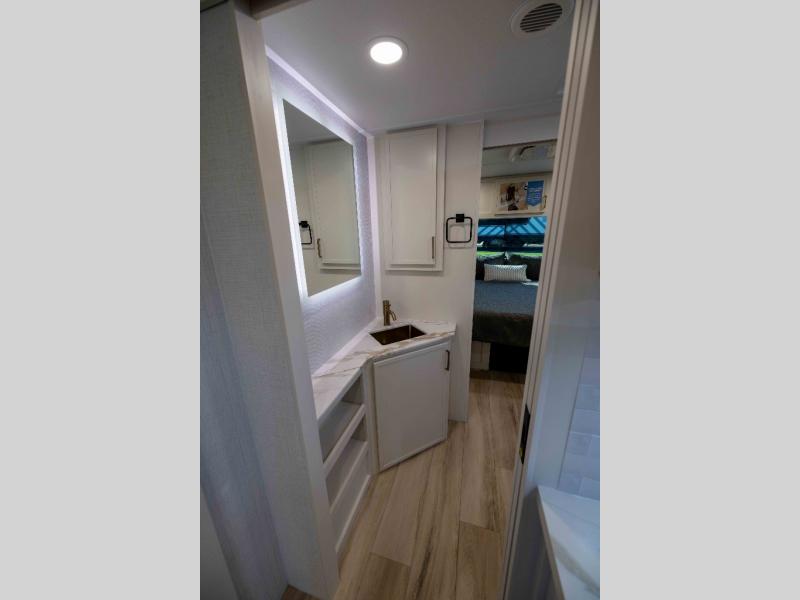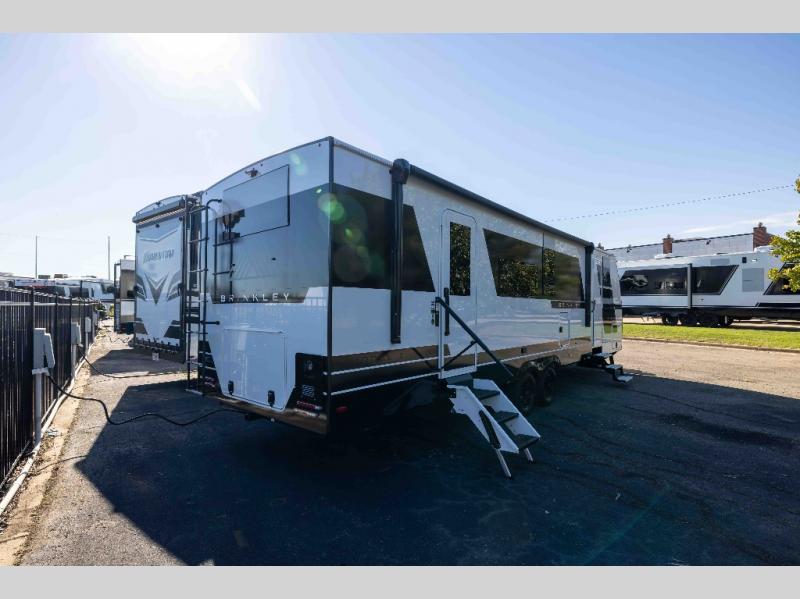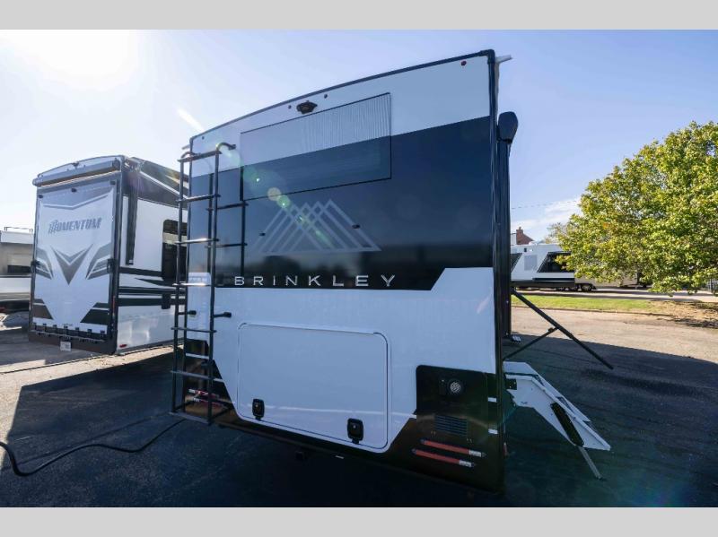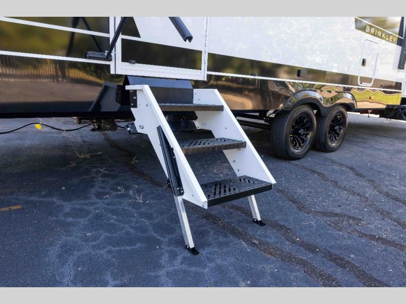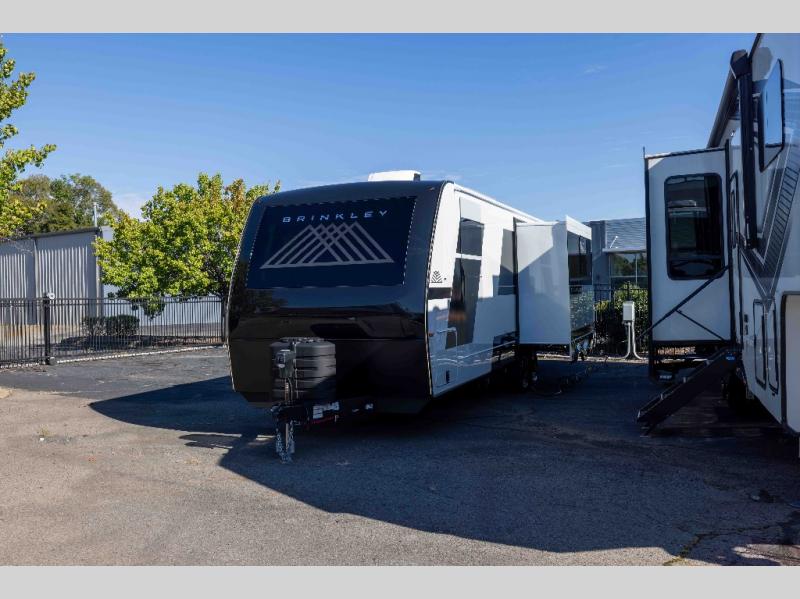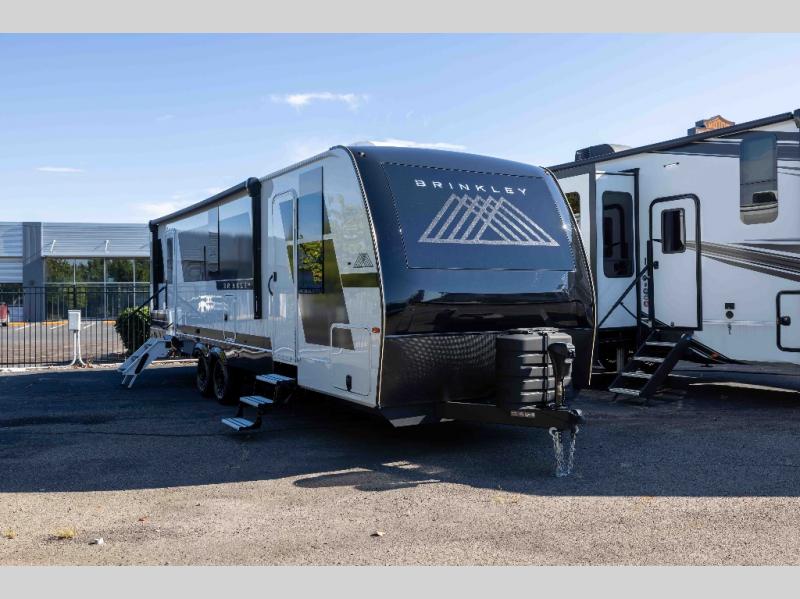The lightweight Model I travel trailer by Brinkley is the perfect choice for those looking for an easy tow and at-home comforts! There is a drop-frame chassis, high-performance Road Armor suspension equalizer system, and Demco EZ Latch trailer coupler that automatically latches when dropped onto a hitch ball without the need of a safety pin. Additional exterior features include square Euro frameless windows, automotive-grade paint, full-width LED strip lighting in the pass-thru, and a pet & property security campside tie-down to keep your gear and furry friends safe. Inside, you'll be wowed by Brinkley's CraftSense wood trim construction, residential solid surface kitchen countertops, dimmable bedroom lights, and marine-grade neon LED shower lighting to name a few stand-out features!