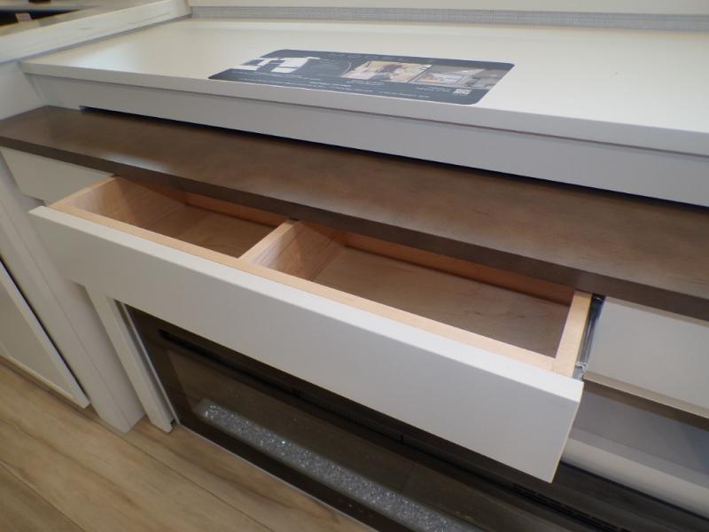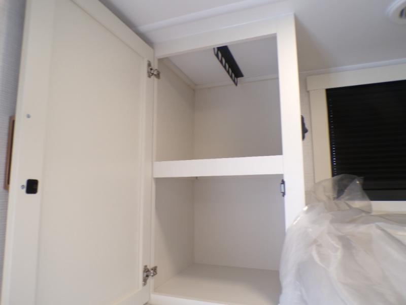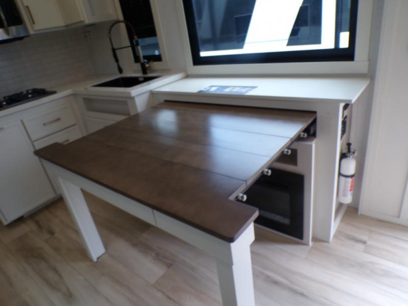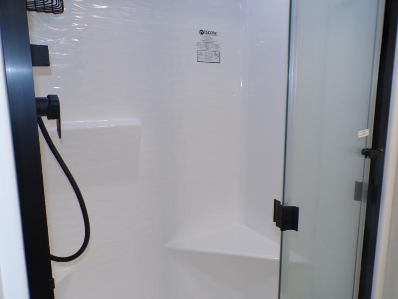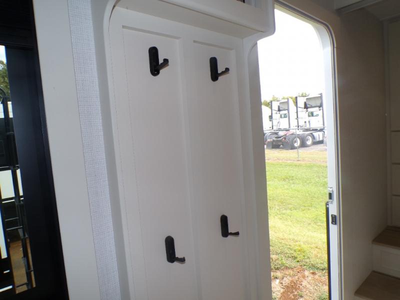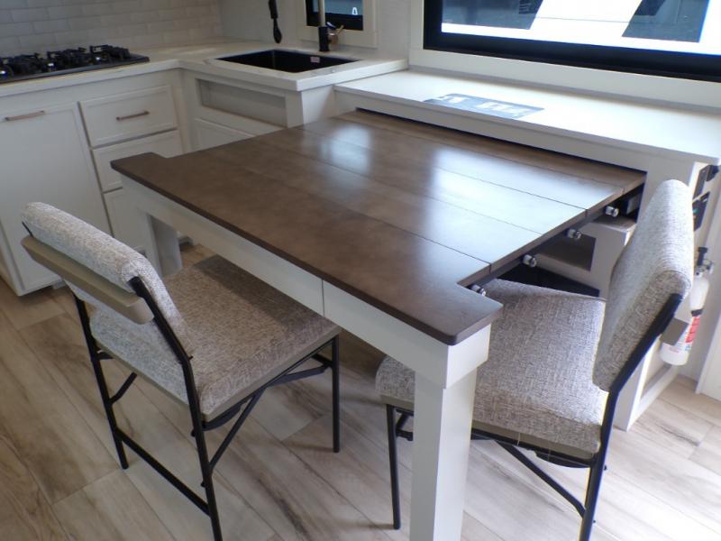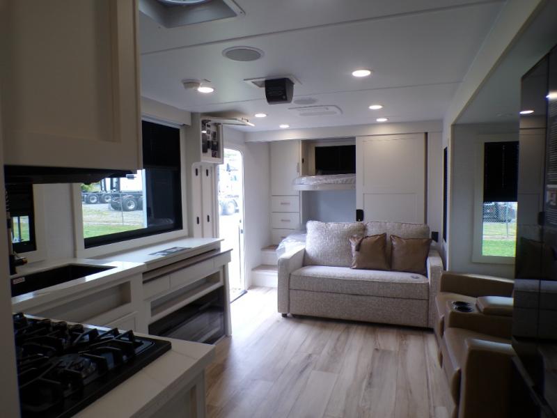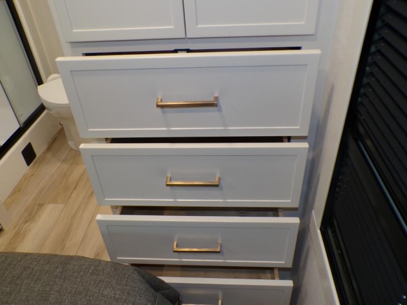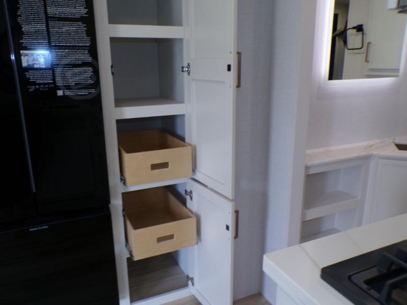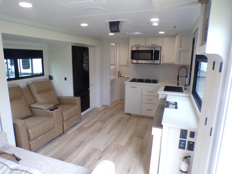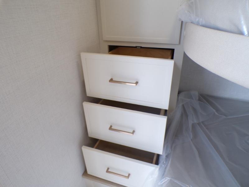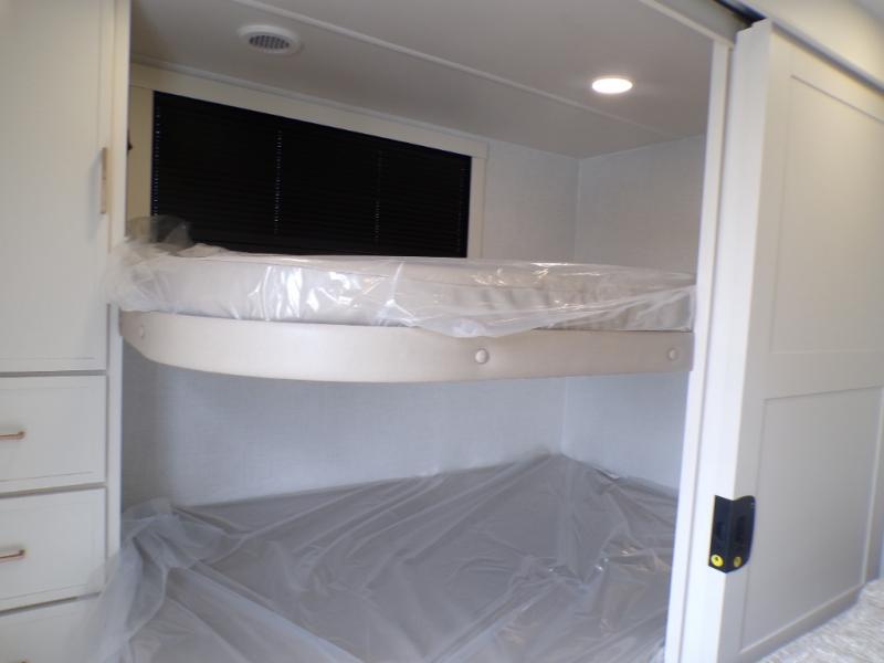 Grab the whole gang and head to the campground in this bunkhouse travel trailer! The 48" x 74" bunks can sleep two to four, and there is a floor to ceiling storage cabinet with drawers, a top bunk window, outlets and USB ports, plus double space-saving pocket doors. Up front you'll find the master bedroom with a 66" x 80" king bed and a MaxSpace Split-Level Wardrobe, TV prep, your own exterior entry door, plus quick access to the walk-thru bath. Everyone can meet in the combined kitchen and living room to relax on the theater seating or tri-fold sofa, and there is pull-out dining table with a drawer and a window above for great outdoor views. The outside is just as accommodating as the inside with its exterior speakers, LED chassis lighting, rear storage compartment with dual access doors, and exterior 12V refrigerator for cold drinks!