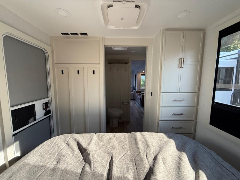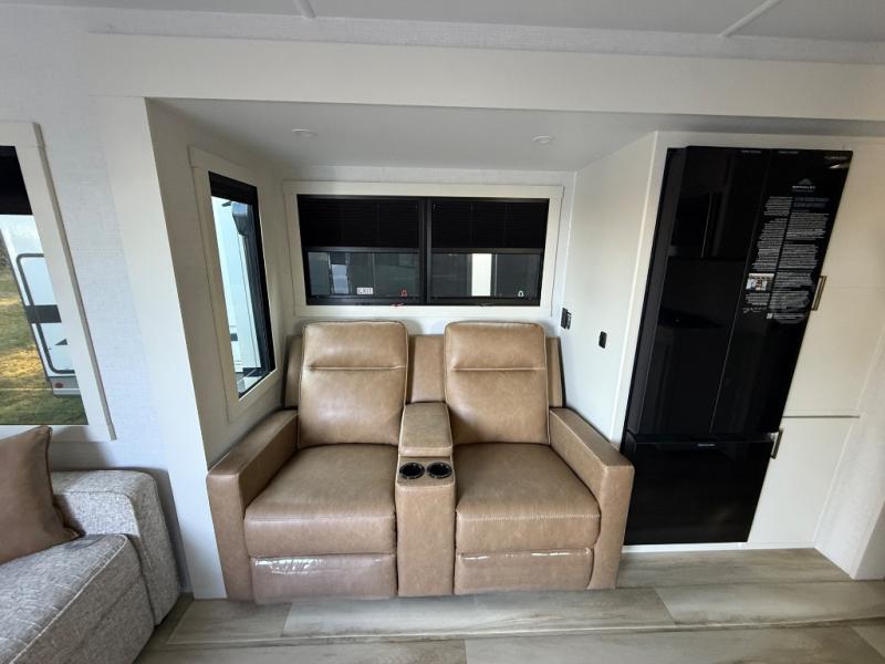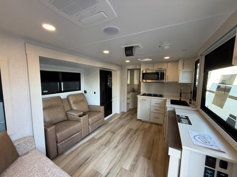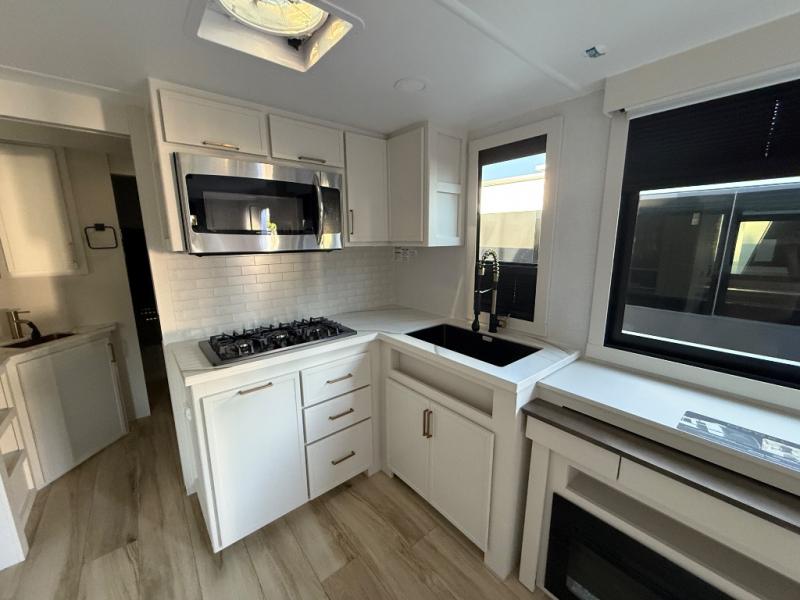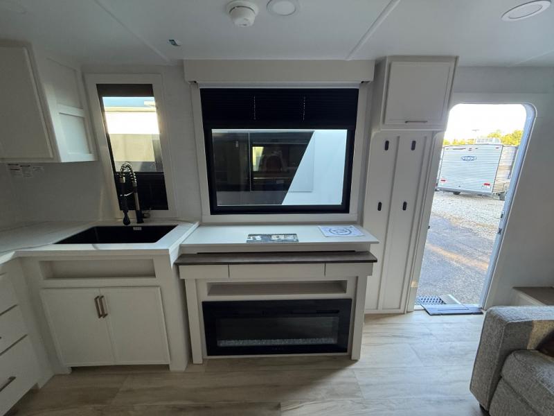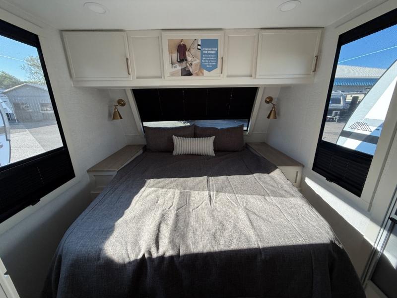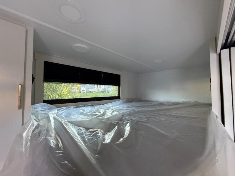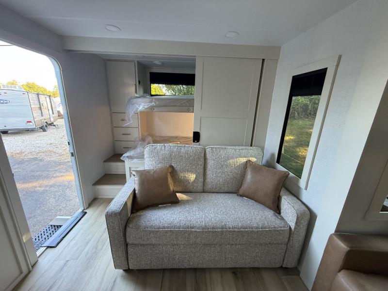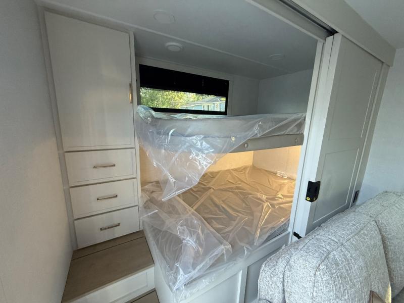 Grab the whole gang and head to the campground in this bunkhouse travel trailer! The 48" x 74" bunks can sleep two to four, and there is a floor to ceiling storage cabinet with drawers, a top bunk window, outlets and USB ports, plus double space-saving pocket doors. Up front you'll find the master bedroom with a 66" x 80" king bed and a MaxSpace Split-Level Wardrobe, TV prep, your own exterior entry door, plus quick access to the walk-thru bath. Everyone can meet in the combined kitchen and living room to relax on the theater seating or tri-fold sofa, and there is pull-out dining table with a drawer and a window above for great outdoor views. The outside is just as accommodating as the inside with its exterior speakers, LED chassis lighting, rear storage compartment with dual access doors, and exterior 12V refrigerator for cold drinks!