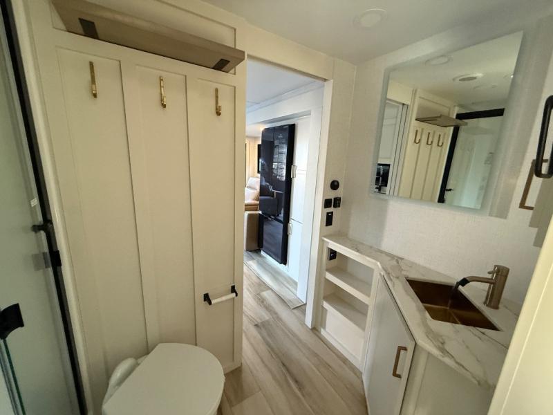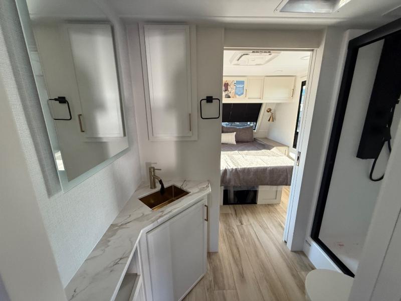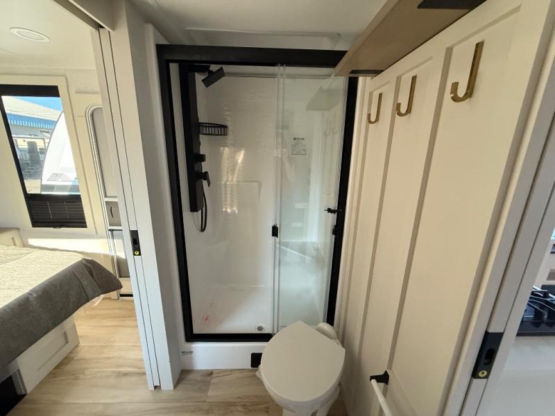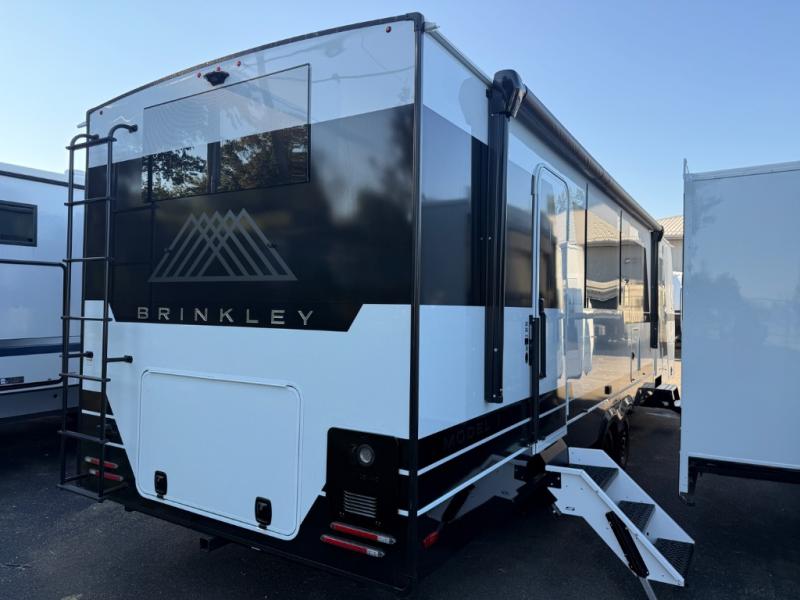 The lightweight Model I travel trailer by Brinkley is the perfect choice for those looking for an easy tow and at-home comforts! There is a drop-frame chassis, high-performance Road Armor suspension equalizer system, and Demco EZ Latch trailer coupler that automatically latches when dropped onto a hitch ball without the need of a safety pin. Additional exterior features include square Euro frameless windows, automotive-grade paint, full-width LED strip lighting in the pass-thru, and a pet & property security campside tie-down to keep your gear and furry friends safe. Inside, you'll be wowed by Brinkley's CraftSense wood trim construction, residential solid surface kitchen countertops, dimmable bedroom lights, and marine-grade neon LED shower lighting to name a few stand-out features!