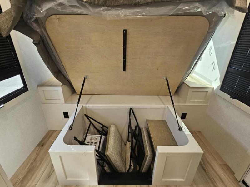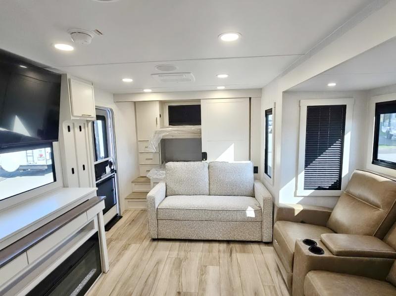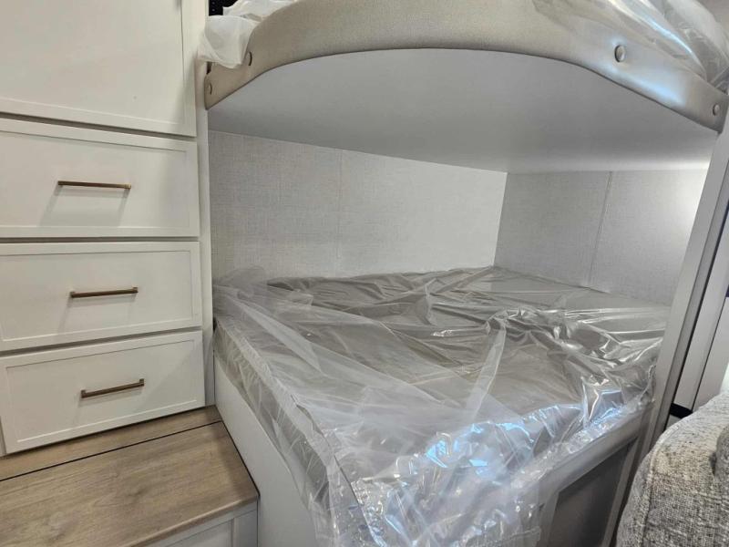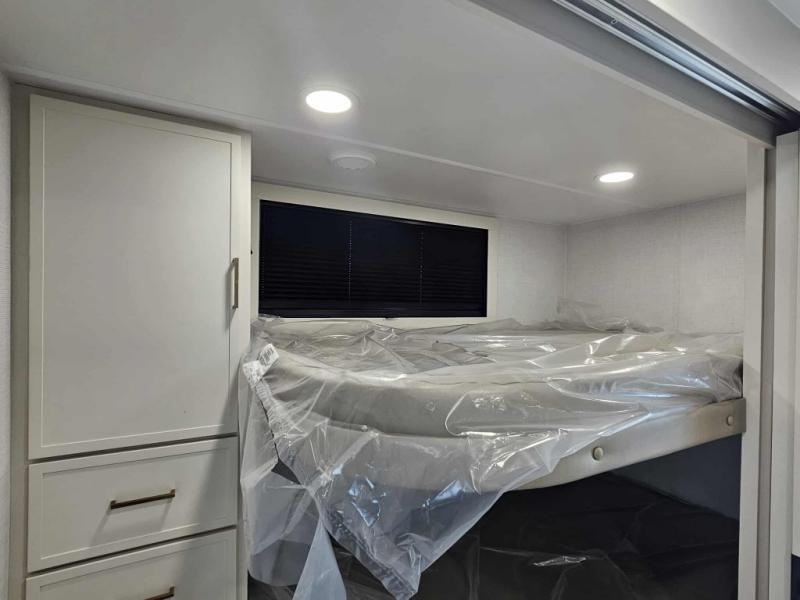 Grab the whole gang and head to the campground in this bunkhouse travel trailer! The 48" x 74" bunks can sleep two to four, and there is a floor to ceiling storage cabinet with drawers, a top bunk window, outlets and USB ports, plus double space-saving pocket doors. Up front you'll find the master bedroom with a 66" x 80" king bed and a MaxSpace Split-Level Wardrobe, TV prep, your own exterior entry door, plus quick access to the walk-thru bath. Everyone can meet in the combined kitchen and living room to relax on the theater seating or tri-fold sofa, and there is pull-out dining table with a drawer and a window above for great outdoor views. The outside is just as accommodating as the inside with its exterior speakers, LED chassis lighting, rear storage compartment with dual access doors, and exterior 12V refrigerator for cold drinks!