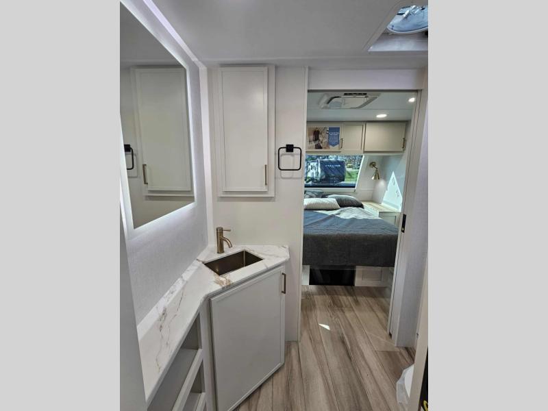 The lightweight Model I travel trailer by Brinkley is the perfect choice for those looking for an easy tow and at-home comforts! There is a drop-frame chassis, high-performance Road Armor suspension equalizer system, and Demco EZ Latch trailer coupler that automatically latches when dropped onto a hitch ball without the need of a safety pin. Additional exterior features include square Euro frameless windows, automotive-grade paint, full-width LED strip lighting in the pass-thru, and a pet & property security campside tie-down to keep your gear and furry friends safe. Inside, you'll be wowed by Brinkley's CraftSense wood trim construction, residential solid surface kitchen countertops, dimmable bedroom lights, and marine-grade neon LED shower lighting to name a few stand-out features!