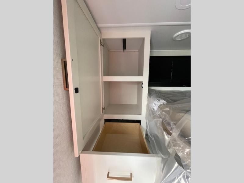 Grab the whole gang and head to the campground in this bunkhouse travel trailer! The 48" x 74" bunks can sleep two to four, and there is a floor to ceiling storage cabinet with drawers, a top bunk window, outlets and USB ports, plus double space-saving pocket doors. Up front you'll find the master bedroom with a 66" x 80" king bed and a MaxSpace Split-Level Wardrobe, TV prep, your own exterior entry door, plus quick access to the walk-thru bath. Everyone can meet in the combined kitchen and living room to relax on the theater seating or tri-fold sofa, and there is pull-out dining table with a drawer and a window above for great outdoor views. The outside is just as accommodating as the inside with its exterior speakers, LED chassis lighting, rear storage compartment with dual access doors, and exterior 12V refrigerator for cold drinks!