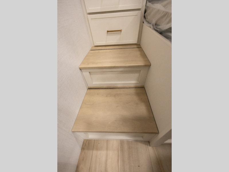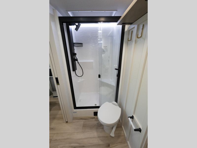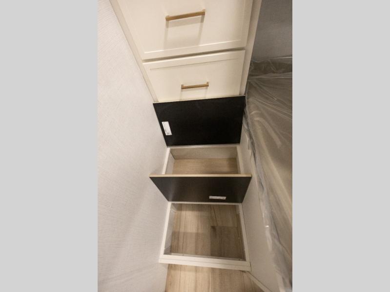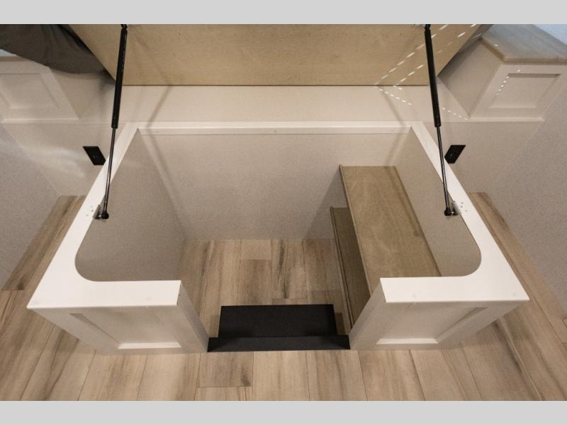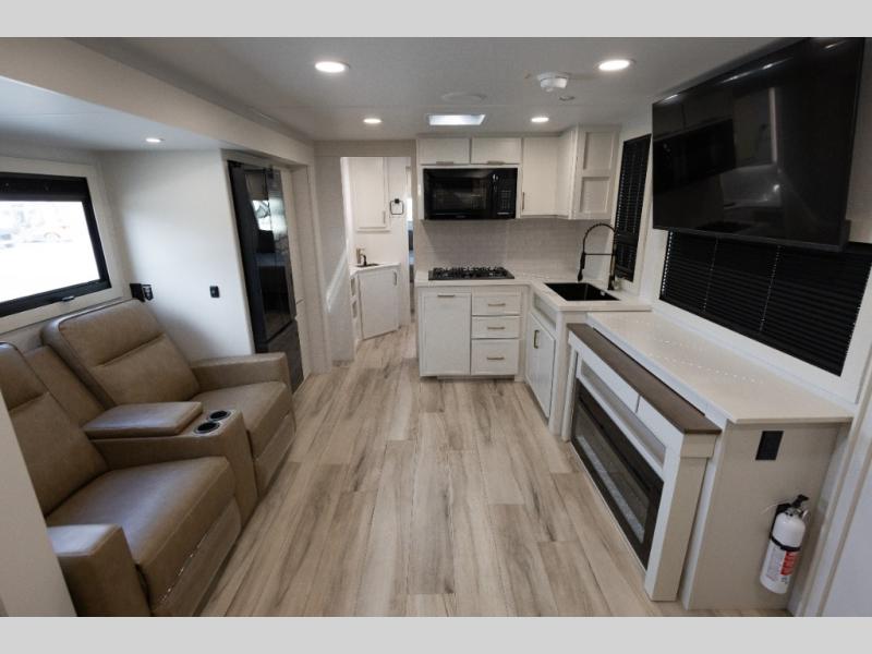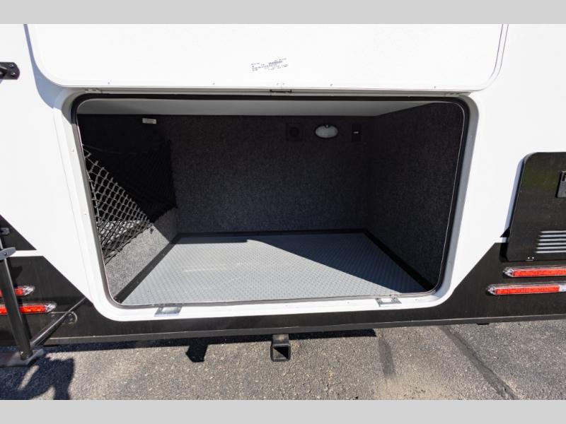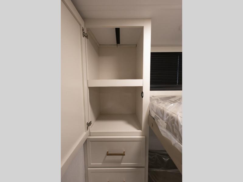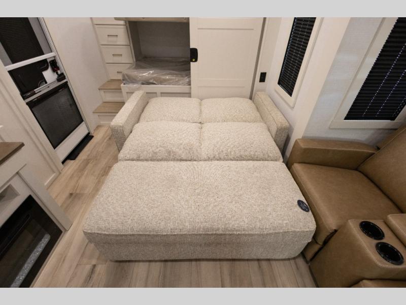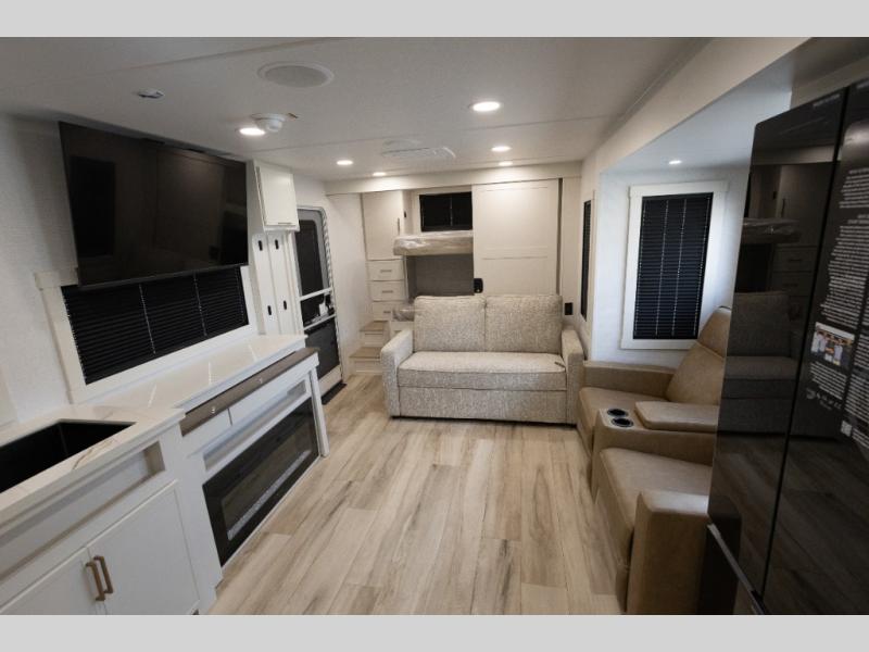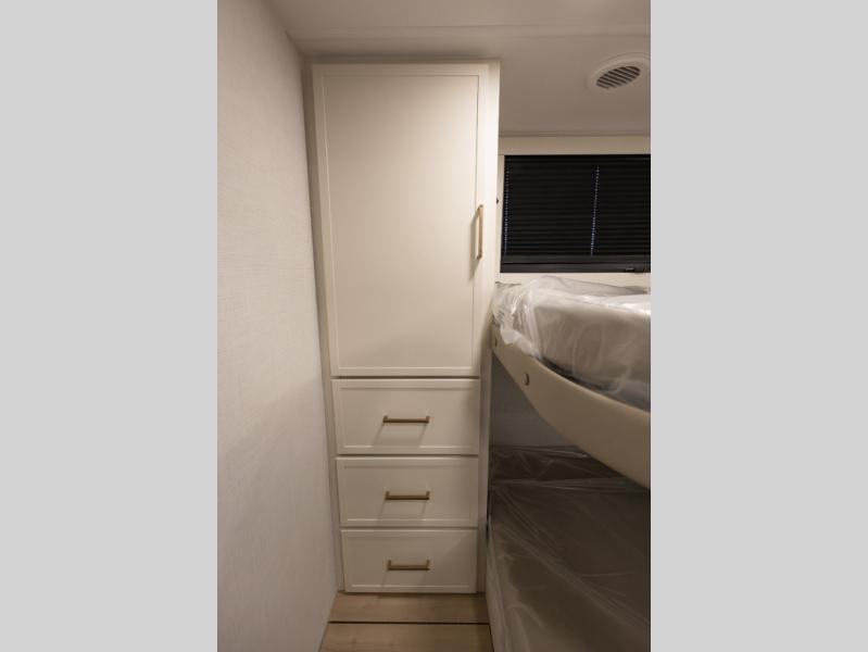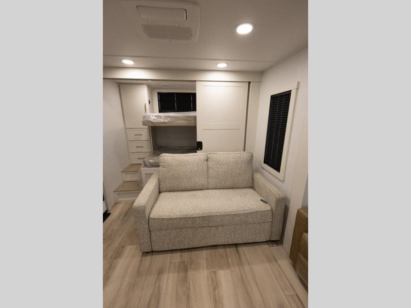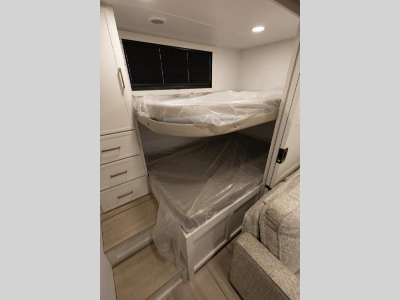 Grab the whole gang and head to the campground in this bunkhouse travel trailer! The 48" x 74" bunks can sleep two to four, and there is a floor to ceiling storage cabinet with drawers, a top bunk window, outlets and USB ports, plus double space-saving pocket doors. Up front you'll find the master bedroom with a 66" x 80" king bed and a MaxSpace Split-Level Wardrobe, TV prep, your own exterior entry door, plus quick access to the walk-thru bath. Everyone can meet in the combined kitchen and living room to relax on the theater seating or tri-fold sofa, and there is pull-out dining table with a drawer and a window above for great outdoor views. The outside is just as accommodating as the inside with its exterior speakers, LED chassis lighting, rear storage compartment with dual access doors, and exterior 12V refrigerator for cold drinks!