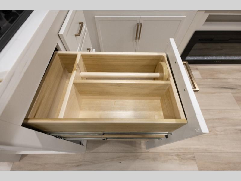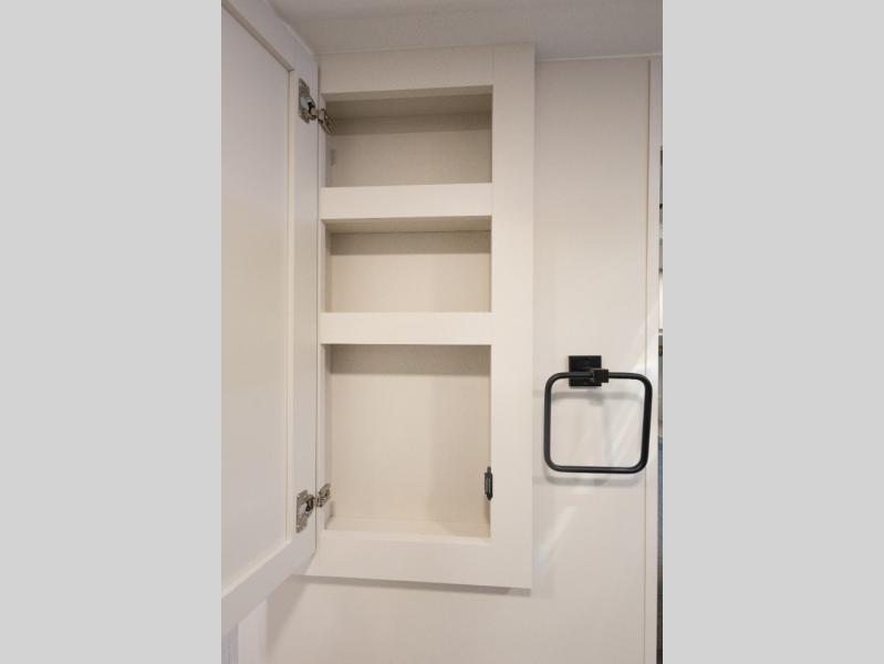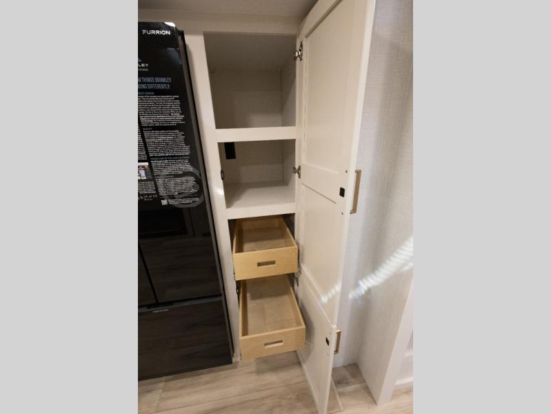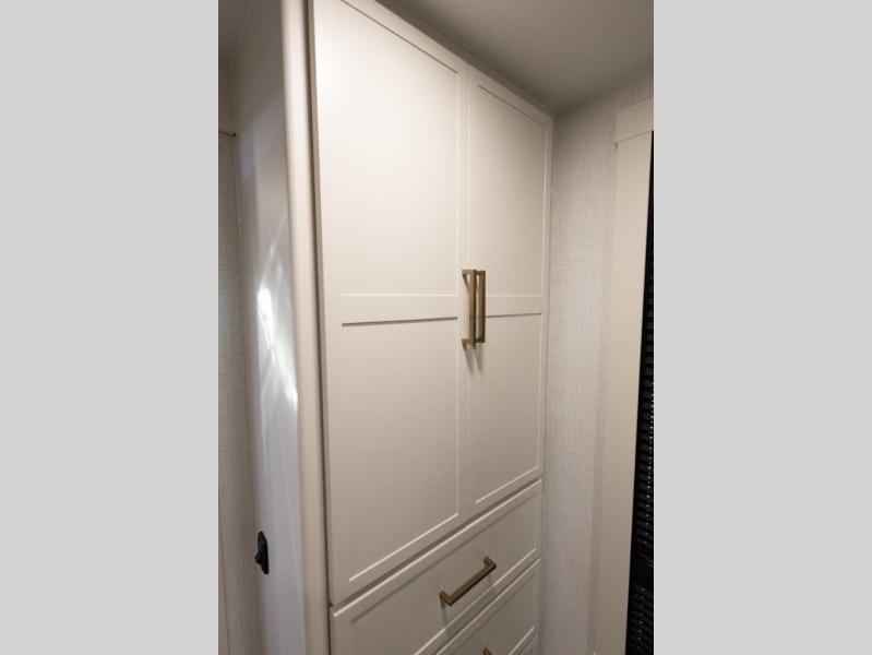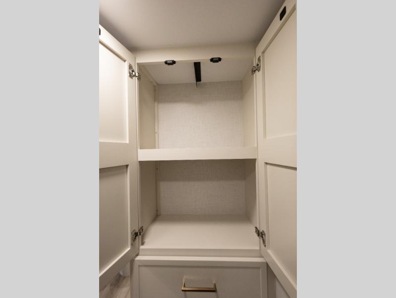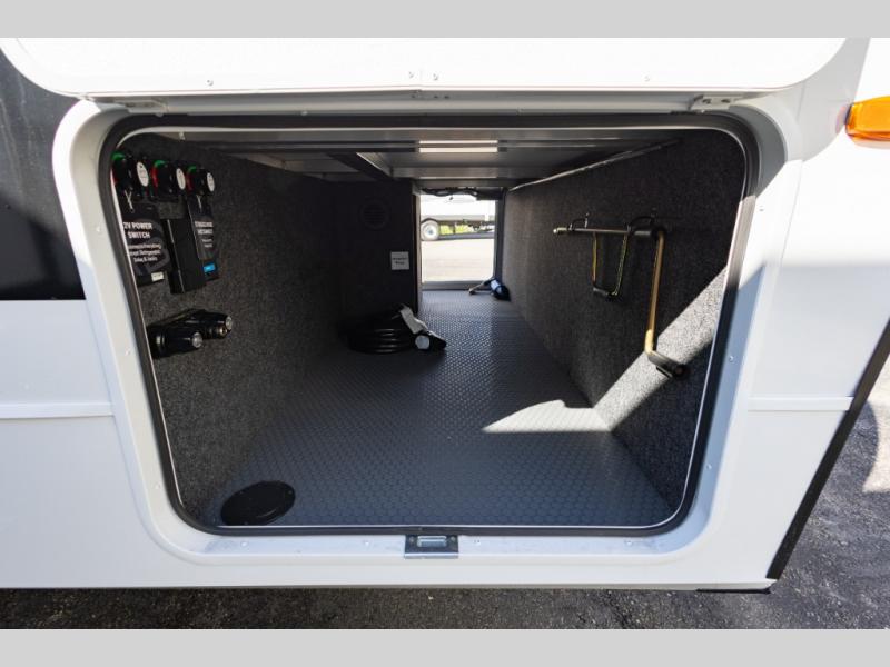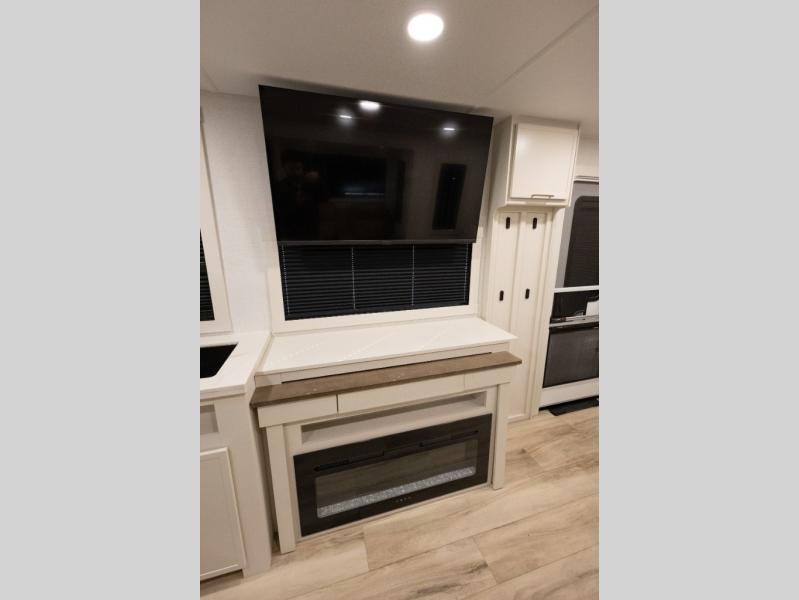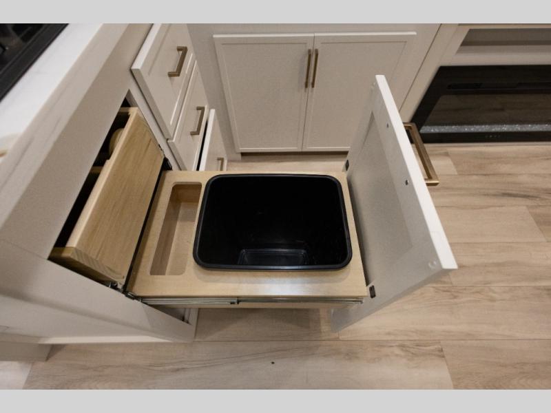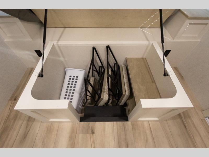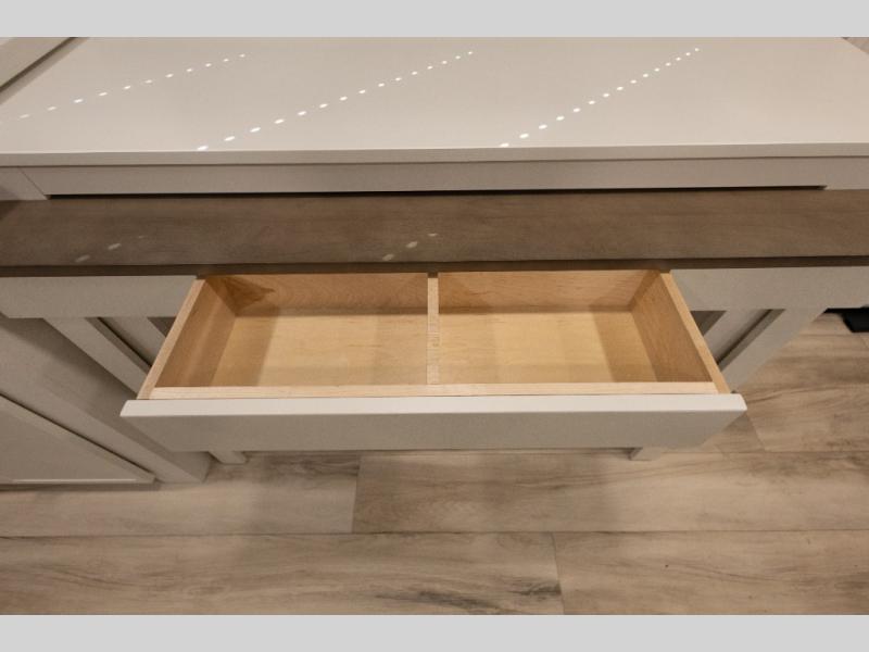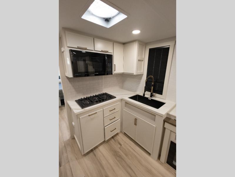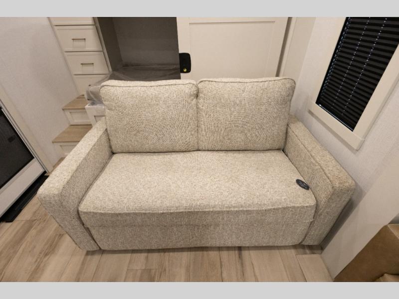Grab the whole gang and head to the campground in this bunkhouse travel trailer! The 48" x 74" bunks can sleep two to four, and there is a floor to ceiling storage cabinet with drawers, a top bunk window, outlets and USB ports, plus double space-saving pocket doors. Up front you'll find the master bedroom with a 66" x 80" king bed and a MaxSpace Split-Level Wardrobe, TV prep, your own exterior entry door, plus quick access to the walk-thru bath. Everyone can meet in the combined kitchen and living room to relax on the theater seating or tri-fold sofa, and there is pull-out dining table with a drawer and a window above for great outdoor views. The outside is just as accommodating as the inside with its exterior speakers, LED chassis lighting, rear storage compartment with dual access doors, and exterior 12V refrigerator for cold drinks!