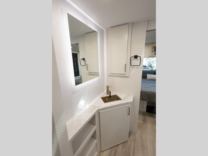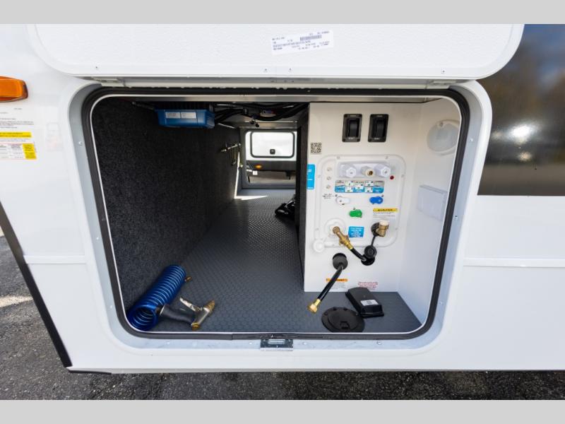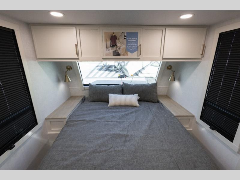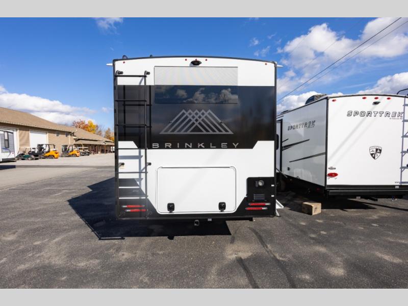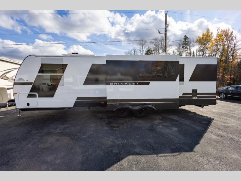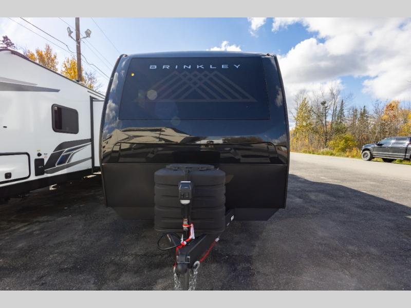 The lightweight Model I travel trailer by Brinkley is the perfect choice for those looking for an easy tow and at-home comforts! There is a drop-frame chassis, high-performance Road Armor suspension equalizer system, and Demco EZ Latch trailer coupler that automatically latches when dropped onto a hitch ball without the need of a safety pin. Additional exterior features include square Euro frameless windows, automotive-grade paint, full-width LED strip lighting in the pass-thru, and a pet & property security campside tie-down to keep your gear and furry friends safe. Inside, you'll be wowed by Brinkley's CraftSense wood trim construction, residential solid surface kitchen countertops, dimmable bedroom lights, and marine-grade neon LED shower lighting to name a few stand-out features!