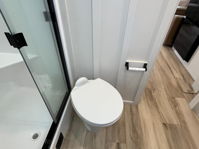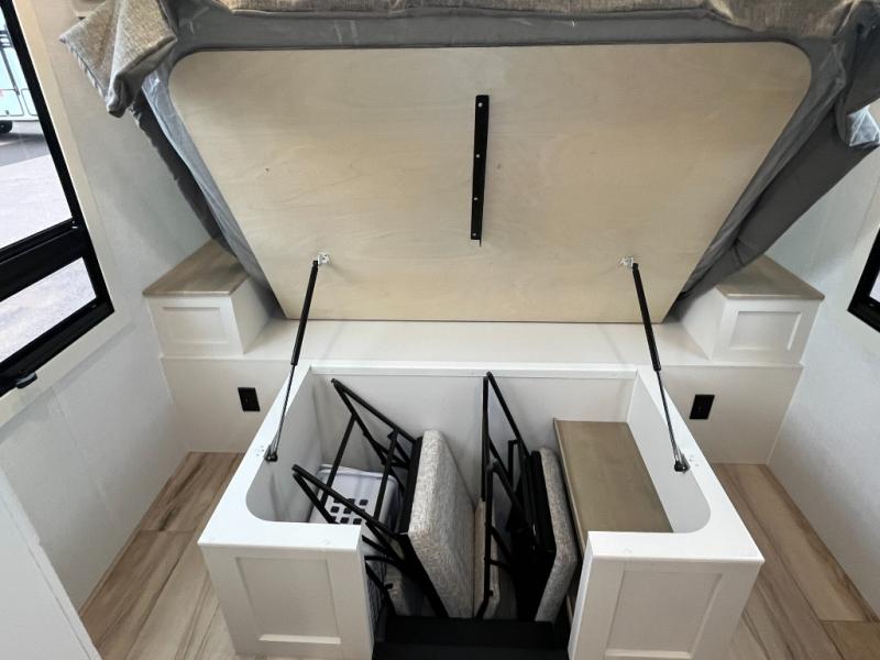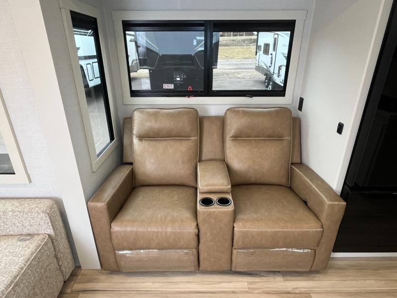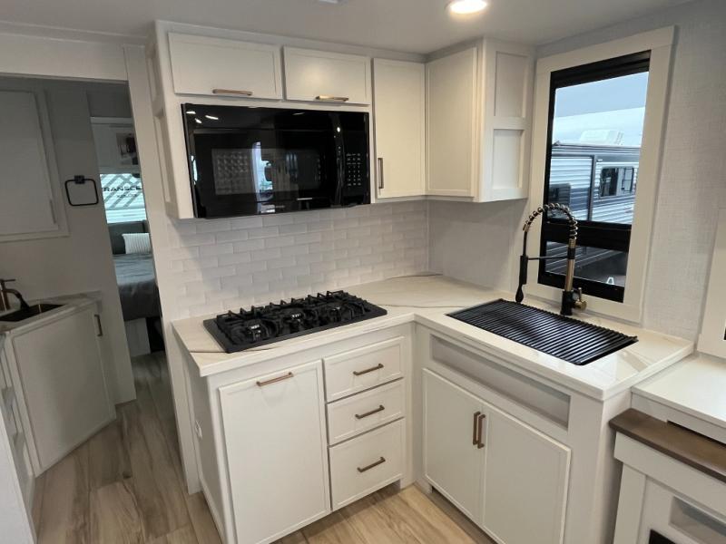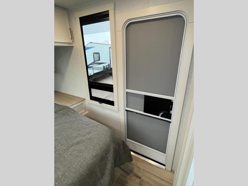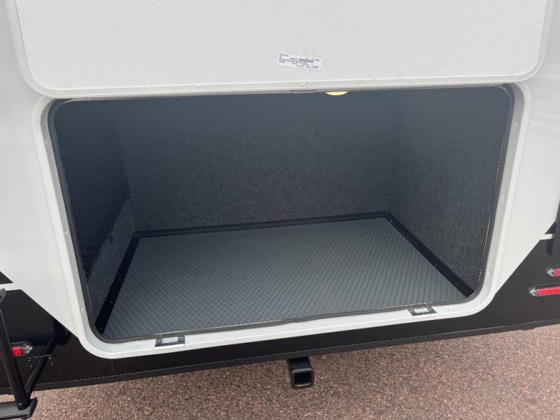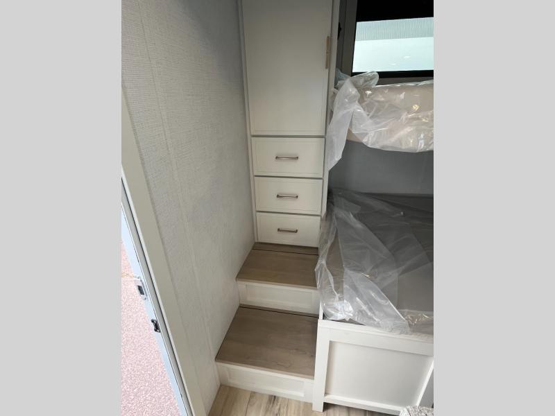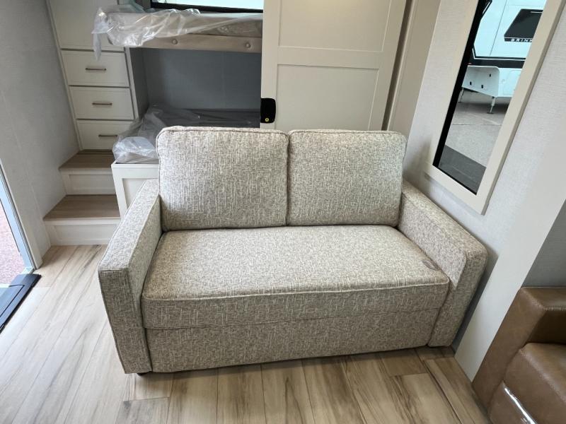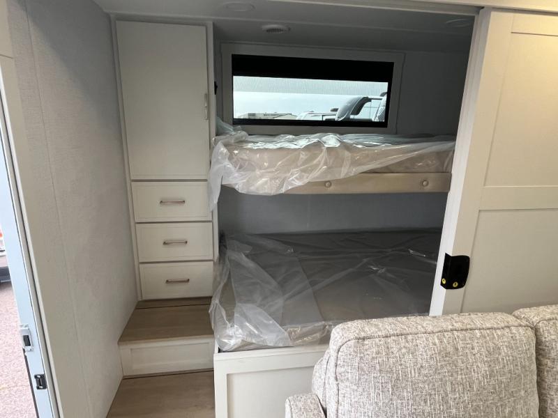 Grab the whole gang and head to the campground in this bunkhouse travel trailer! The 48" x 74" bunks can sleep two to four, and there is a floor to ceiling storage cabinet with drawers, a top bunk window, outlets and USB ports, plus double space-saving pocket doors. Up front you'll find the master bedroom with a 66" x 80" king bed and a MaxSpace Split-Level Wardrobe, TV prep, your own exterior entry door, plus quick access to the walk-thru bath. Everyone can meet in the combined kitchen and living room to relax on the theater seating or tri-fold sofa, and there is pull-out dining table with a drawer and a window above for great outdoor views. The outside is just as accommodating as the inside with its exterior speakers, LED chassis lighting, rear storage compartment with dual access doors, and exterior 12V refrigerator for cold drinks!