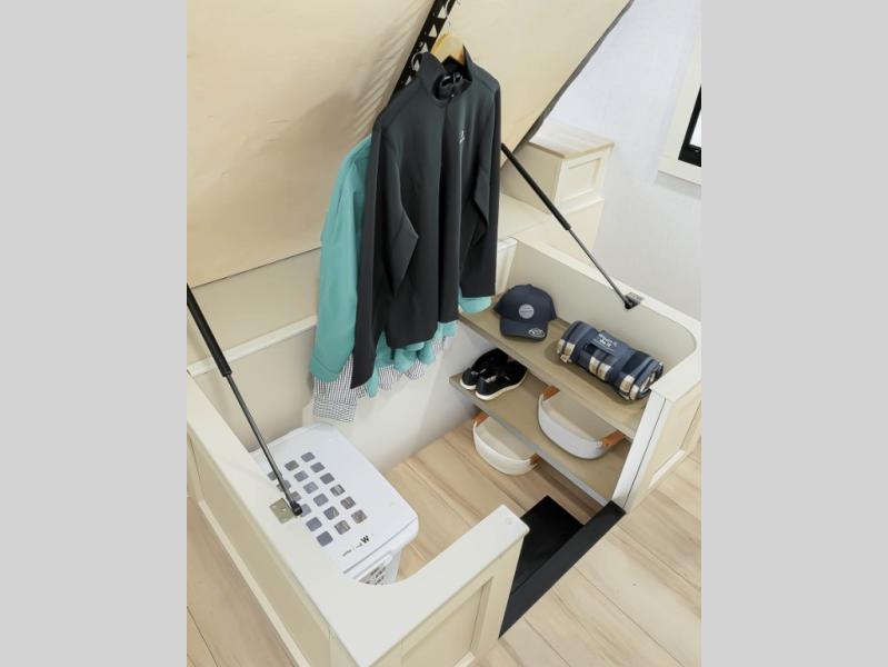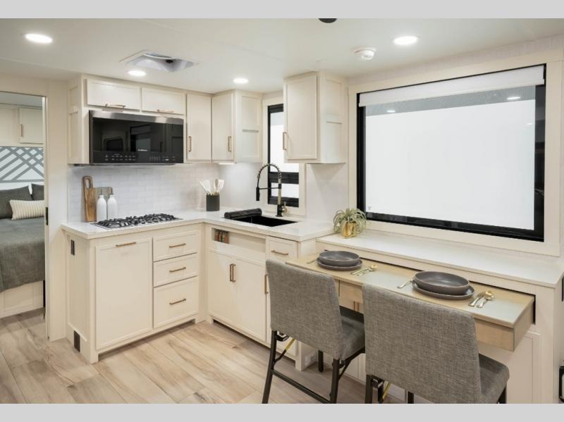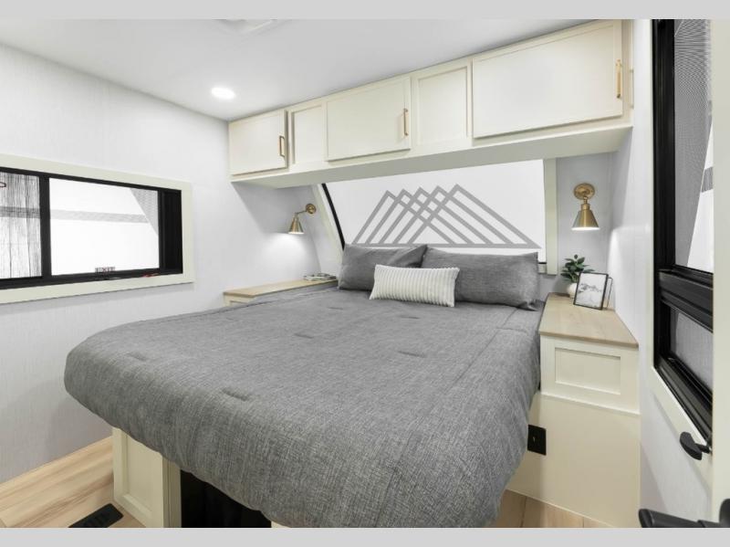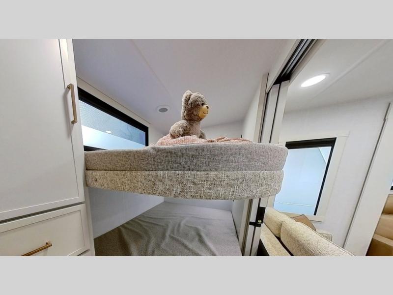 Grab the whole gang and head to the campground in this bunkhouse travel trailer! The 48" x 74" bunks can sleep two to four, and there is a floor to ceiling storage cabinet with drawers, a top bunk window, outlets and USB ports, plus double space-saving pocket doors. Up front you'll find the master bedroom with a 66" x 80" king bed and a MaxSpace Split-Level Wardrobe, TV prep, your own exterior entry door, plus quick access to the walk-thru bath. Everyone can meet in the combined kitchen and living room to relax on the theater seating or tri-fold sofa, and there is pull-out dining table with a drawer and a window above for great outdoor views. The outside is just as accommodating as the inside with its exterior speakers, LED chassis lighting, rear storage compartment with dual access doors, and exterior 12V refrigerator for cold drinks!