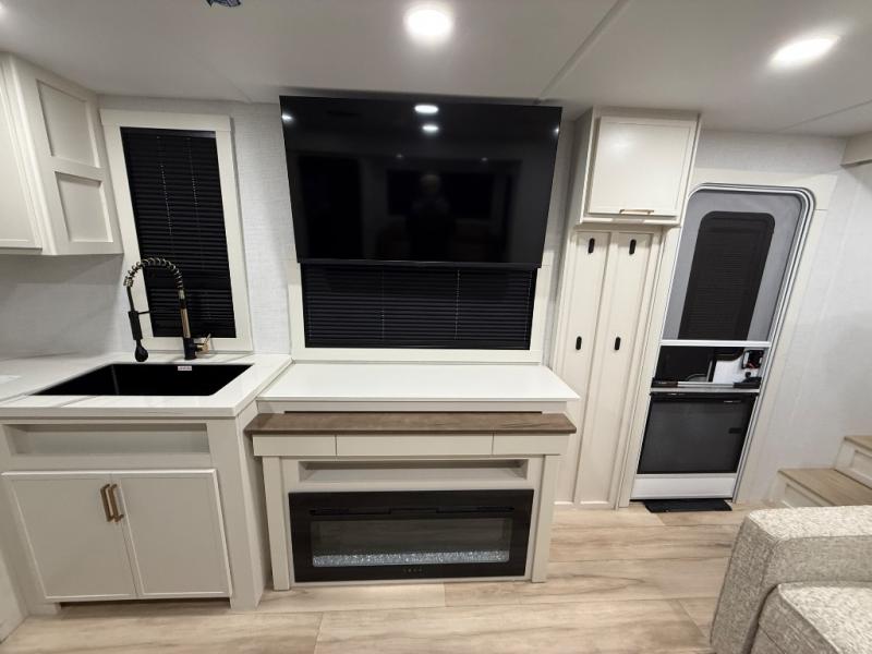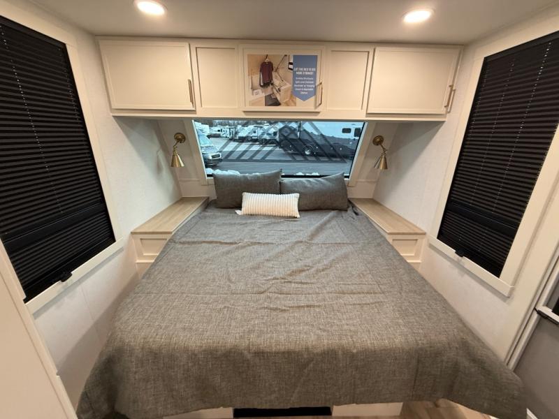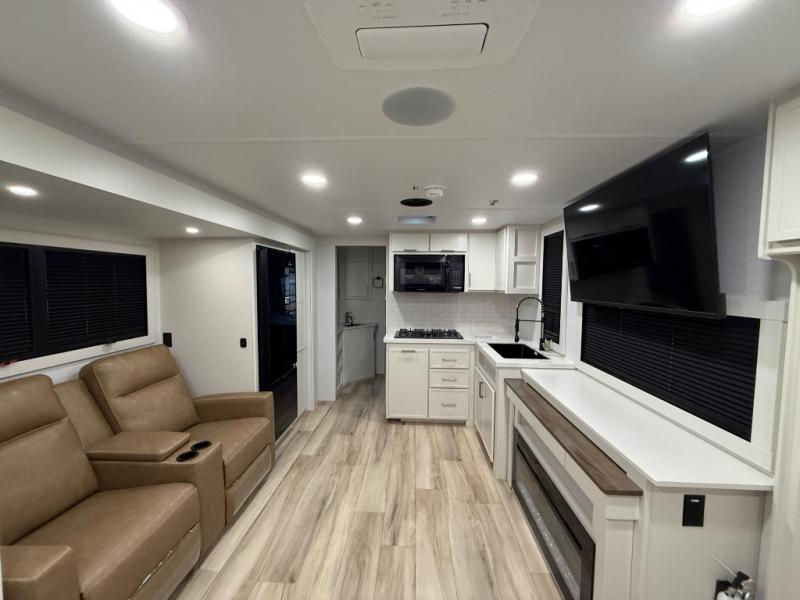 Grab the whole gang and head to the campground in this bunkhouse travel trailer! The 48" x 74" bunks can sleep two to four, and there is a floor to ceiling storage cabinet with drawers, a top bunk window, outlets and USB ports, plus double space-saving pocket doors. Up front you'll find the master bedroom with a 66" x 80" king bed and a MaxSpace Split-Level Wardrobe, TV prep, your own exterior entry door, plus quick access to the walk-thru bath. Everyone can meet in the combined kitchen and living room to relax on the theater seating or tri-fold sofa, and there is pull-out dining table with a drawer and a window above for great outdoor views. The outside is just as accommodating as the inside with its exterior speakers, LED chassis lighting, rear storage compartment with dual access doors, and exterior 12V refrigerator for cold drinks!