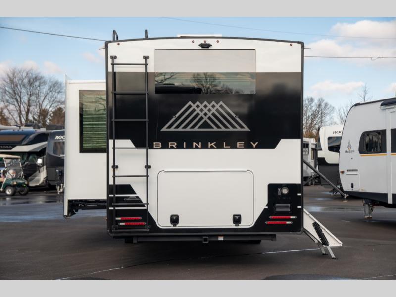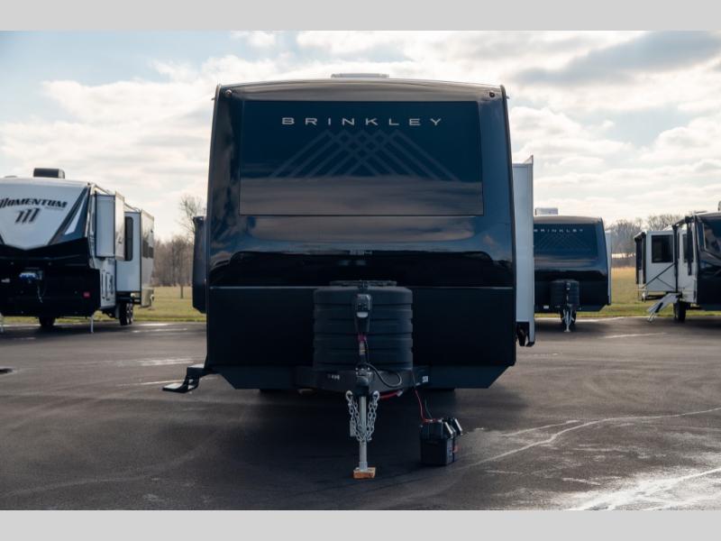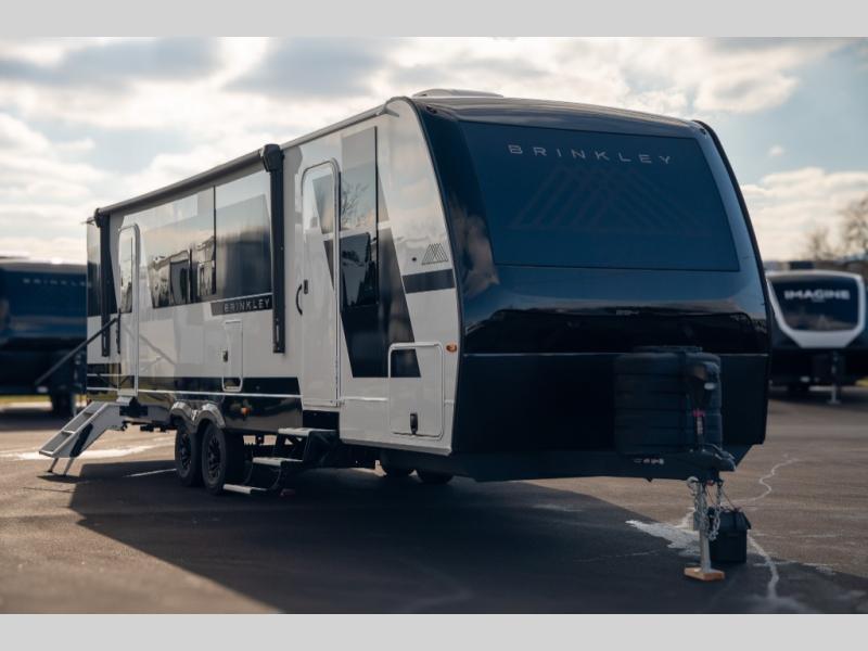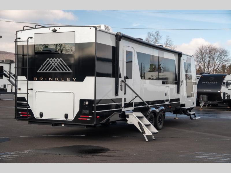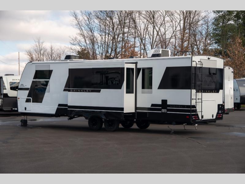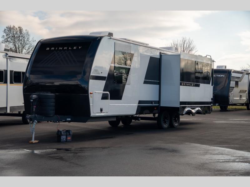 The lightweight Model I travel trailer by Brinkley is the perfect choice for those looking for an easy tow and at-home comforts! There is a drop-frame chassis, high-performance Road Armor suspension equalizer system, and Demco EZ Latch trailer coupler that automatically latches when dropped onto a hitch ball without the need of a safety pin. Additional exterior features include square Euro frameless windows, automotive-grade paint, full-width LED strip lighting in the pass-thru, and a pet & property security campside tie-down to keep your gear and furry friends safe. Inside, you'll be wowed by Brinkley's CraftSense wood trim construction, residential solid surface kitchen countertops, dimmable bedroom lights, and marine-grade neon LED shower lighting to name a few stand-out features!