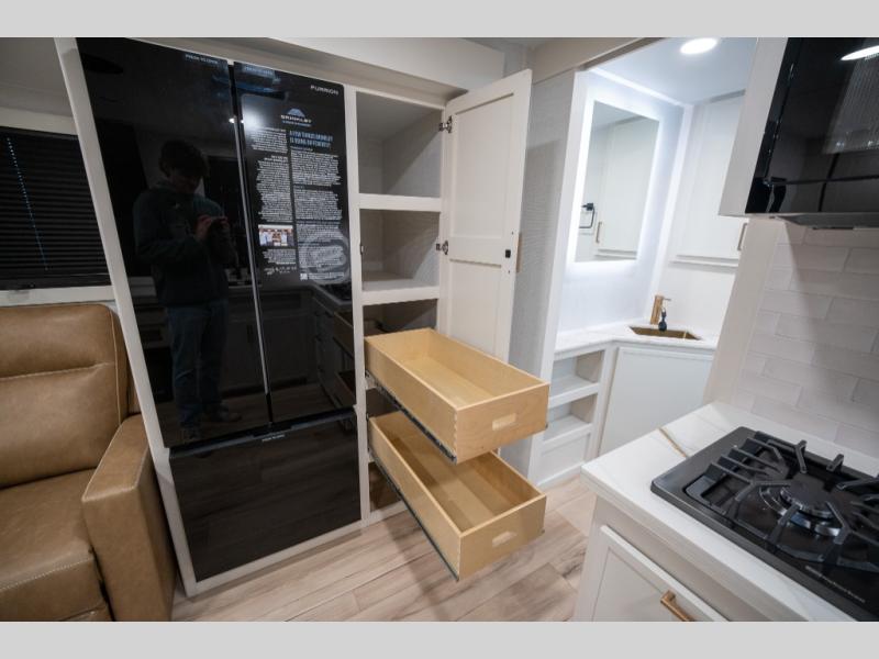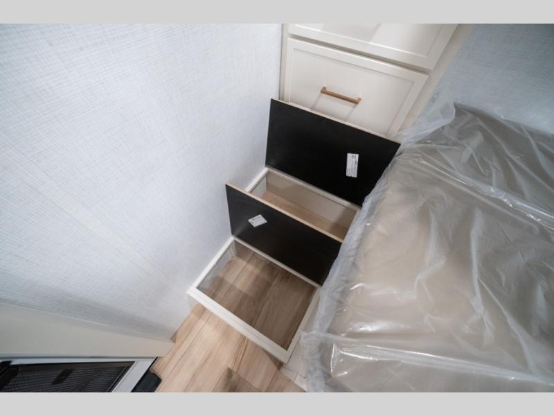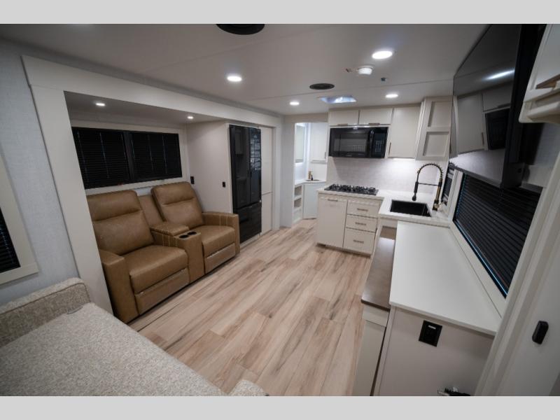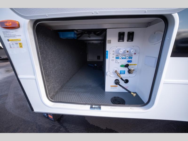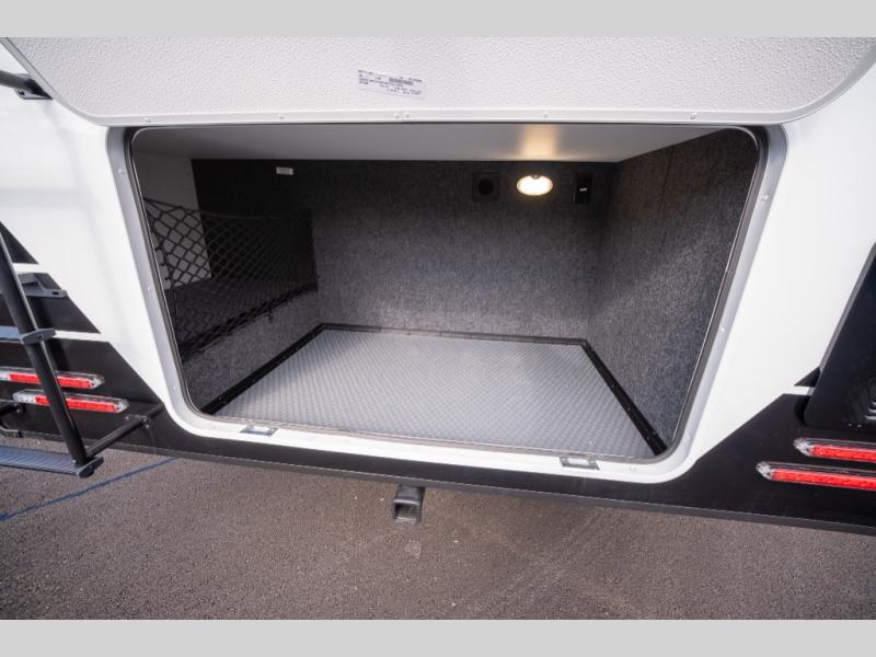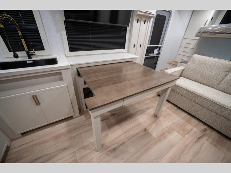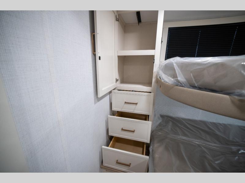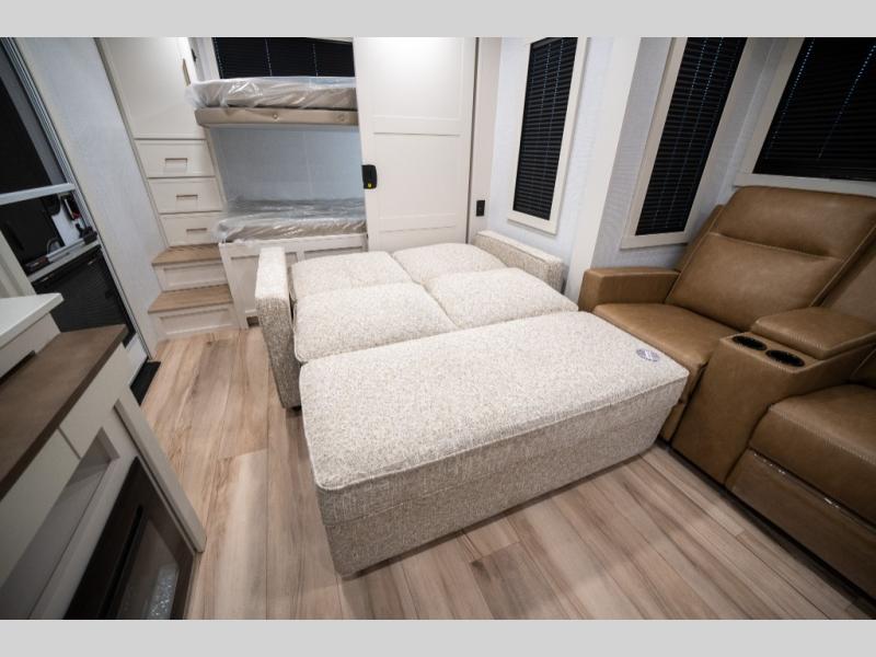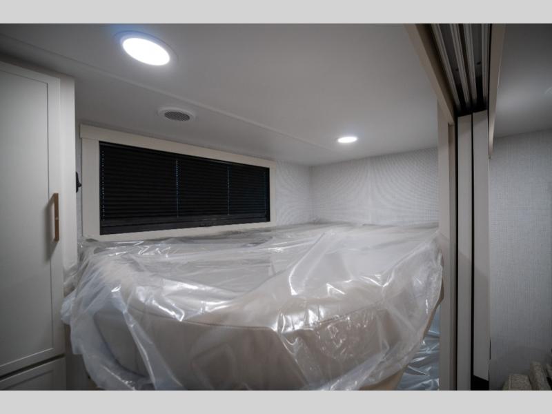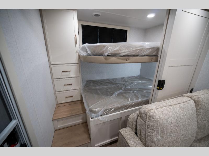 Grab the whole gang and head to the campground in this bunkhouse travel trailer! The 48" x 74" bunks can sleep two to four, and there is a floor to ceiling storage cabinet with drawers, a top bunk window, outlets and USB ports, plus double space-saving pocket doors. Up front you'll find the master bedroom with a 66" x 80" king bed and a MaxSpace Split-Level Wardrobe, TV prep, your own exterior entry door, plus quick access to the walk-thru bath. Everyone can meet in the combined kitchen and living room to relax on the theater seating or tri-fold sofa, and there is pull-out dining table with a drawer and a window above for great outdoor views. The outside is just as accommodating as the inside with its exterior speakers, LED chassis lighting, rear storage compartment with dual access doors, and exterior 12V refrigerator for cold drinks!