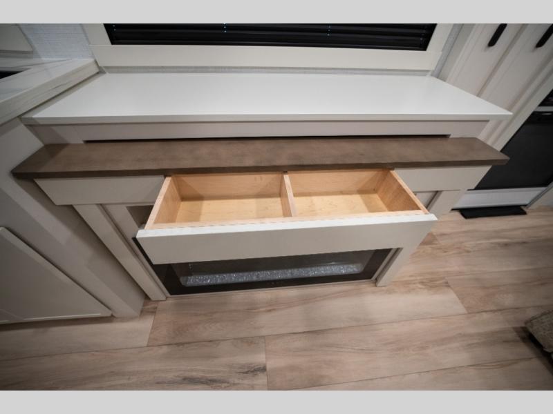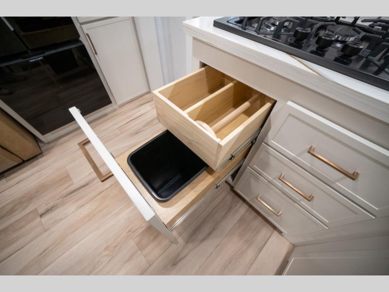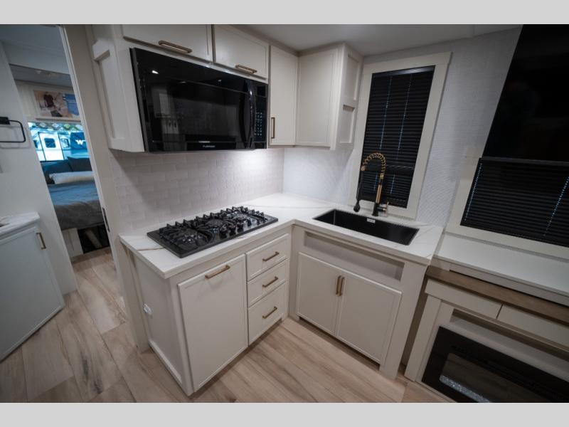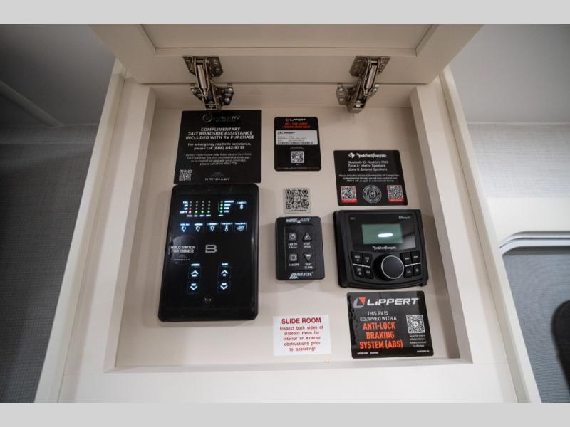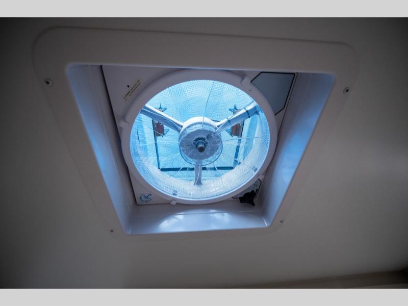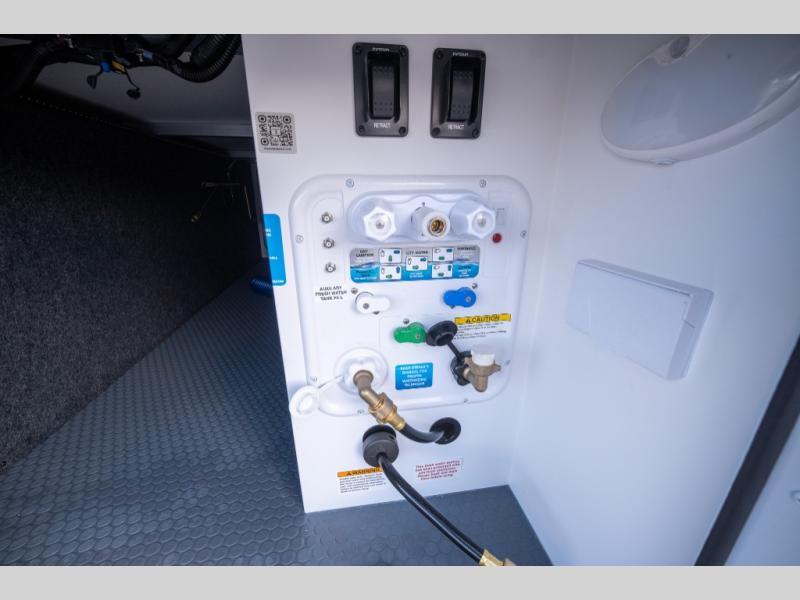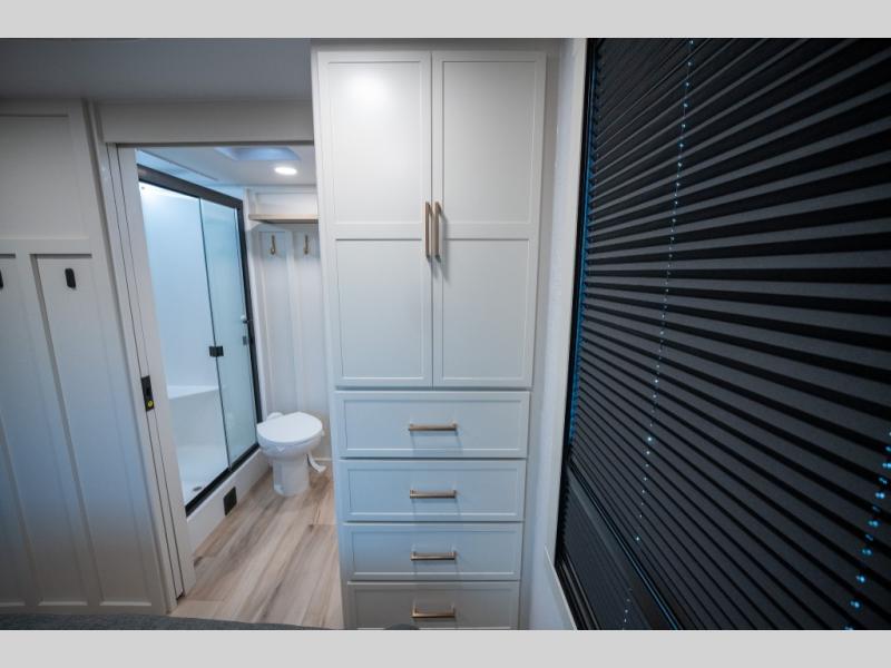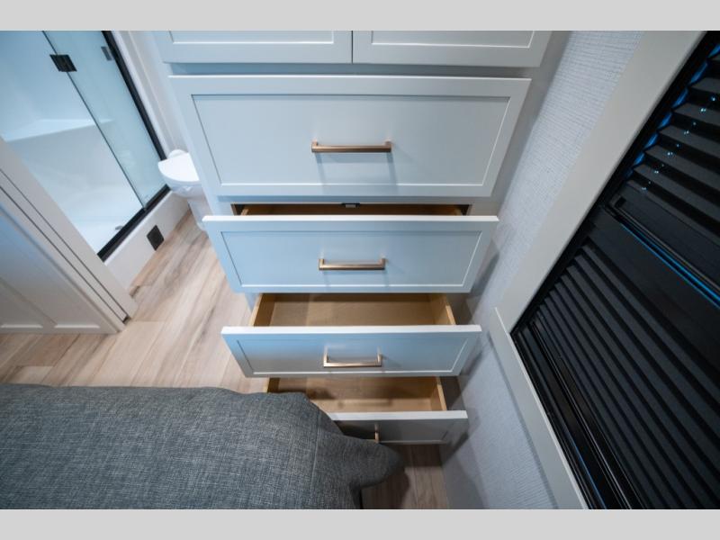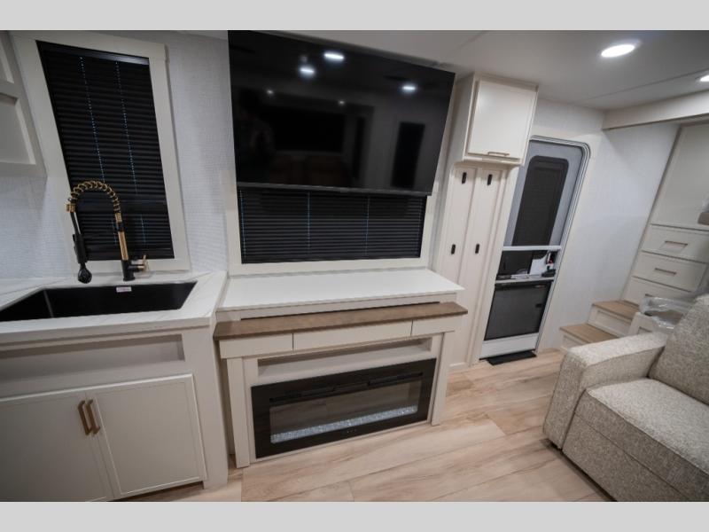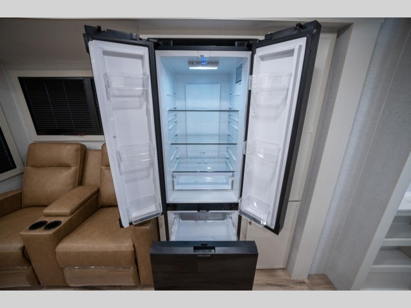Grab the whole gang and head to the campground in this bunkhouse travel trailer! The 48" x 74" bunks can sleep two to four, and there is a floor to ceiling storage cabinet with drawers, a top bunk window, outlets and USB ports, plus double space-saving pocket doors. Up front you'll find the master bedroom with a 66" x 80" king bed and a MaxSpace Split-Level Wardrobe, TV prep, your own exterior entry door, plus quick access to the walk-thru bath. Everyone can meet in the combined kitchen and living room to relax on the theater seating or tri-fold sofa, and there is pull-out dining table with a drawer and a window above for great outdoor views. The outside is just as accommodating as the inside with its exterior speakers, LED chassis lighting, rear storage compartment with dual access doors, and exterior 12V refrigerator for cold drinks!