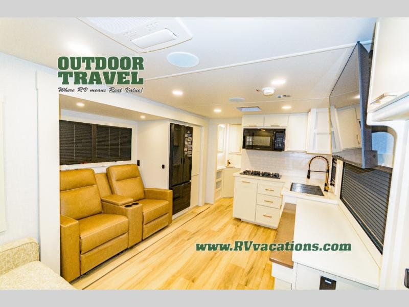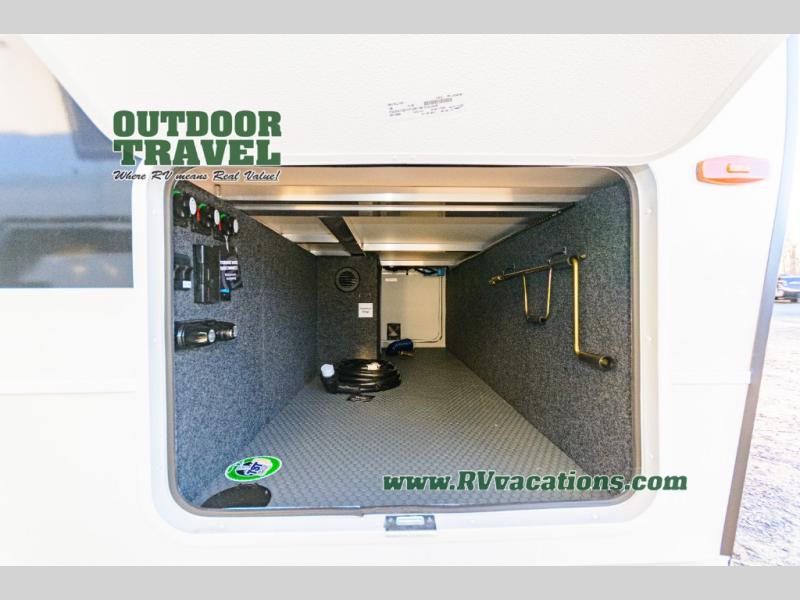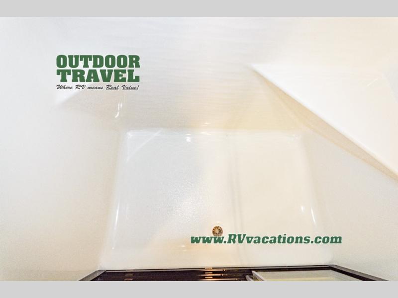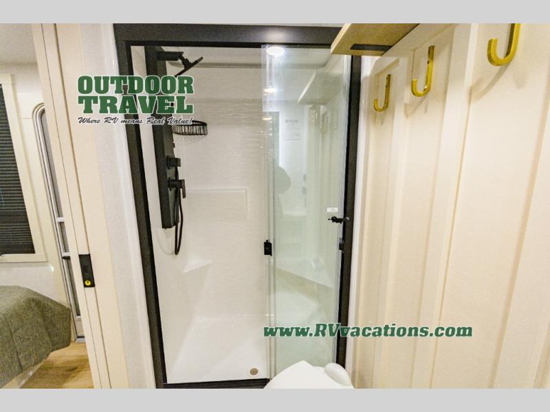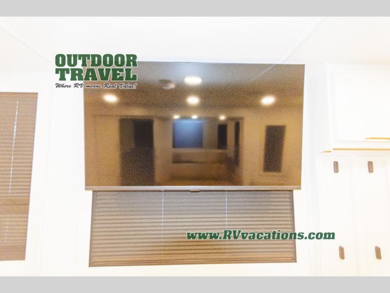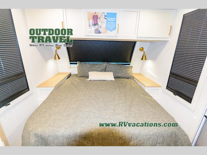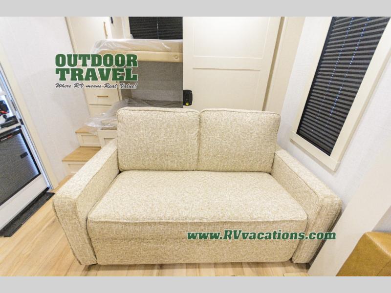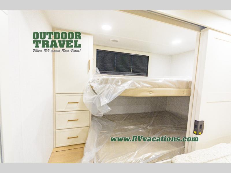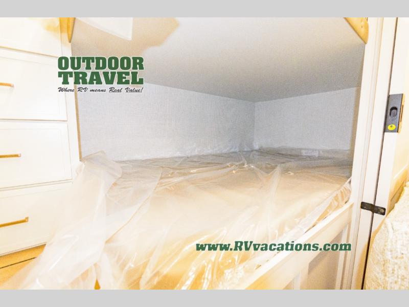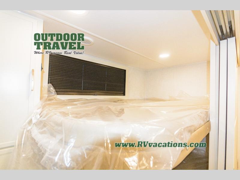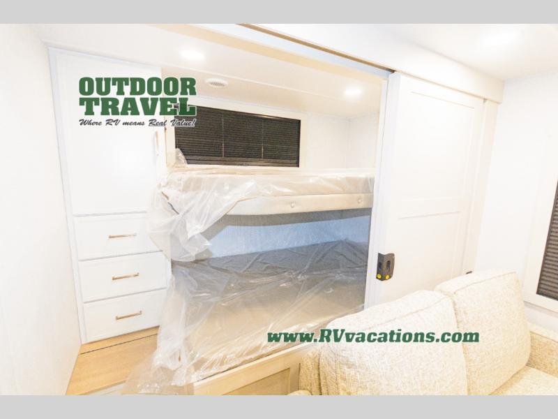 Grab the whole gang and head to the campground in this bunkhouse travel trailer! The 48" x 74" bunks can sleep two to four, and there is a floor to ceiling storage cabinet with drawers, a top bunk window, outlets and USB ports, plus double space-saving pocket doors. Up front you'll find the master bedroom with a 66" x 80" king bed and a MaxSpace Split-Level Wardrobe, TV prep, your own exterior entry door, plus quick access to the walk-thru bath. Everyone can meet in the combined kitchen and living room to relax on the theater seating or tri-fold sofa, and there is pull-out dining table with a drawer and a window above for great outdoor views. The outside is just as accommodating as the inside with its exterior speakers, LED chassis lighting, rear storage compartment with dual access doors, and exterior 12V refrigerator for cold drinks!